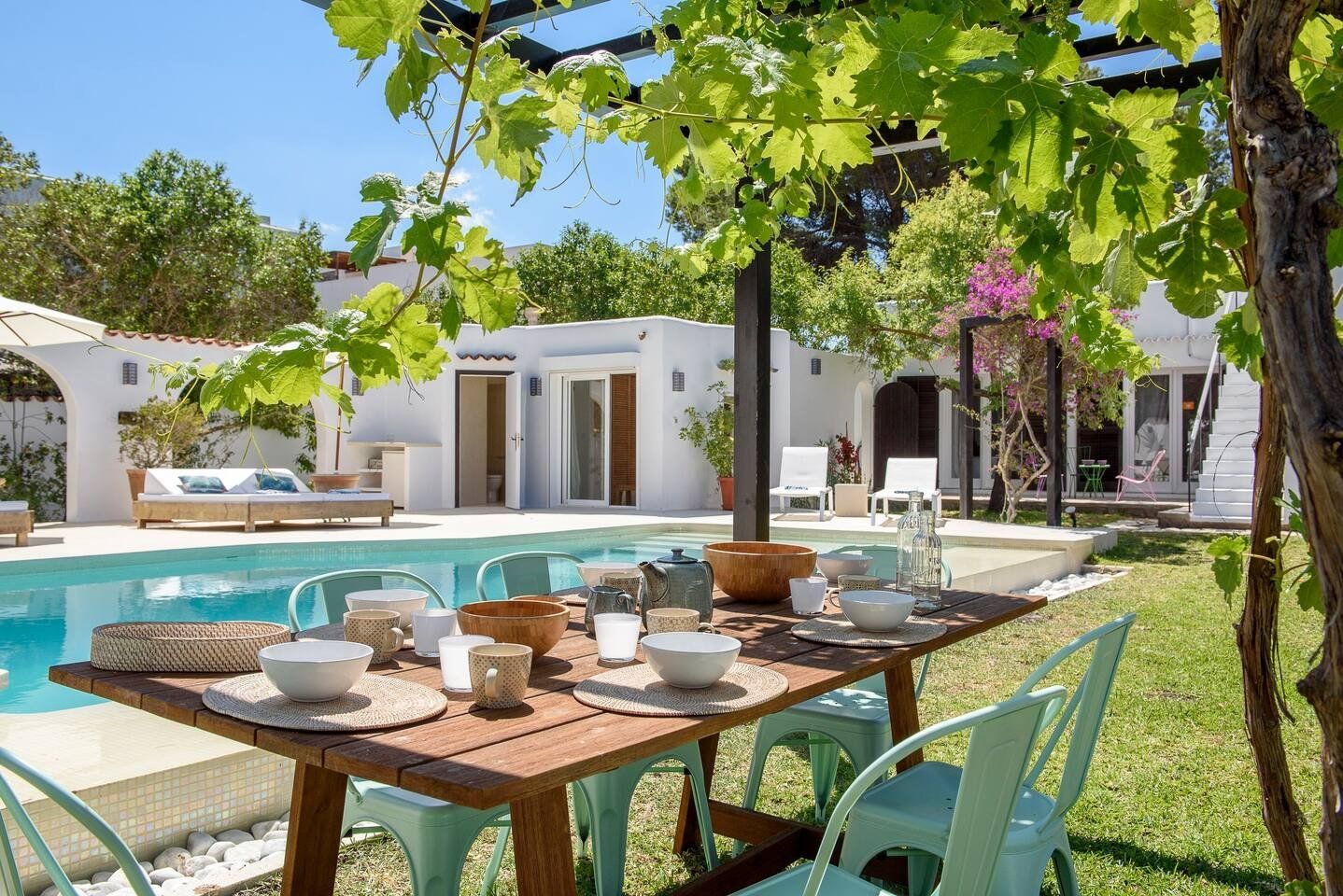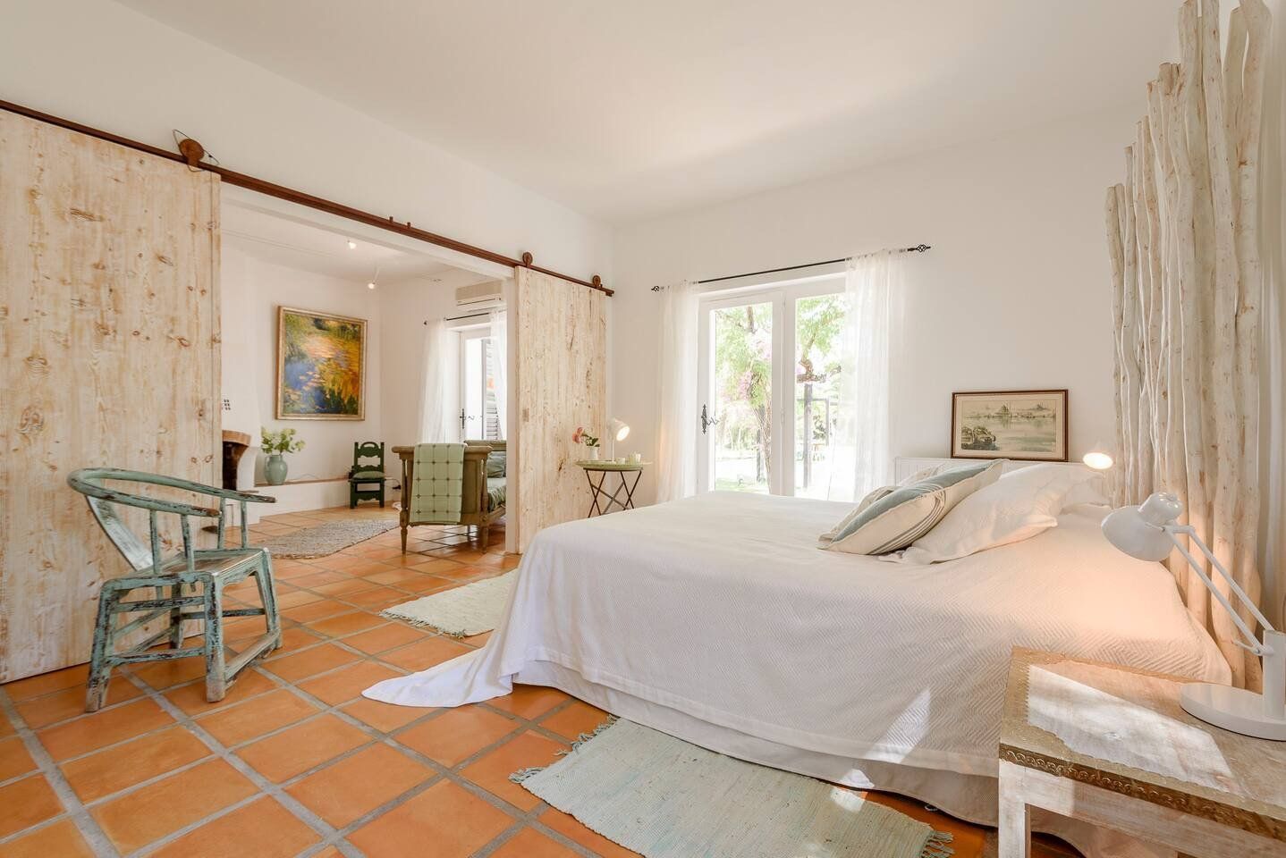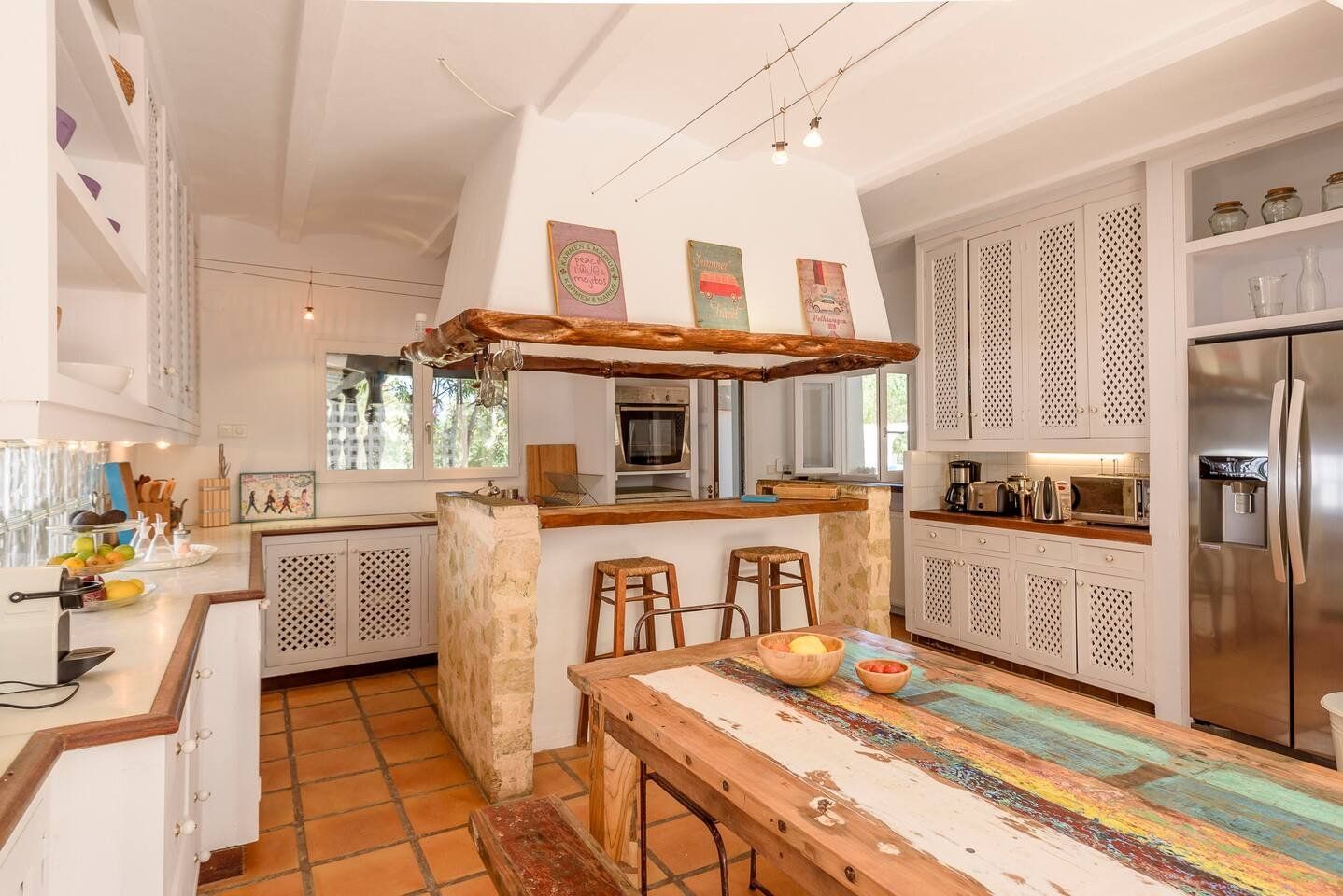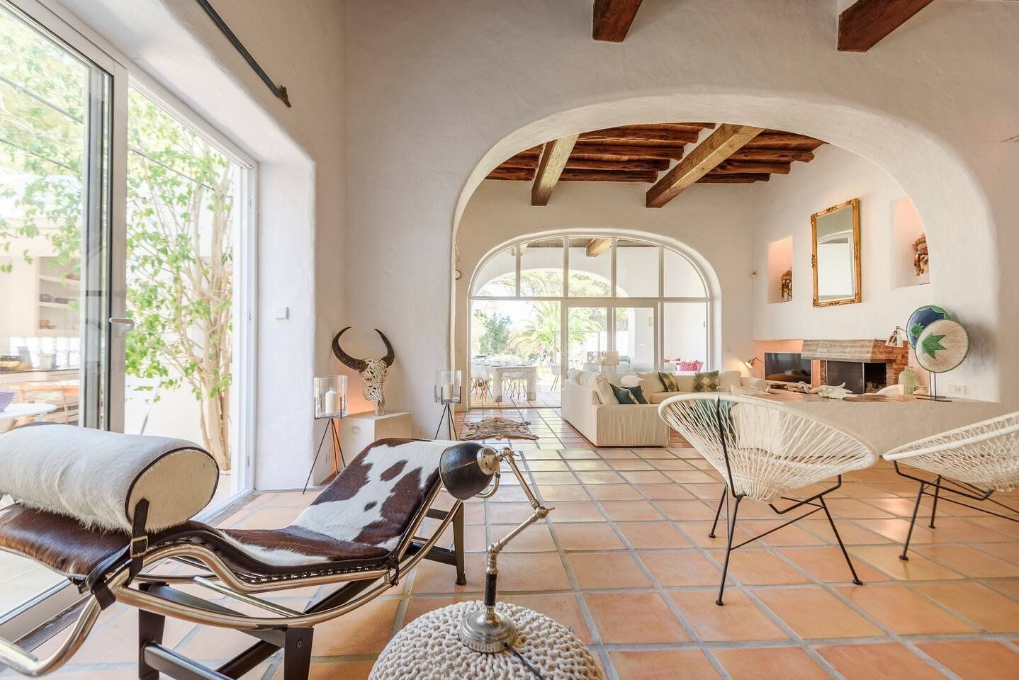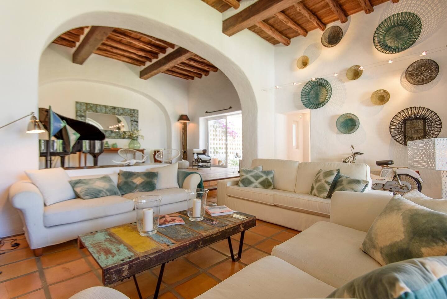 There's movie-quality magic to this secluded hacienda in Ibiza, from the interiors worthy of a magazine to enough entertainment to keep all members of your party engaged. We noticed the architecture first, with native Sabina wood ceilings and arched white walls sheltering eclectic pieces like a cowhide chair and Native American headdresses. For the performers in your group, there's a grand piano in the living area – or plug a phone into the sound system to play more professional beats. Bedrooms each deliver a sense of serenity, courtesy of pastel colour schemes and reclaimed wooden furniture. But you won't want to hang out alone for too long – the infinity pool is surrounded by daybeds, while the built-in stone barbecue has carved-stone seats for everyone to keep an eye on the action. To amp up the energy, there are pétanque courts, table tennis and foosball tables and a basketball hoop. Glimpses of the sea are visible from the roof terrace, or you can jump on one of the home's bikes for a trip to the shore before heading back for sundowners on the wraparound terrace.