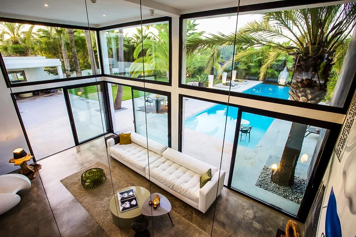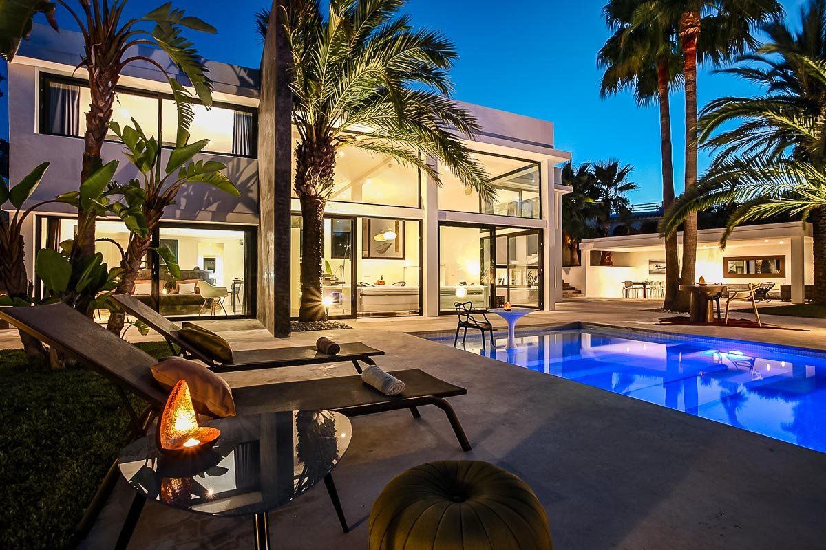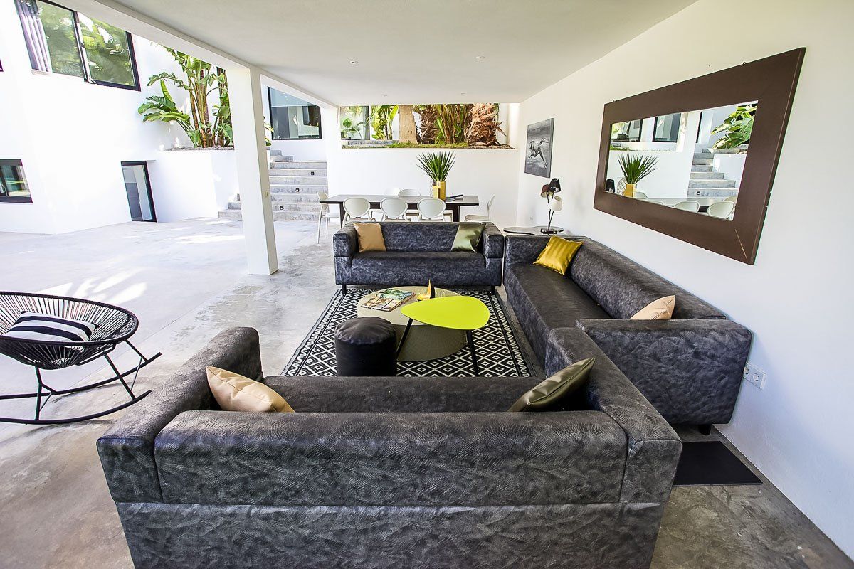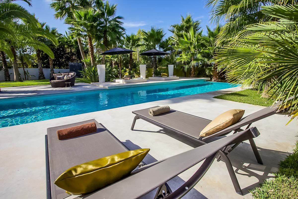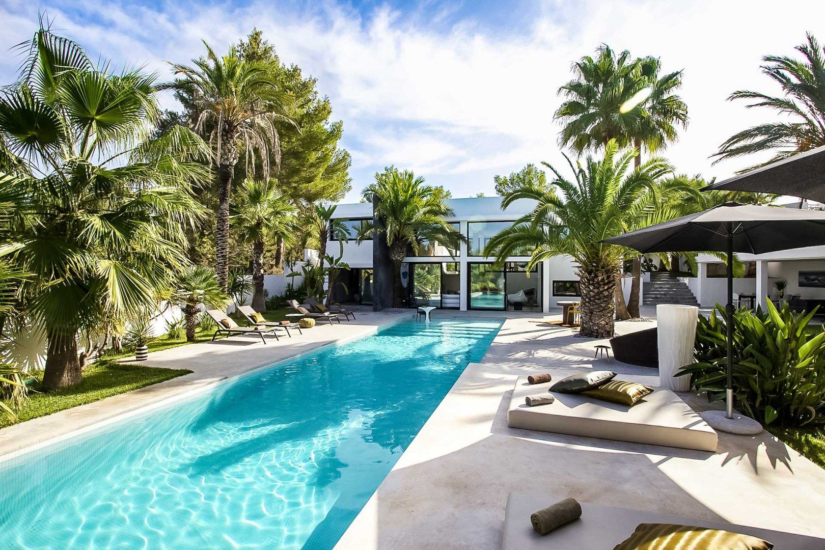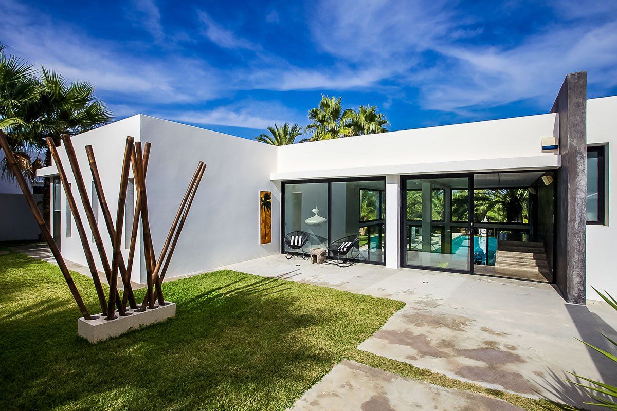 Stepping into the gated garden of this luxury vacation rental, with its lush lawns, palm trees and modern sculptures, feels like entering your own world. Steps lead down to an expansive terrace with a pool, plenty of loungers and daybeds, and a pool house with shaded al-fresco sitting and dining areas. You can use the property as an escape from the real world, or stay connected via the TV and Wi-Fi.