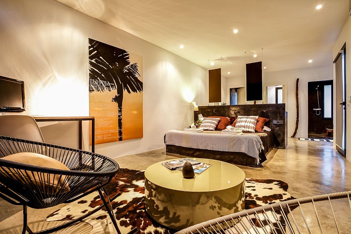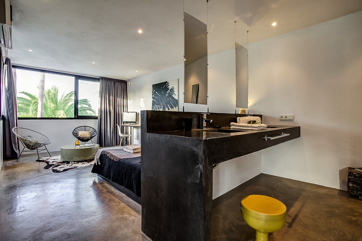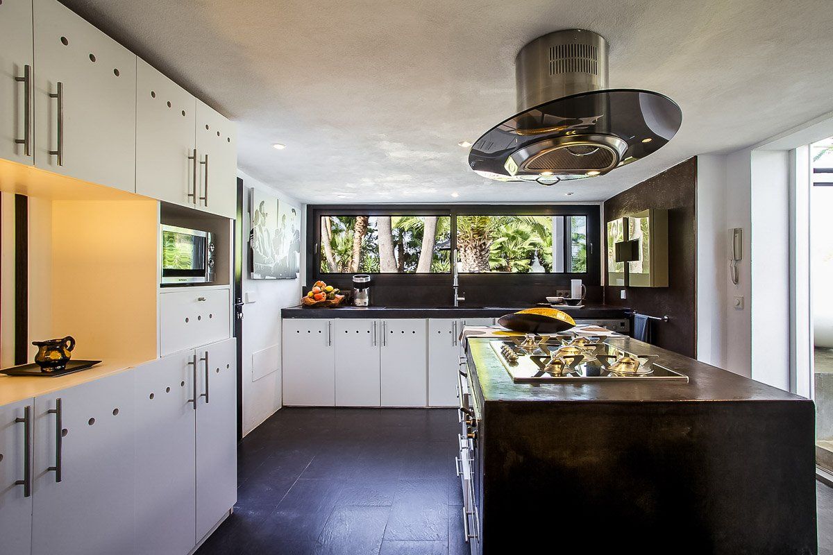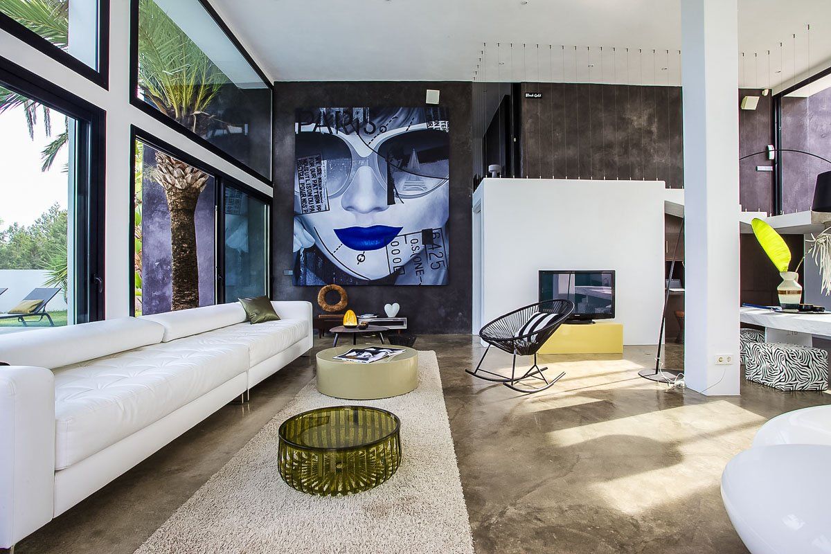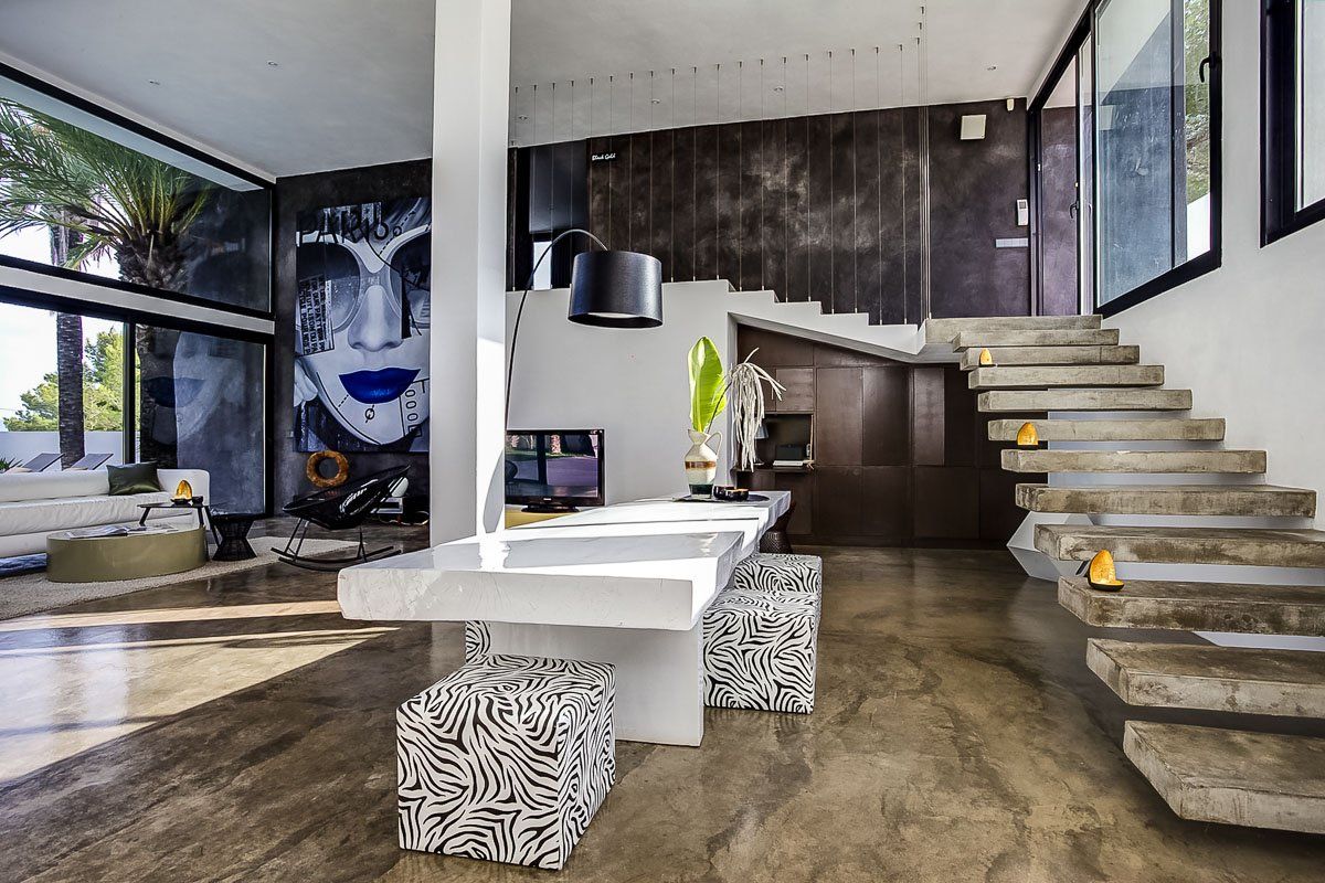 Ultra-modern interiors give Zen a minimalist look, but add a punch of personality with contemporary artwork. Glass doors and two-story windows make the chic living room feel like part of the terrace, as do polished concrete floors and clean-lined furnishings. The fully equipped kitchen, appointed in high-contrast black and white, makes it easy to prep gourmet meals on state-of-the-art appliances, and the formal dining area makes serving them a special occasion.