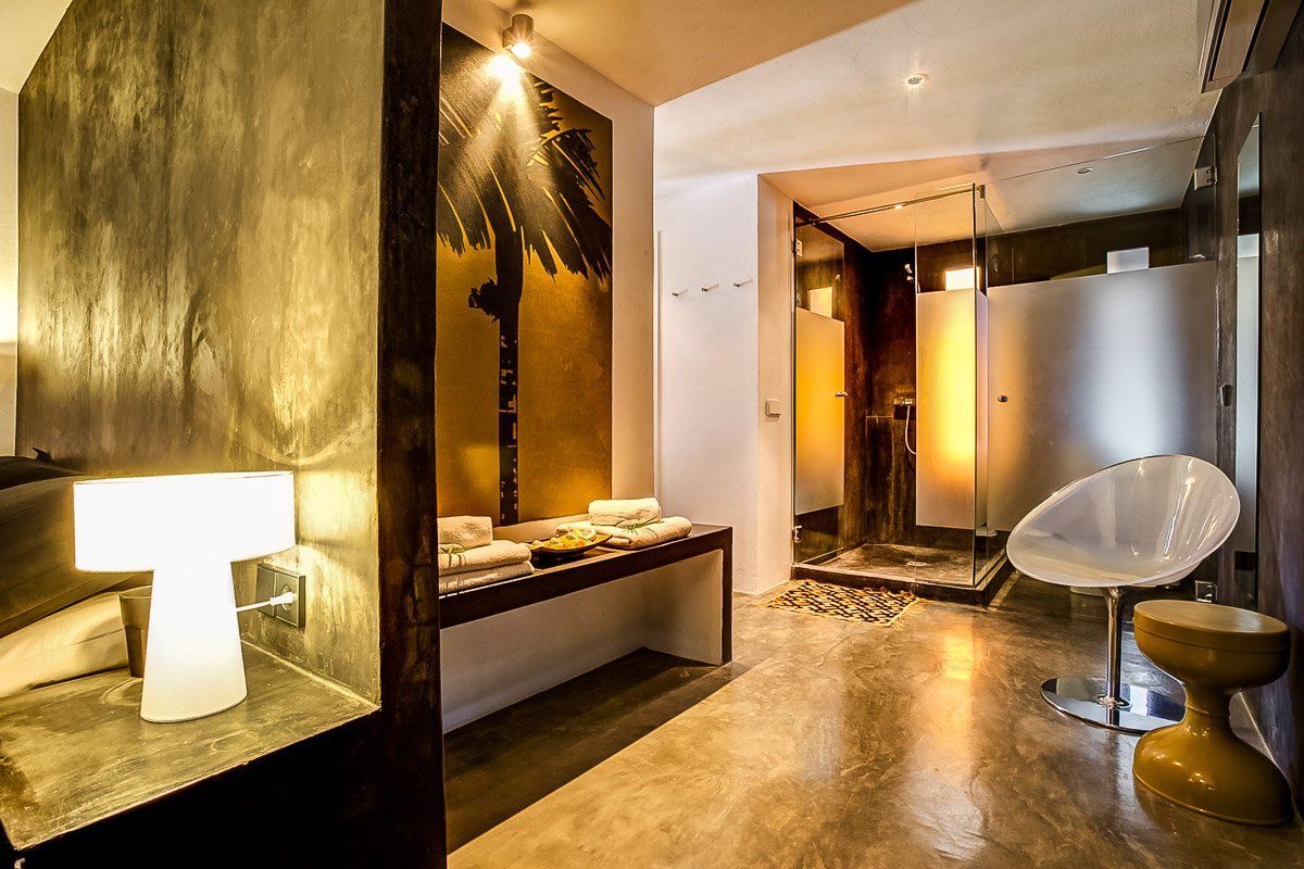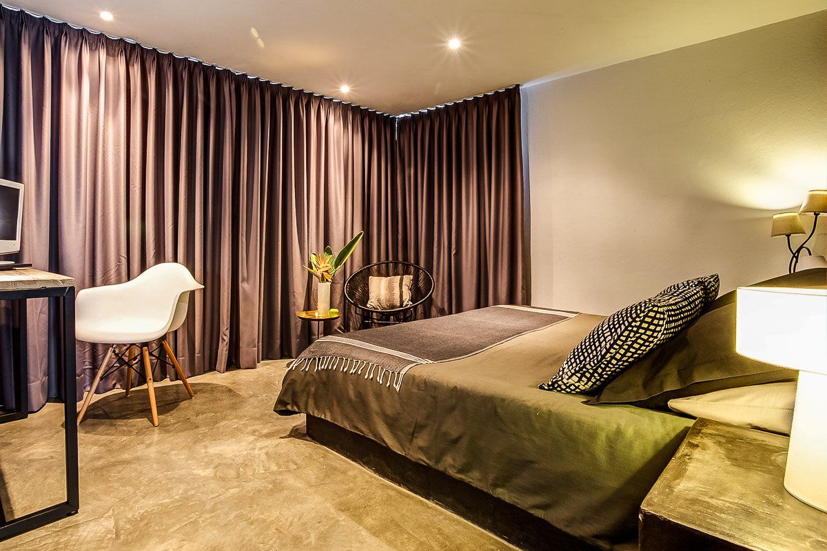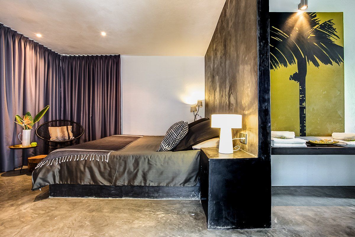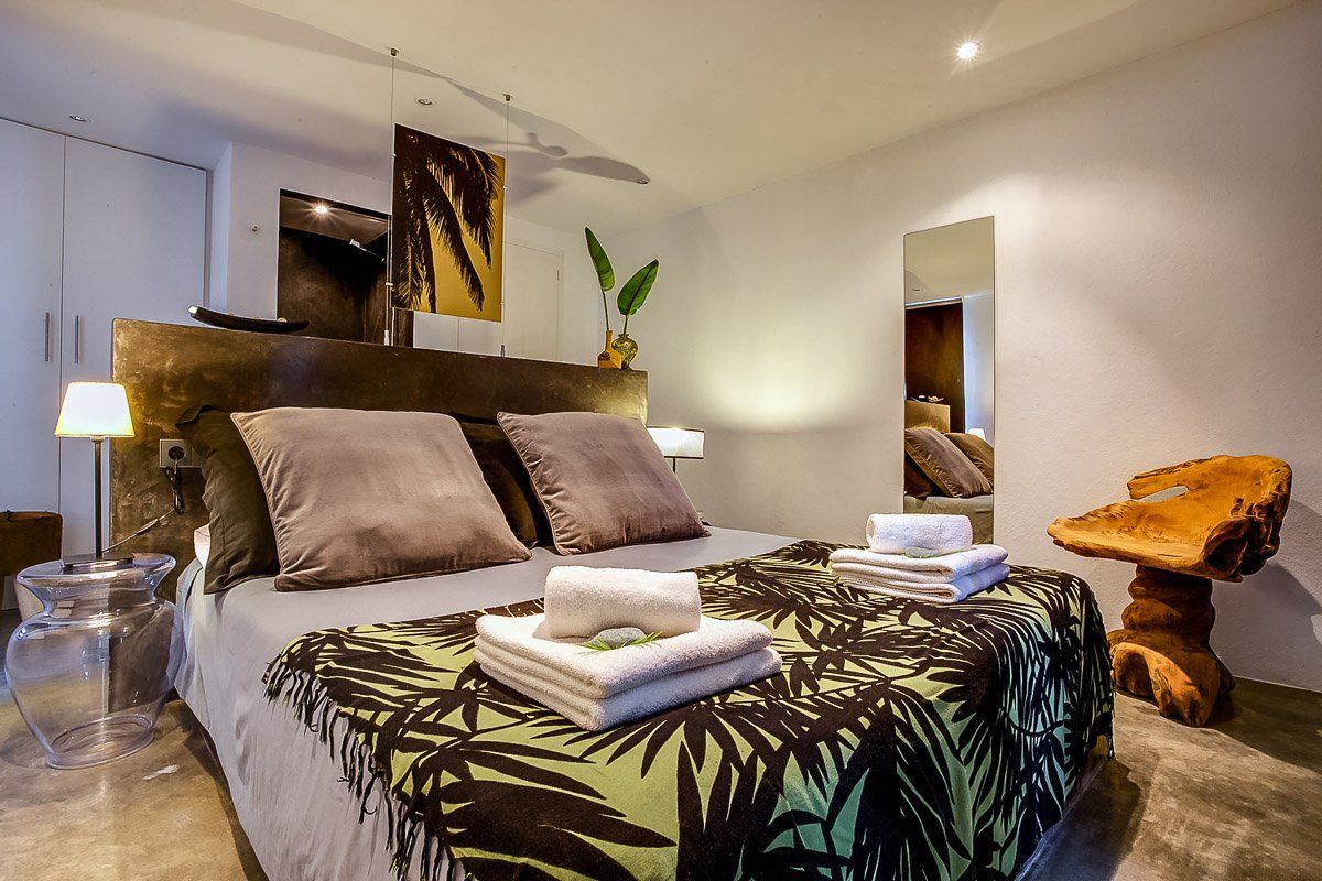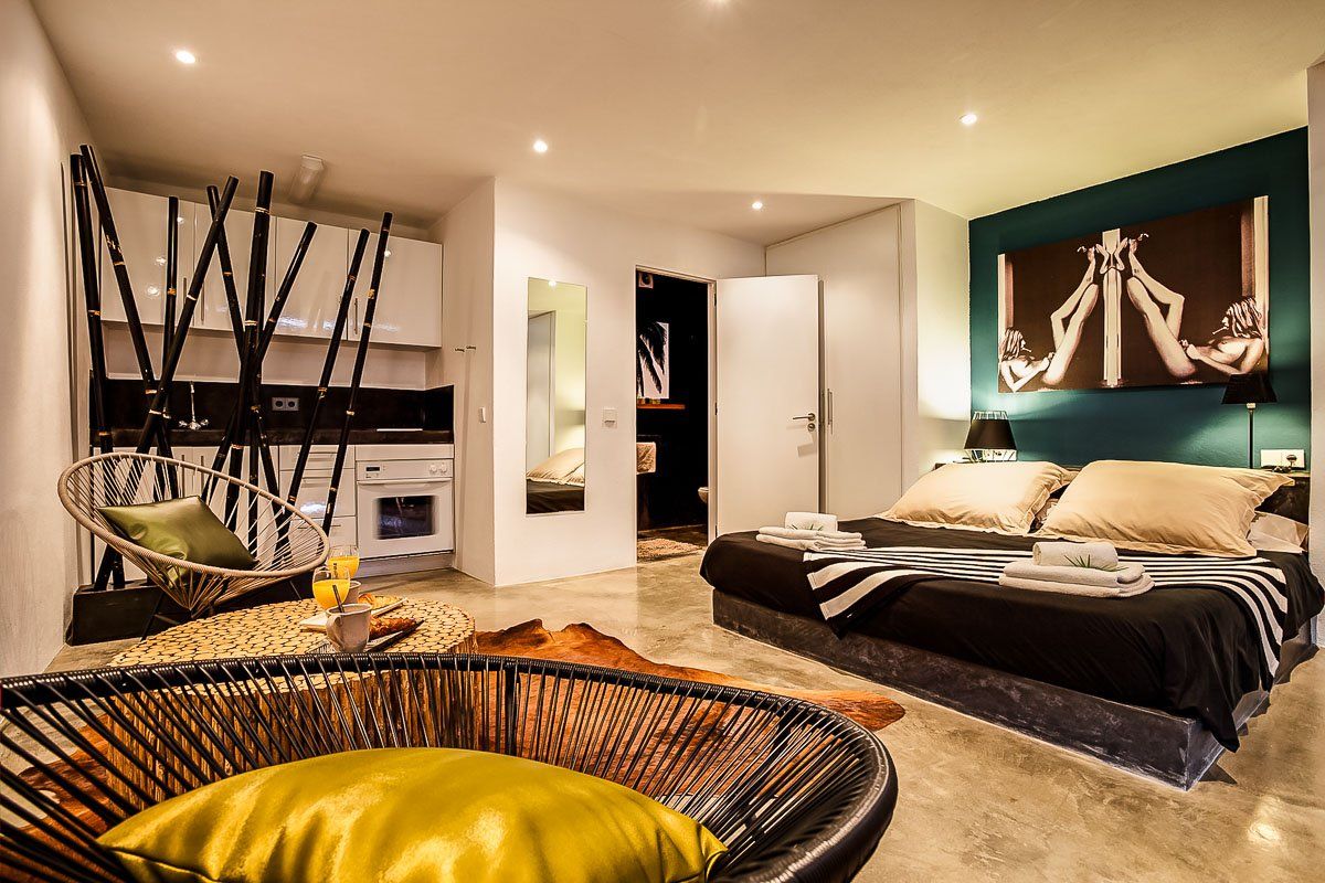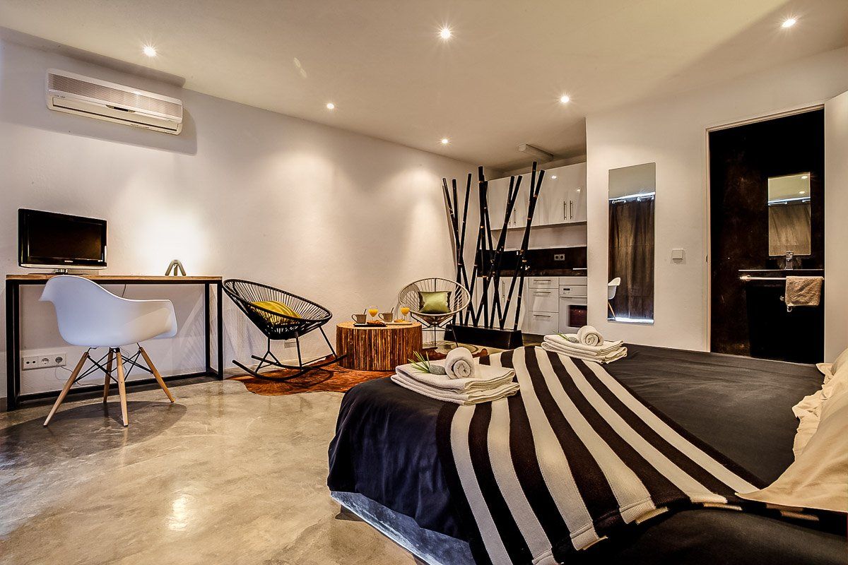 Ultra-modern interiors give Zen a minimalist look, but add a punch of personality with contemporary artwork. Glass doors and two-story windows make the chic living room feel like part of the terrace, as do polished concrete floors and clean-lined furnishings. The fully equipped kitchen, appointed in high-contrast black and white, makes it easy to prep gourmet meals on state-of-the-art appliances, and the formal dining area makes serving them a special occasion.