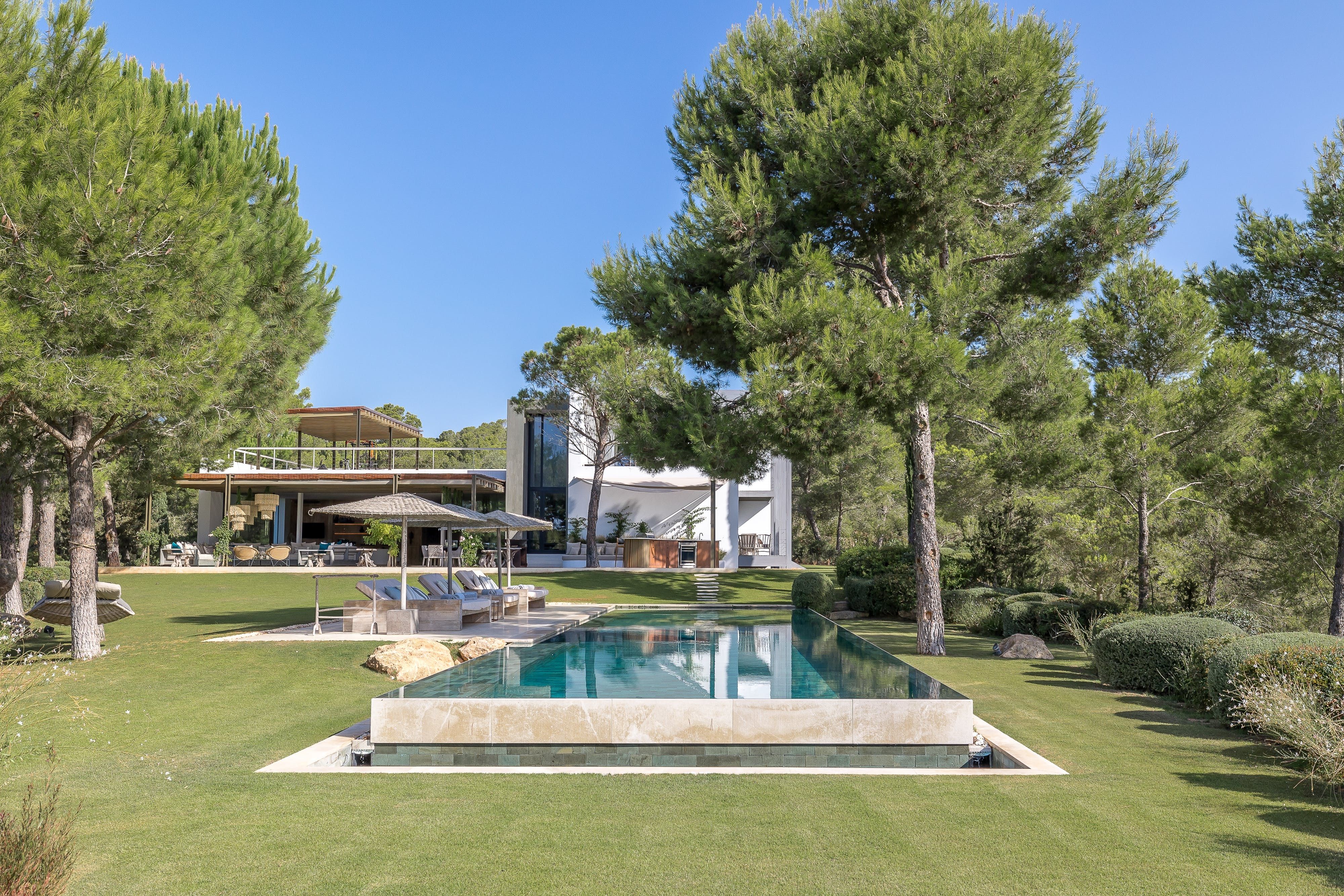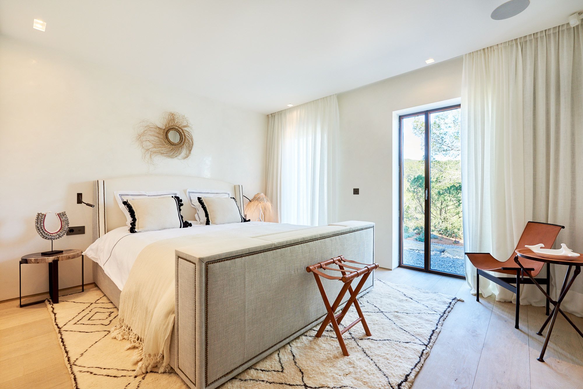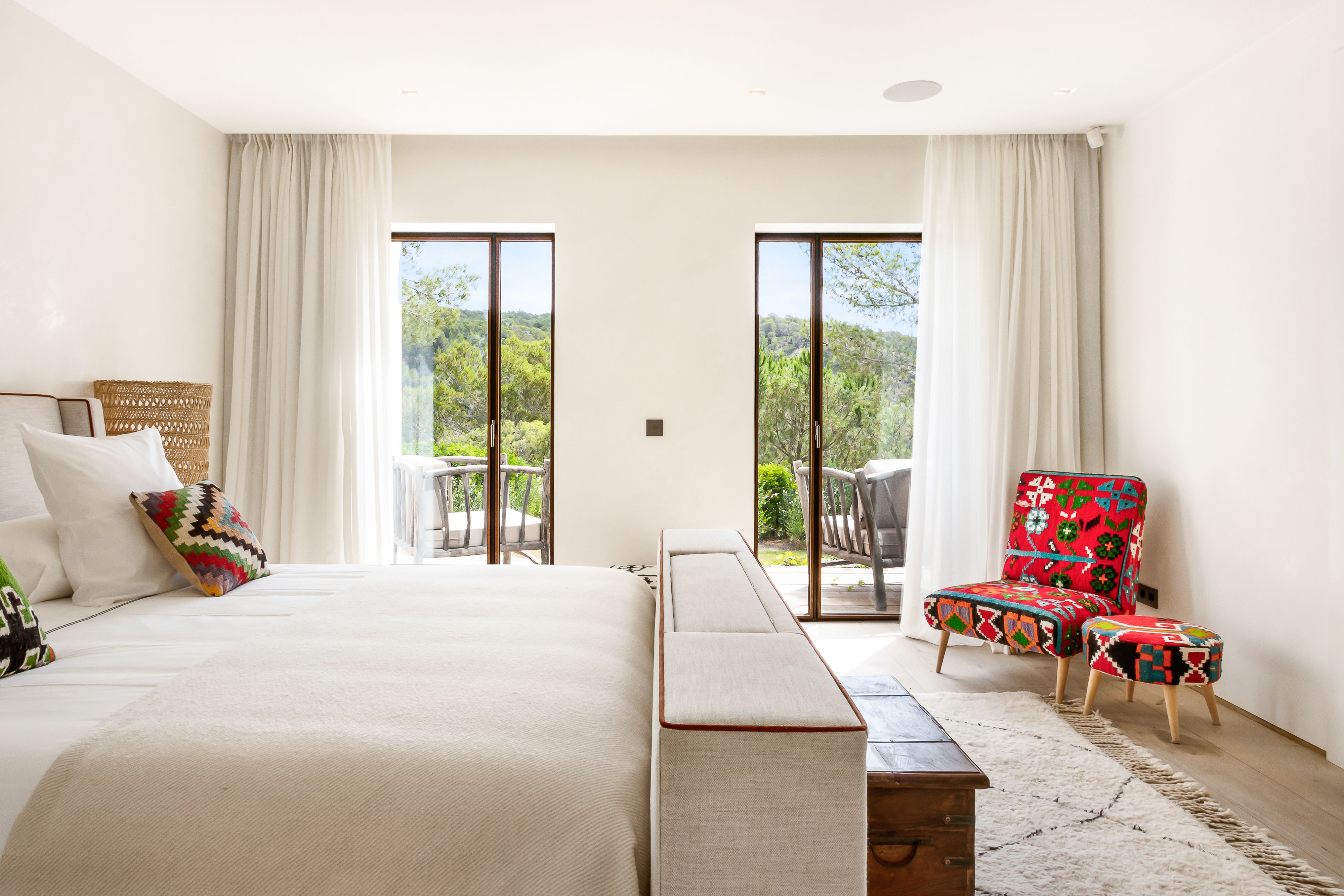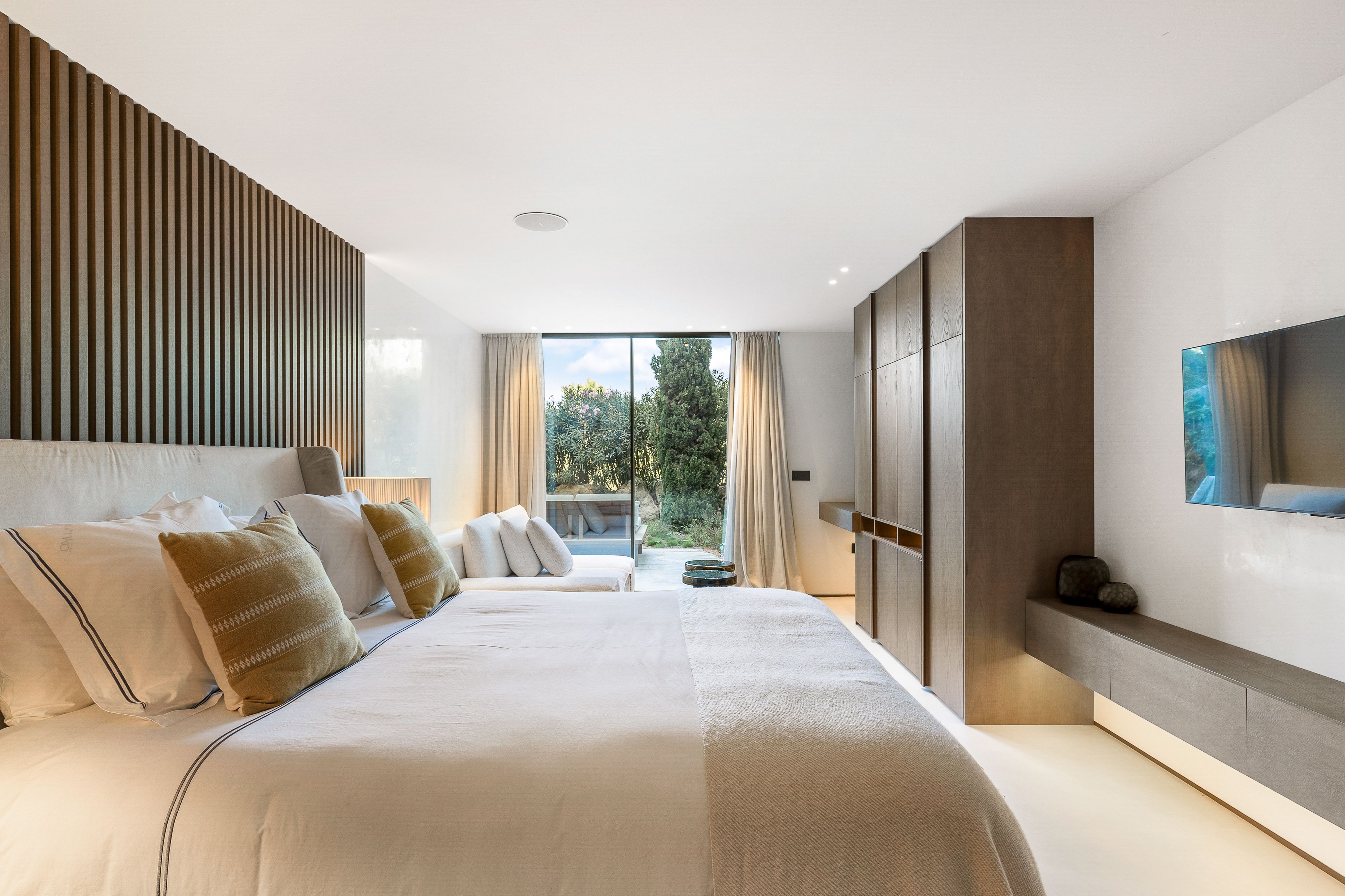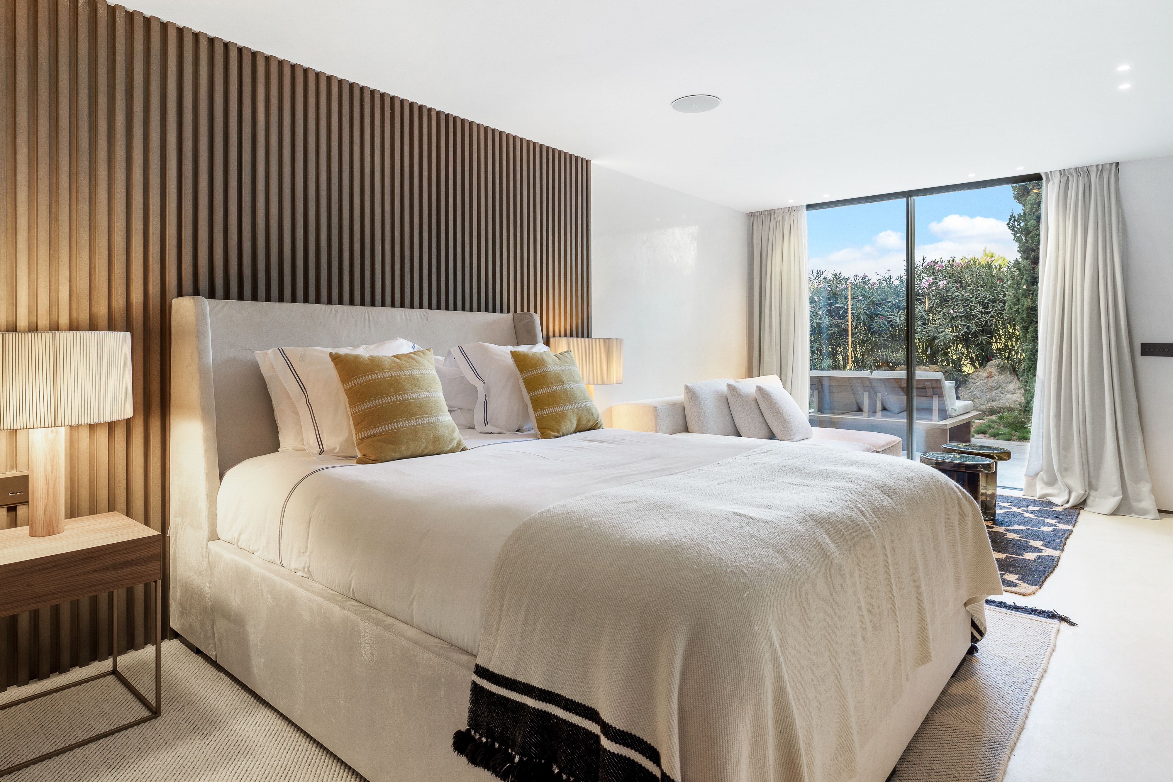 This villa completely embraces the Ibizan lifestyle. Days can be spent dipping in and out of the infinity pool, lounging on sprawling sofas across shaded patios, mixing up cocktails at the outdoor bar or playing games of petanque in the sun. Inside, there’s just as much to keep you entertained with a subterranean spa with treatment rooms in the basement, a dedicated home cinema and endless space to spread out. Bedrooms are as grand as hotel suites. Location-wise, you’re out in the peace and quiet, a twenty-minute walk from the day clubs of Cala Jondal beach.