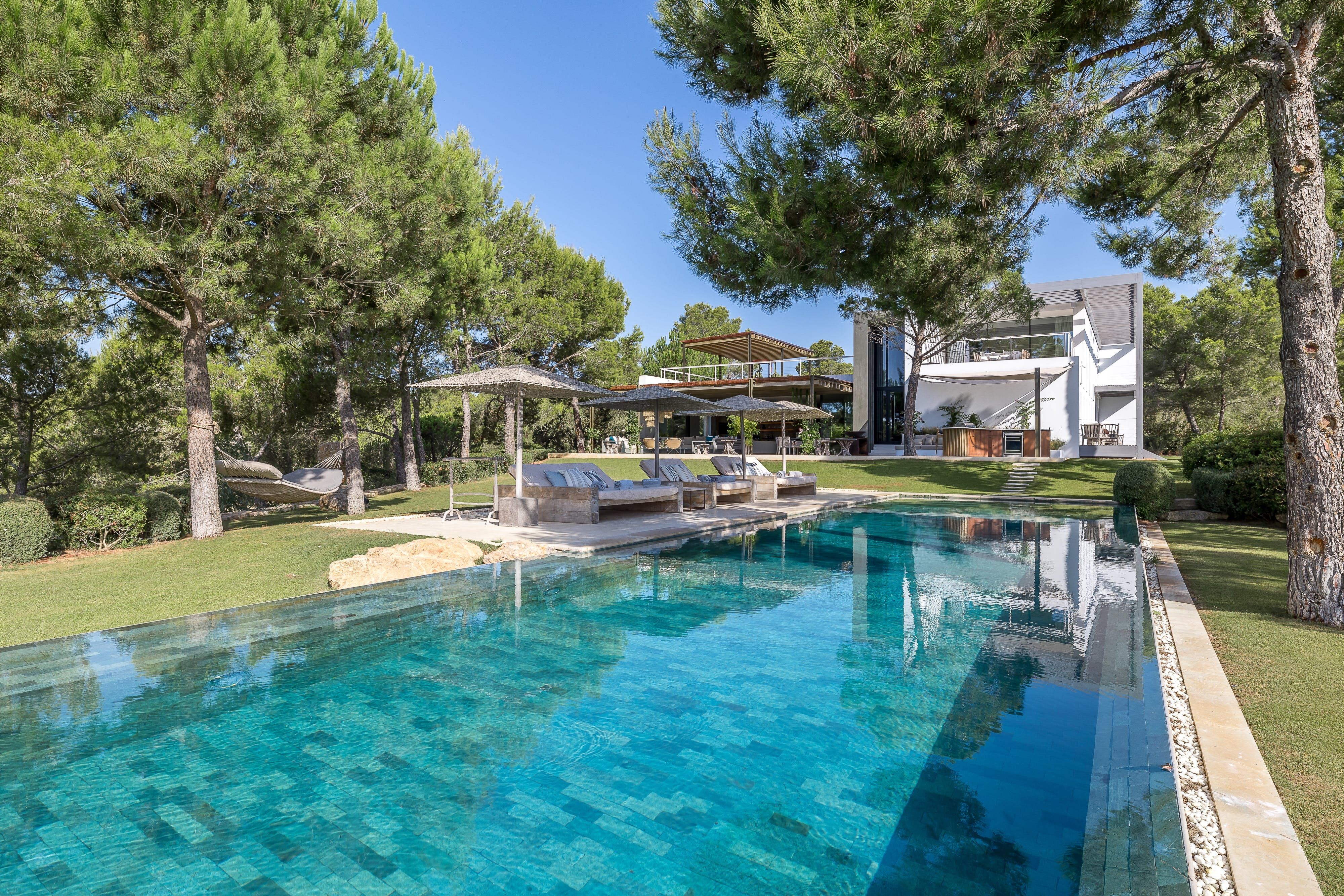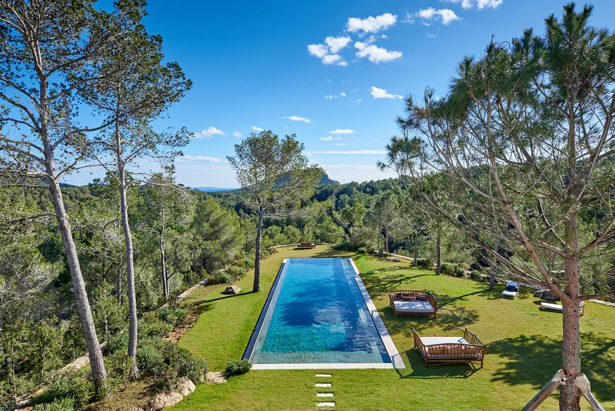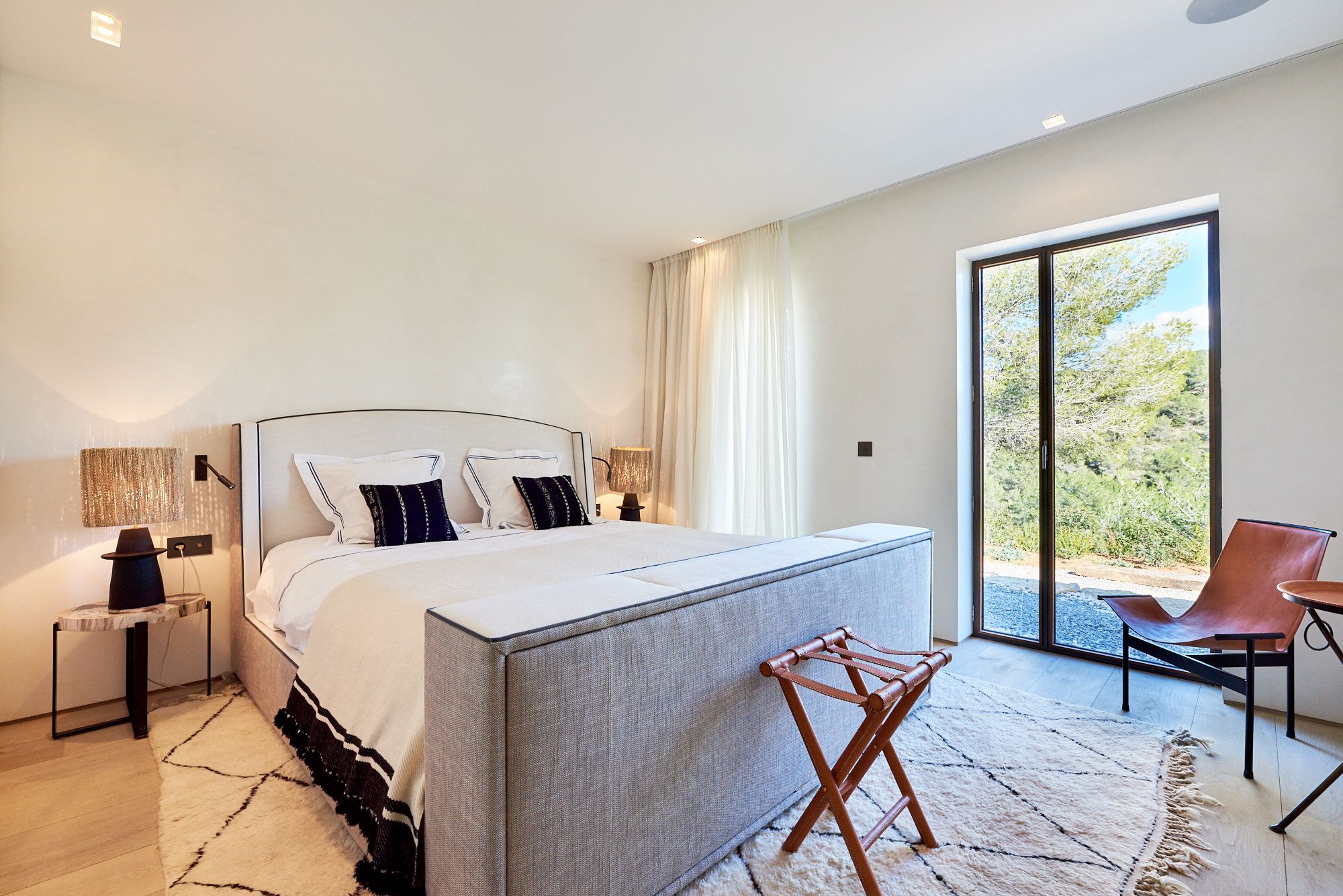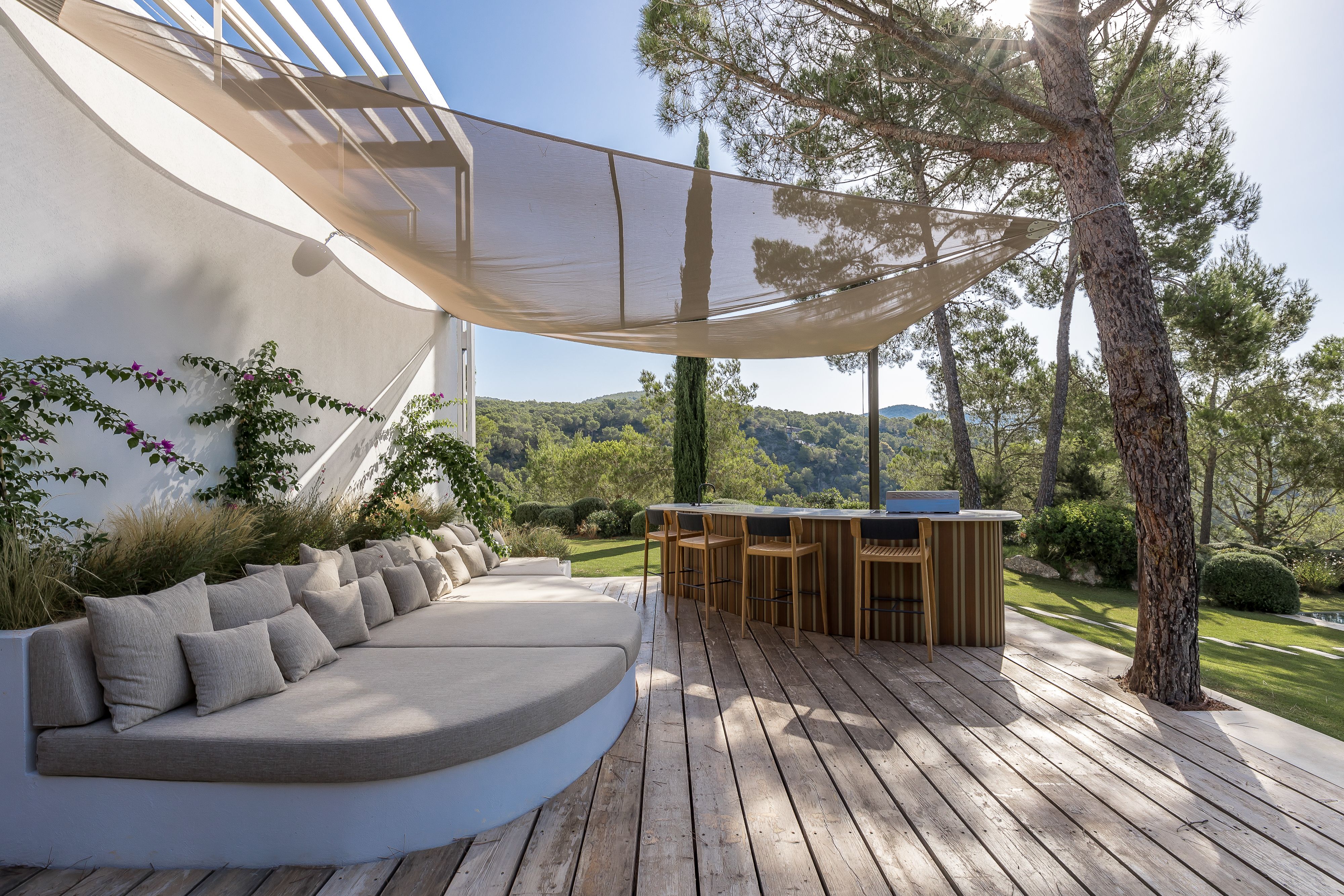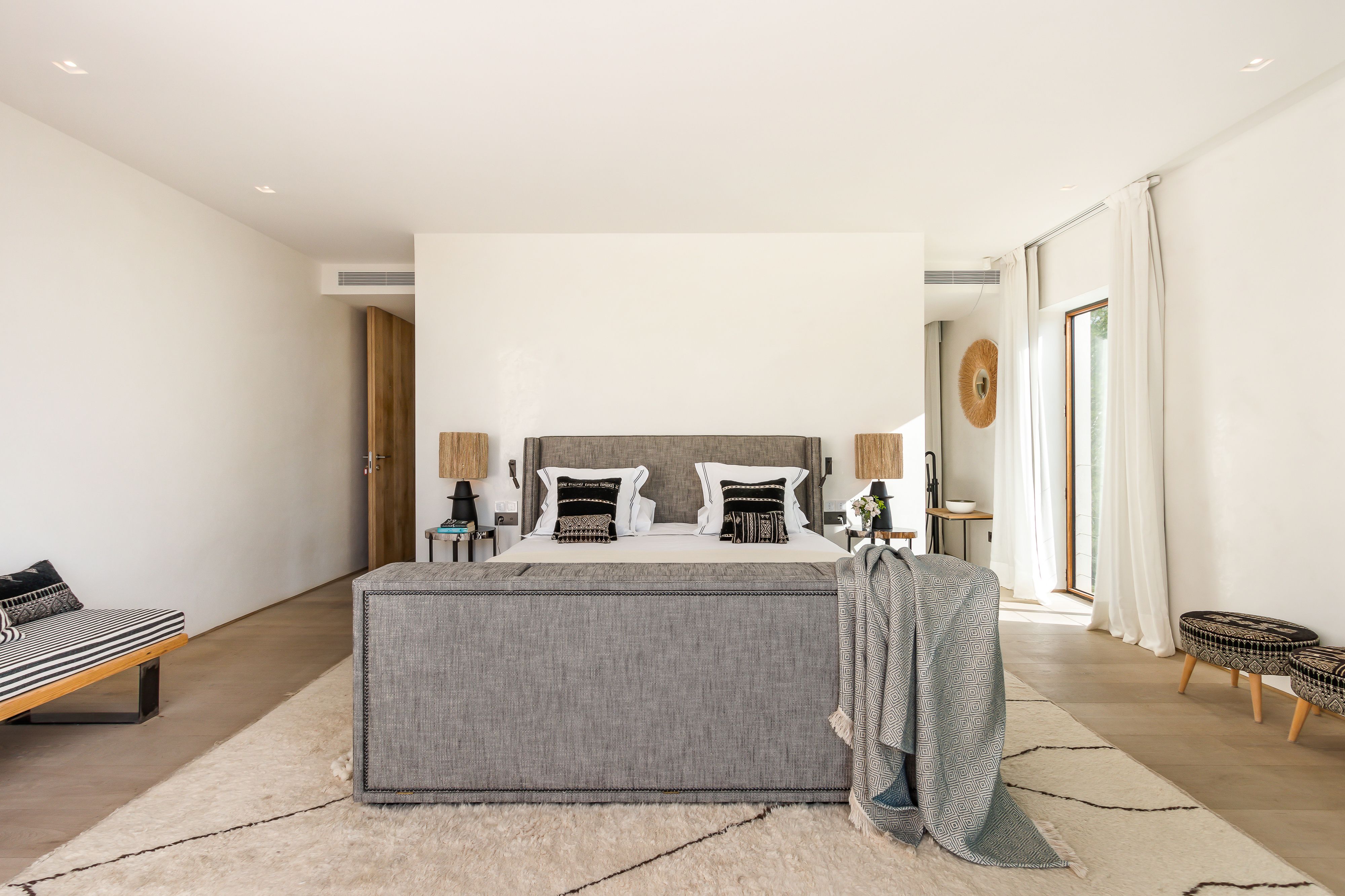 This villa completely embraces the Ibizan lifestyle. Days can be spent dipping in and out of the infinity pool, lounging on sprawling sofas across shaded patios, mixing up cocktails at the outdoor bar or playing games of petanque in the sun. Inside, there’s just as much to keep you entertained with a subterranean spa with treatment rooms in the basement, a dedicated home cinema and endless space to spread out. Bedrooms are as grand as hotel suites. Location-wise, you’re out in the peace and quiet, a twenty-minute walk from the day clubs of Cala Jondal beach.