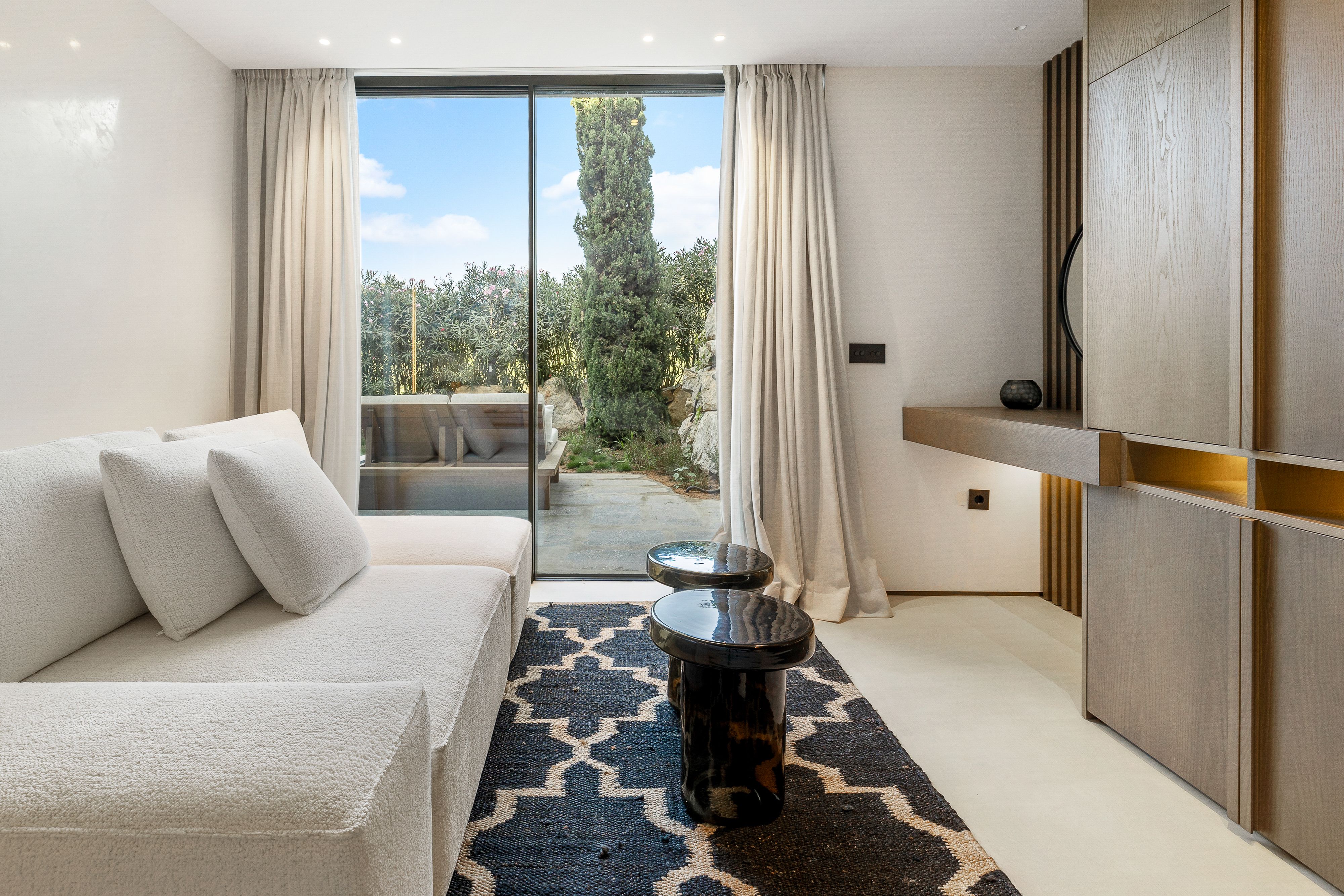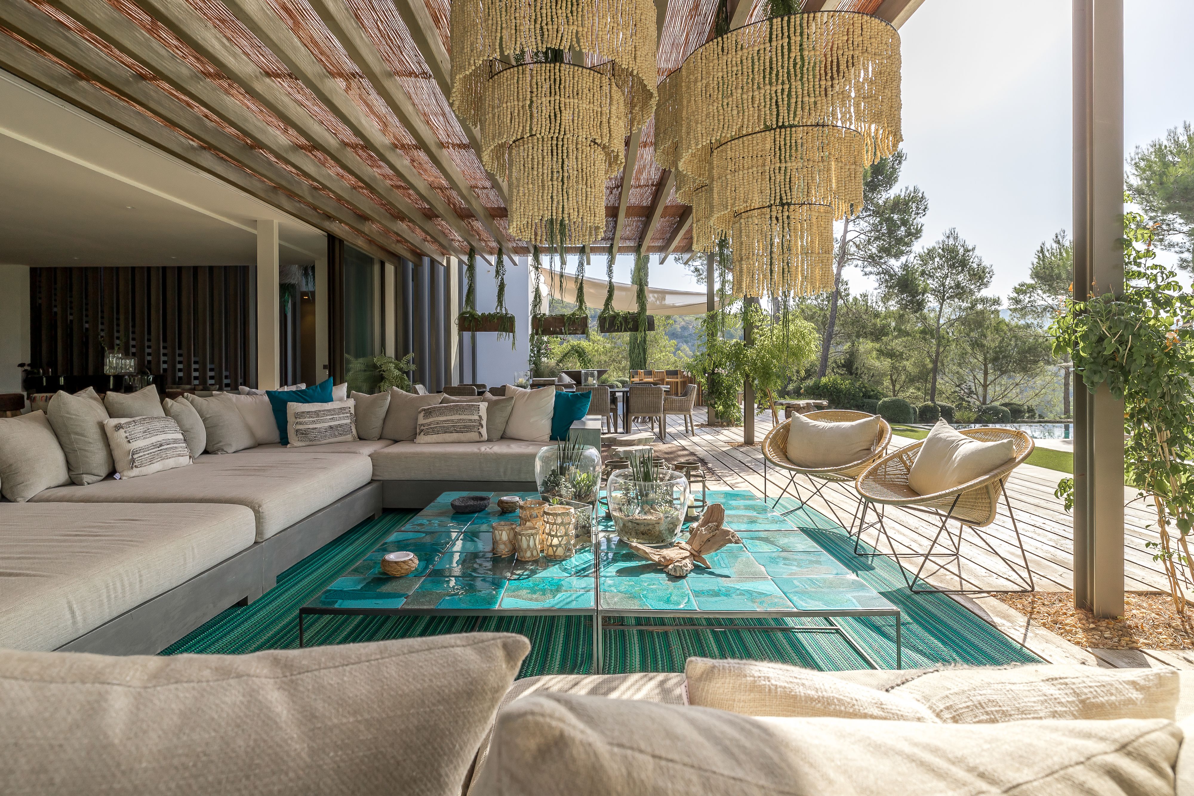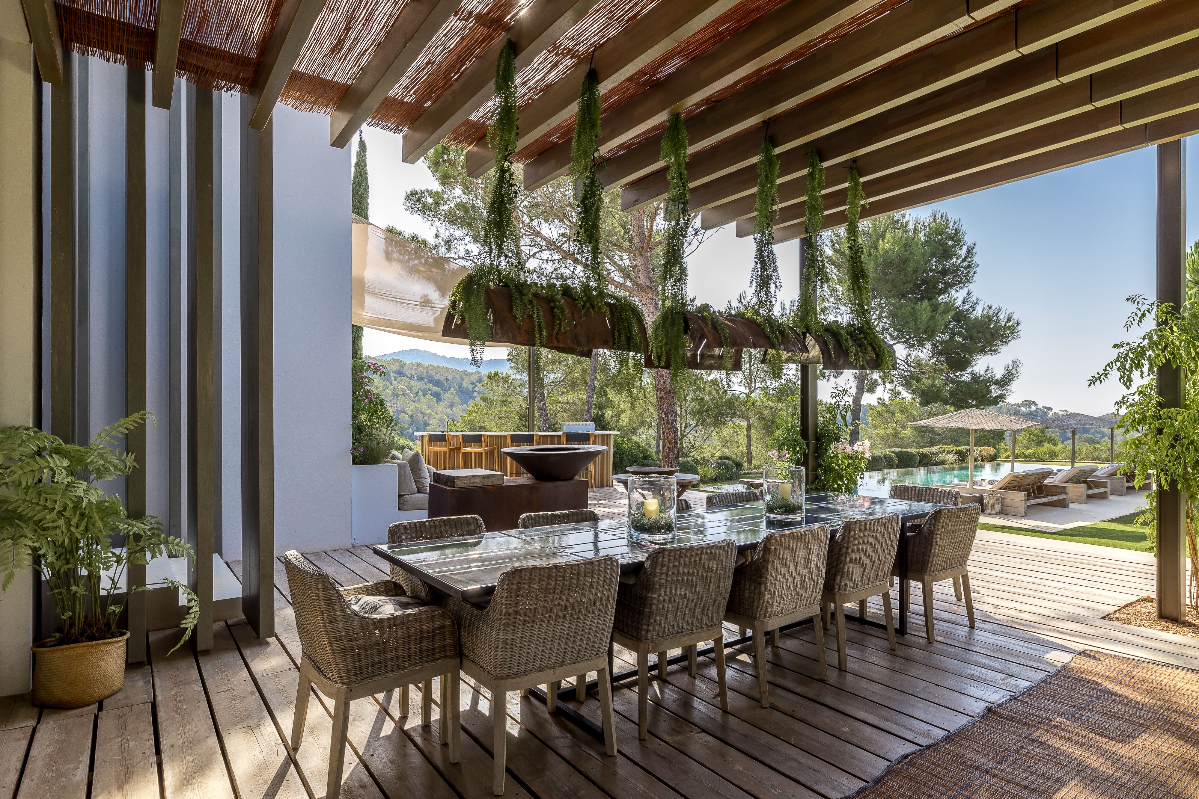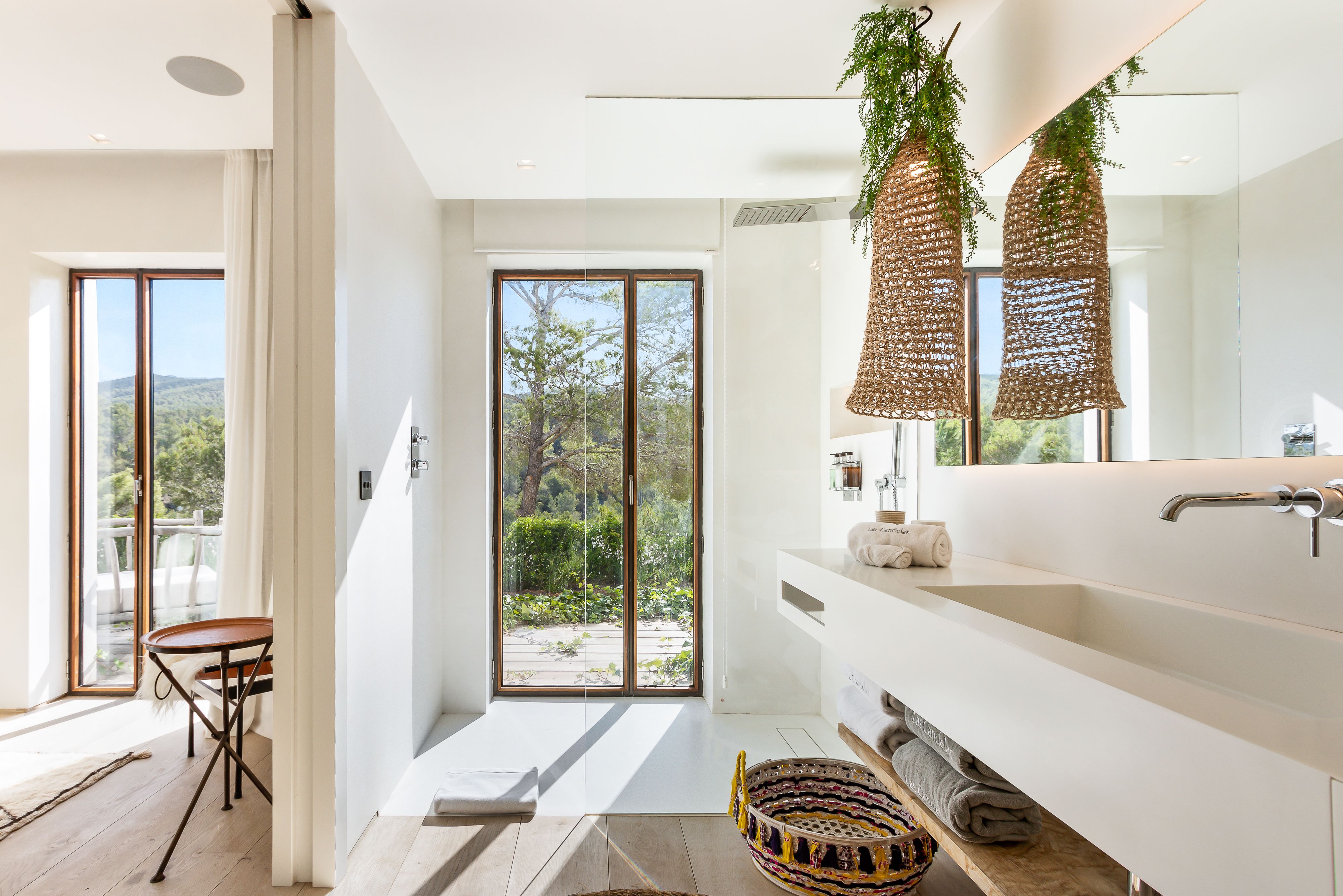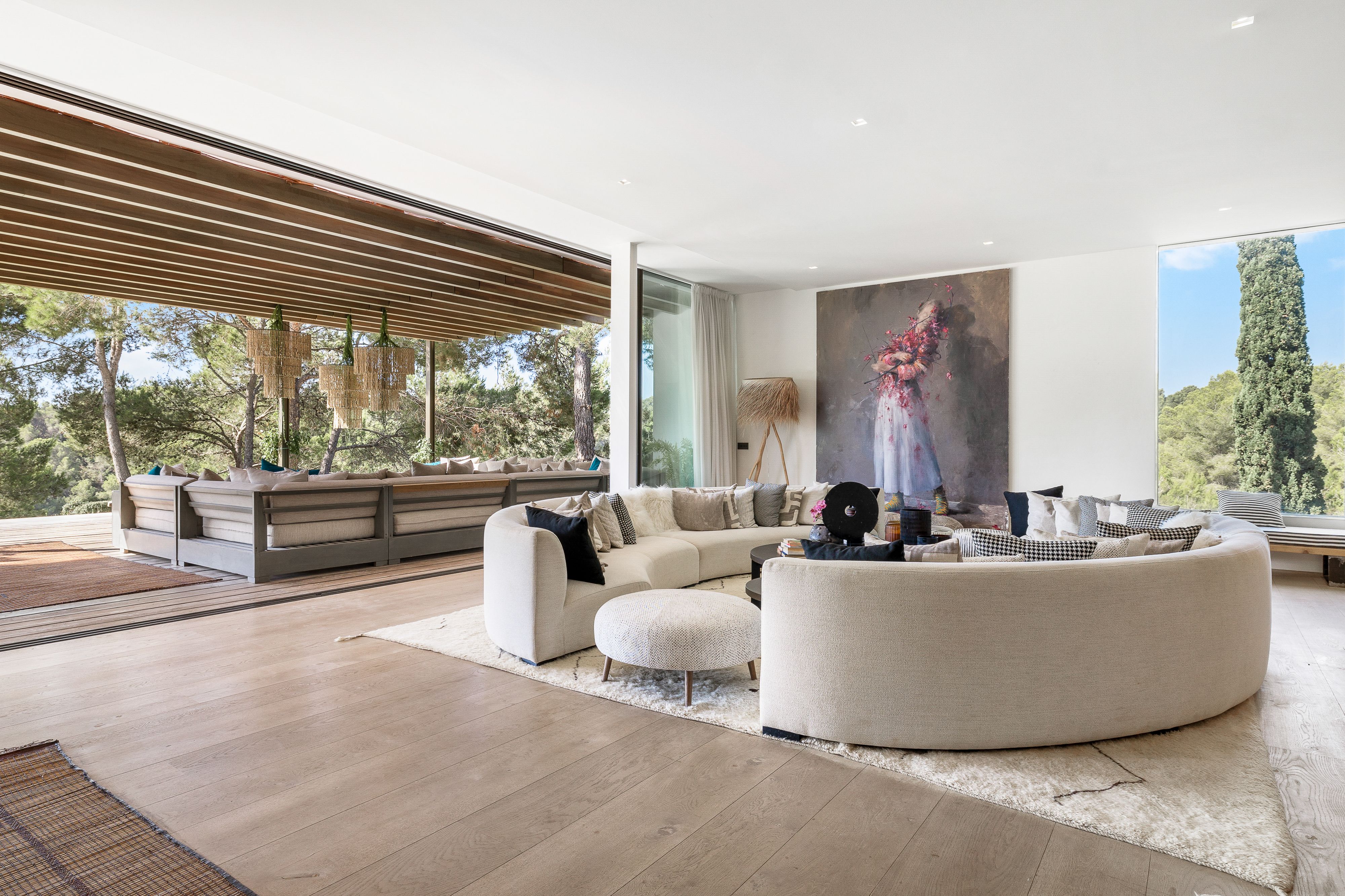 This villa completely embraces the Ibizan lifestyle. Days can be spent dipping in and out of the infinity pool, lounging on sprawling sofas across shaded patios, mixing up cocktails at the outdoor bar or playing games of petanque in the sun. Inside, there’s just as much to keep you entertained with a subterranean spa with treatment rooms in the basement, a dedicated home cinema and endless space to spread out. Bedrooms are as grand as hotel suites. Location-wise, you’re out in the peace and quiet, a twenty-minute walk from the day clubs of Cala Jondal beach.