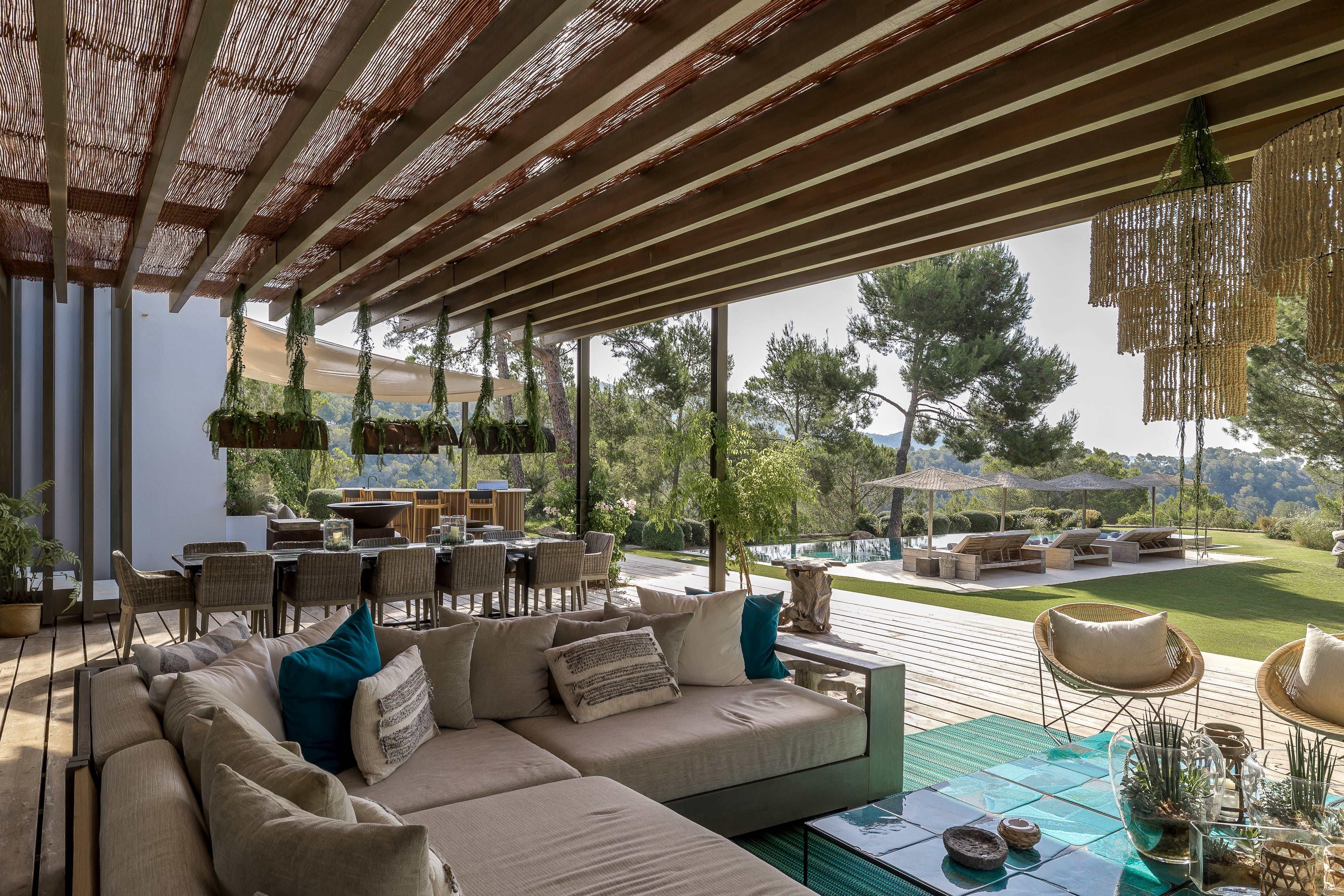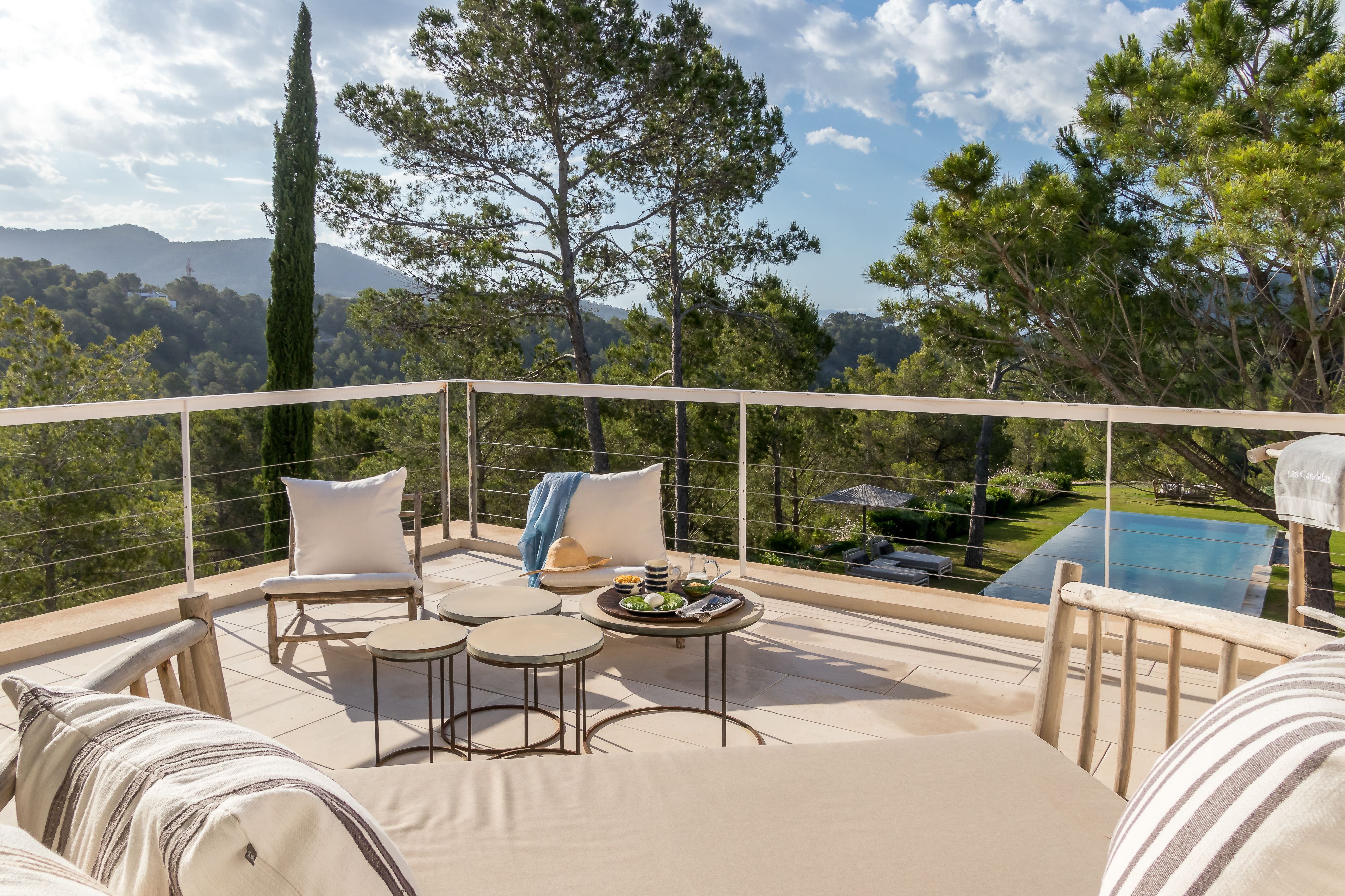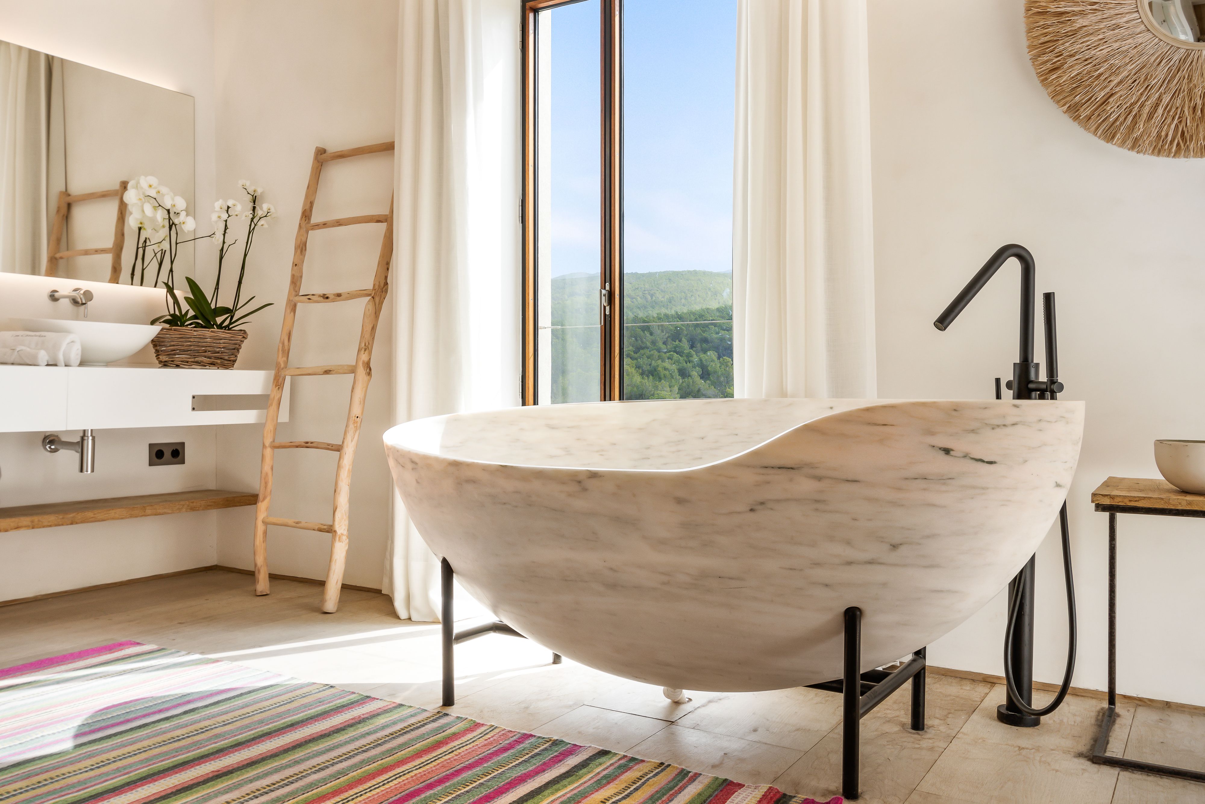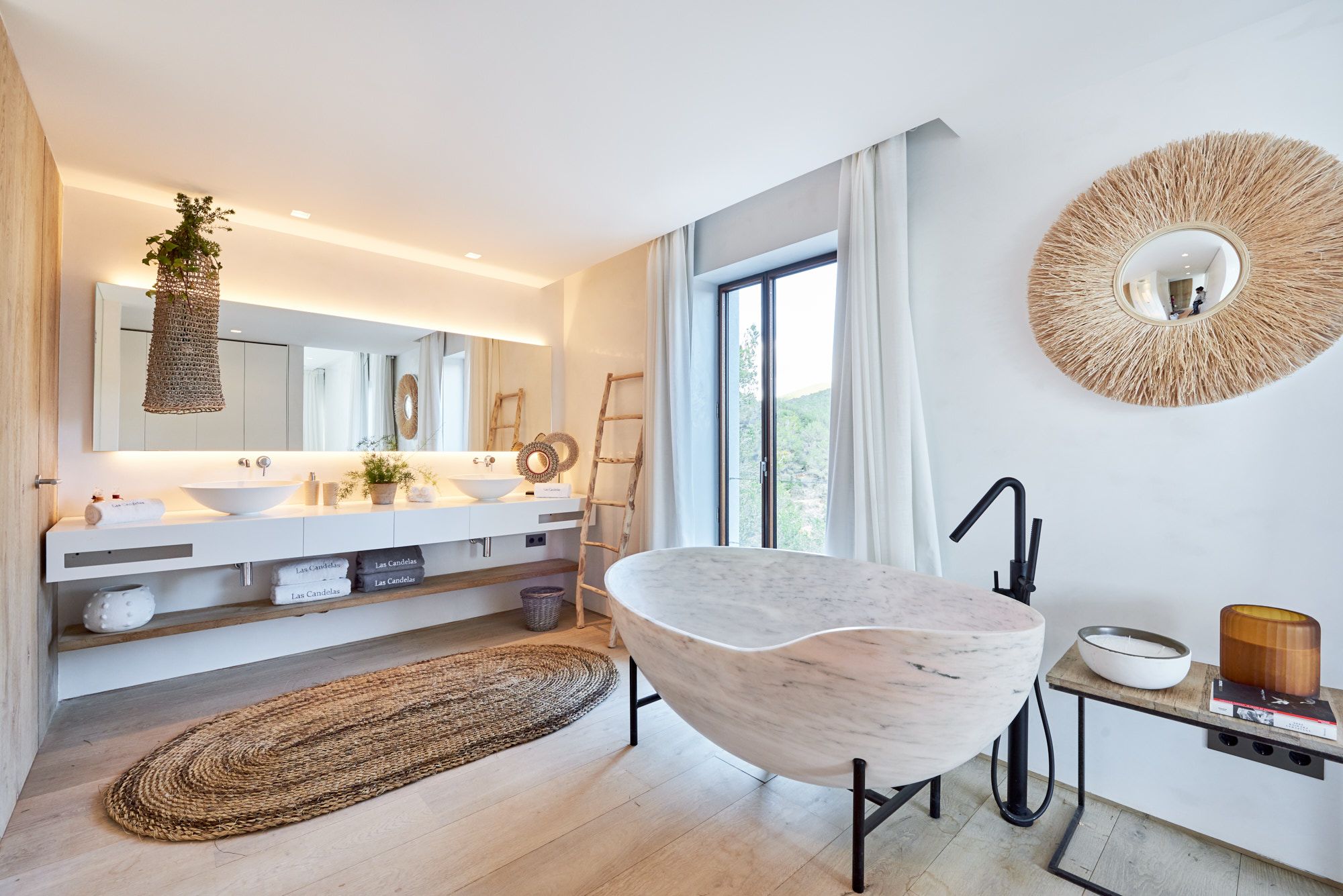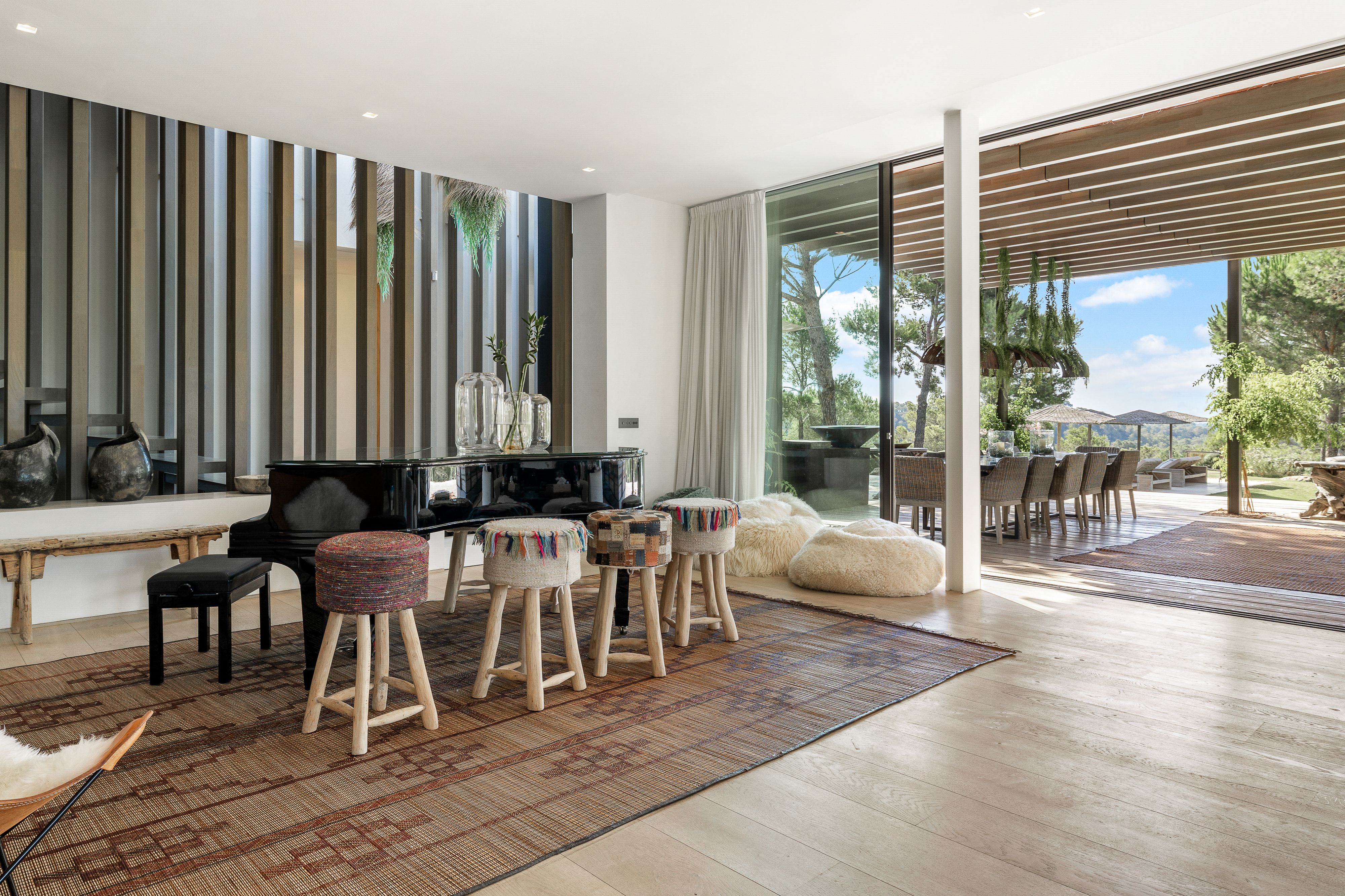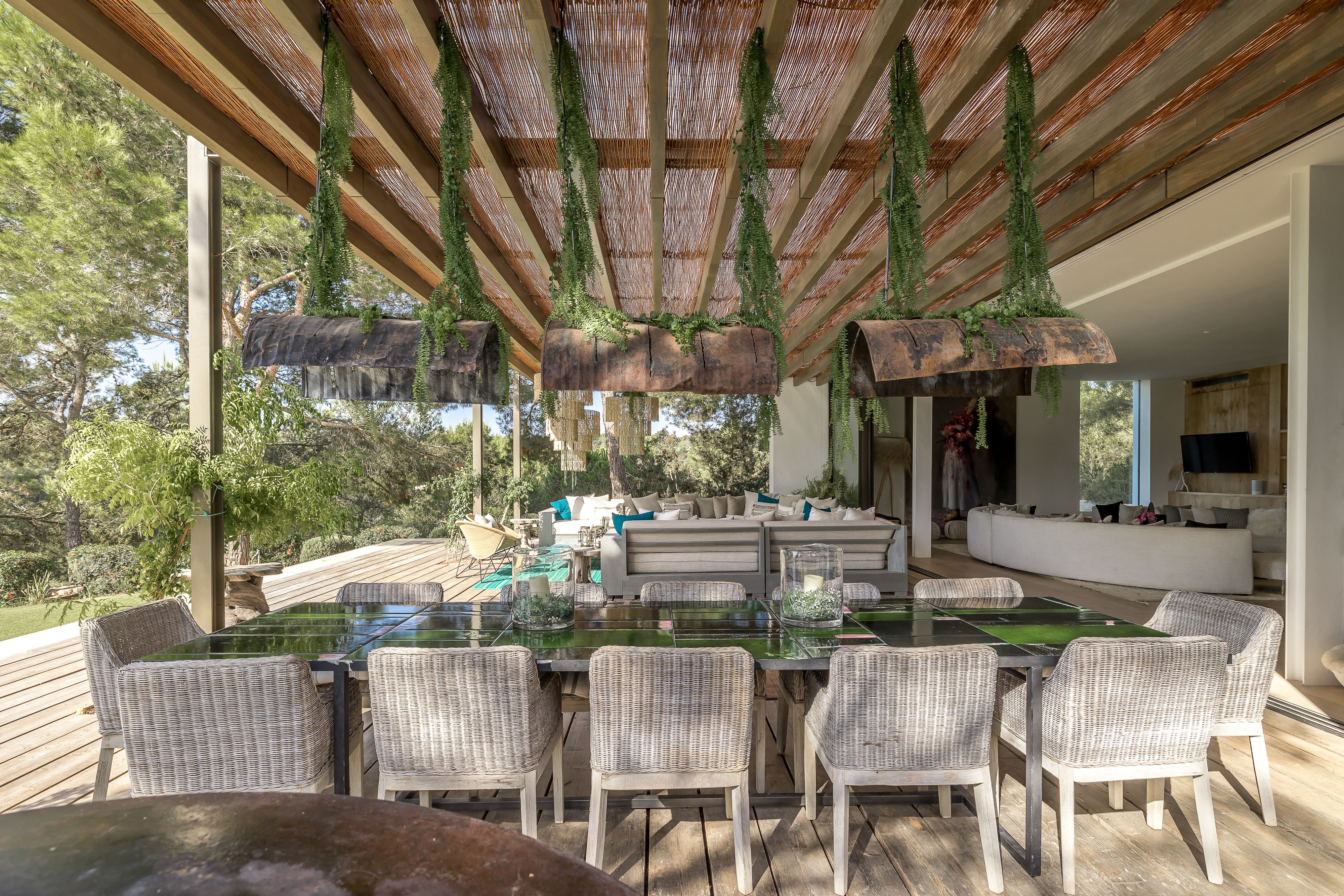 This villa completely embraces the Ibizan lifestyle. Days can be spent dipping in and out of the infinity pool, lounging on sprawling sofas across shaded patios, mixing up cocktails at the outdoor bar or playing games of petanque in the sun. Inside, there’s just as much to keep you entertained with a subterranean spa with treatment rooms in the basement, a dedicated home cinema and endless space to spread out. Bedrooms are as grand as hotel suites. Location-wise, you’re out in the peace and quiet, a twenty-minute walk from the day clubs of Cala Jondal beach.