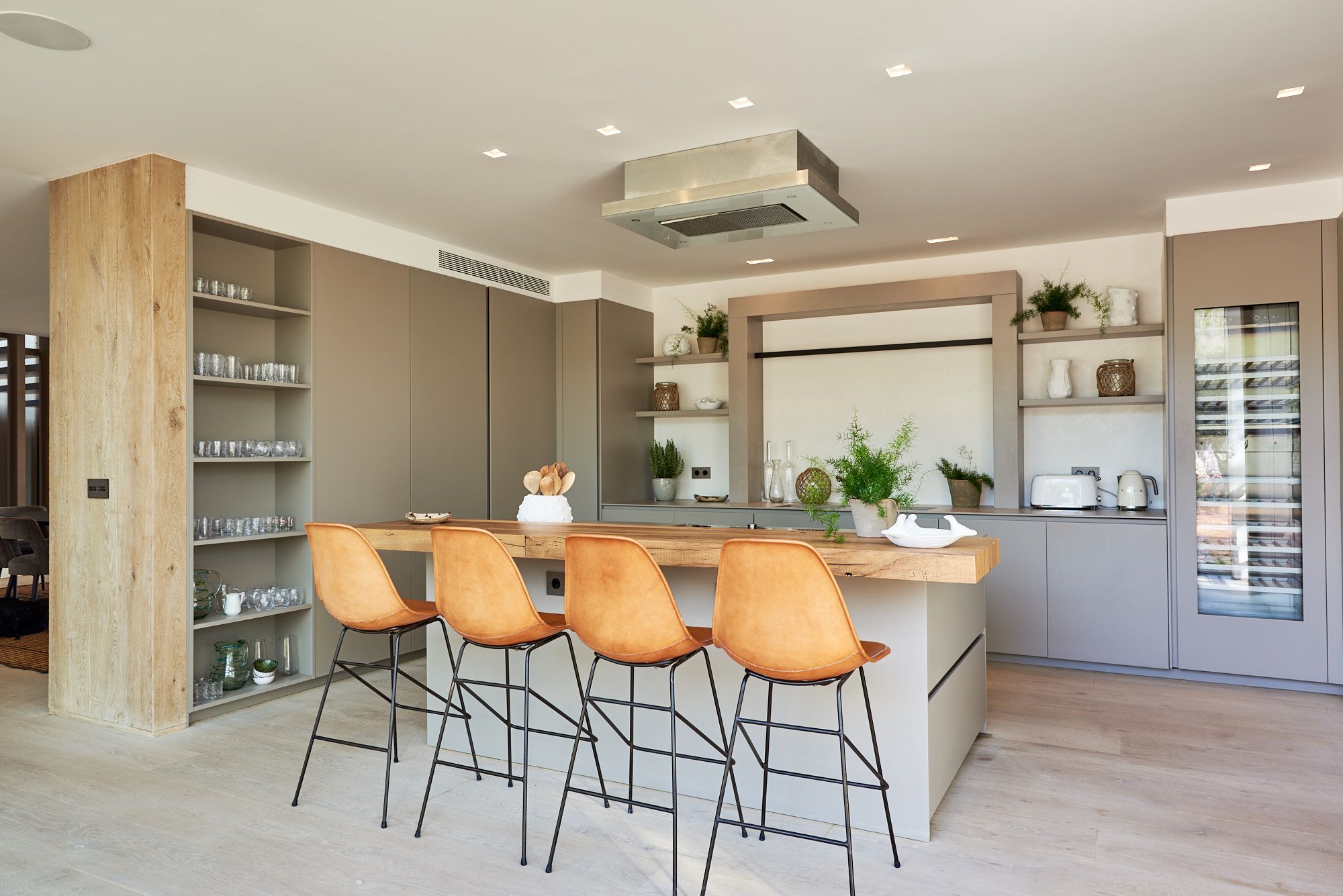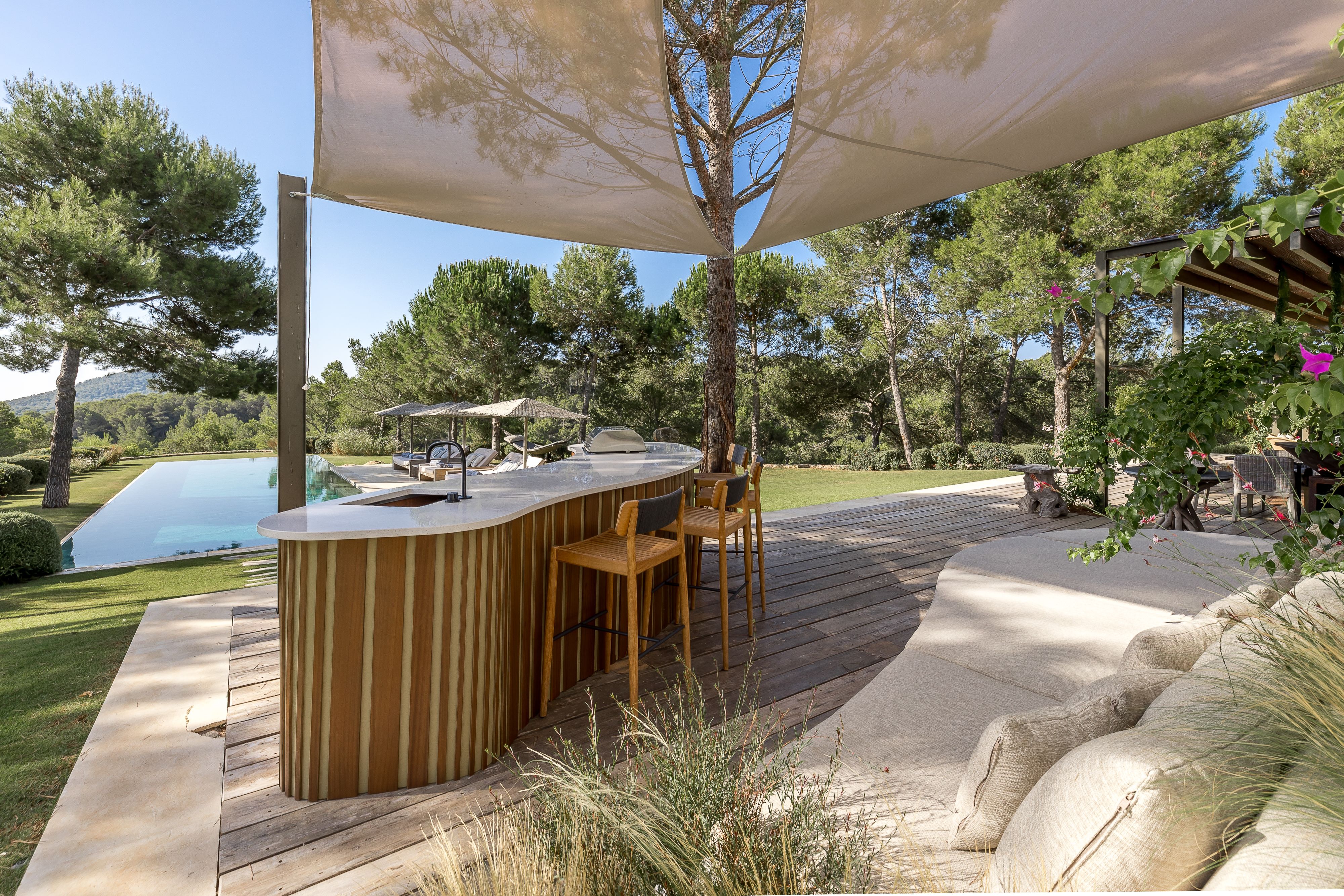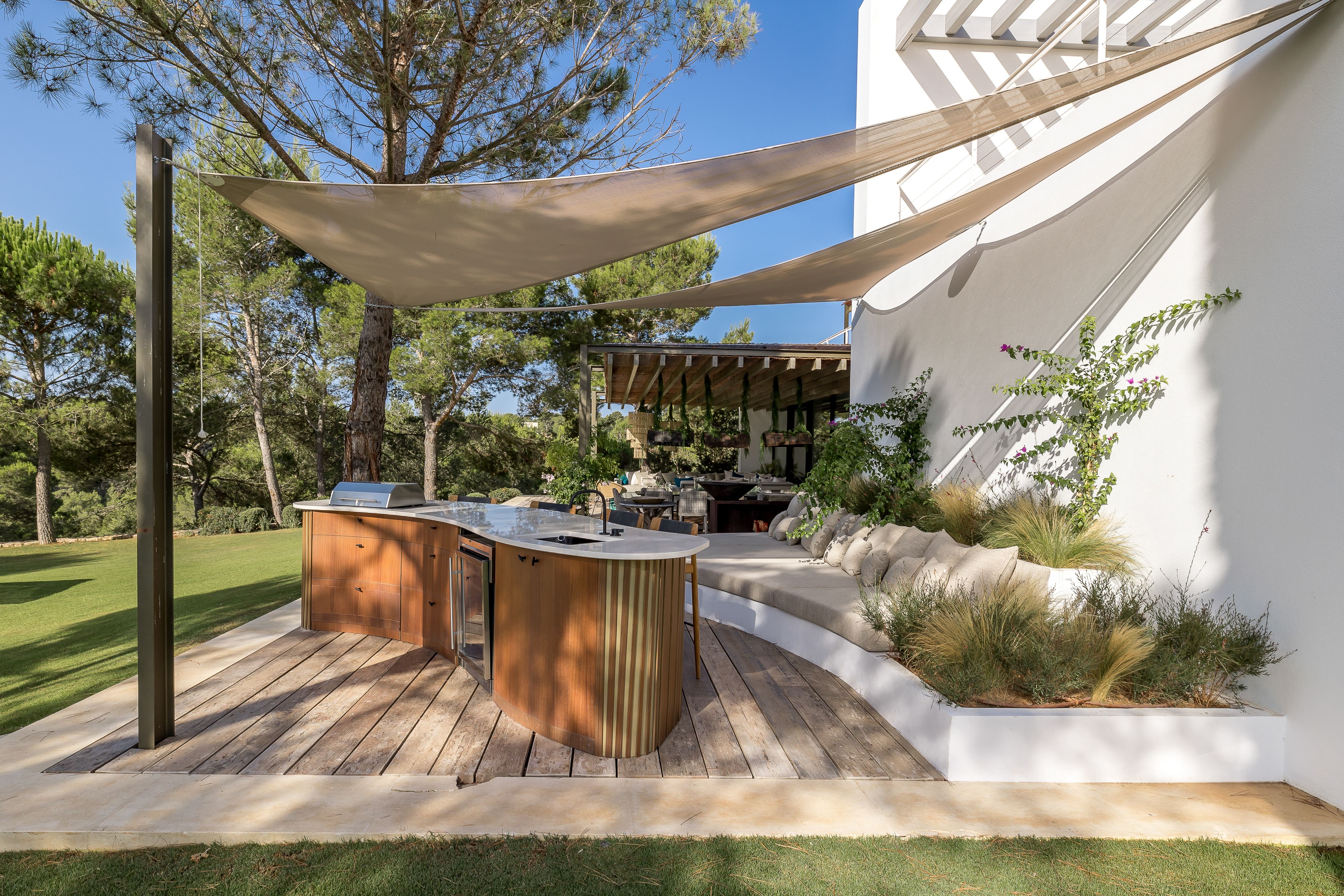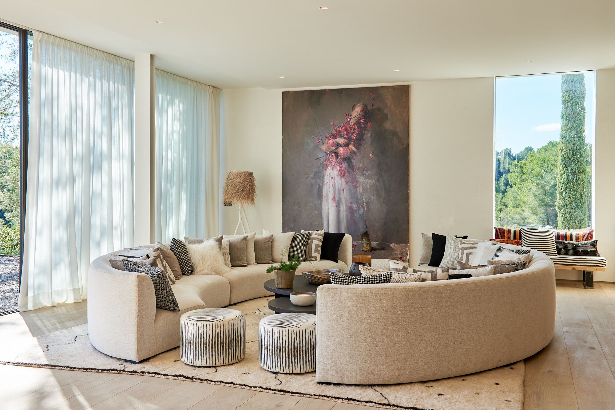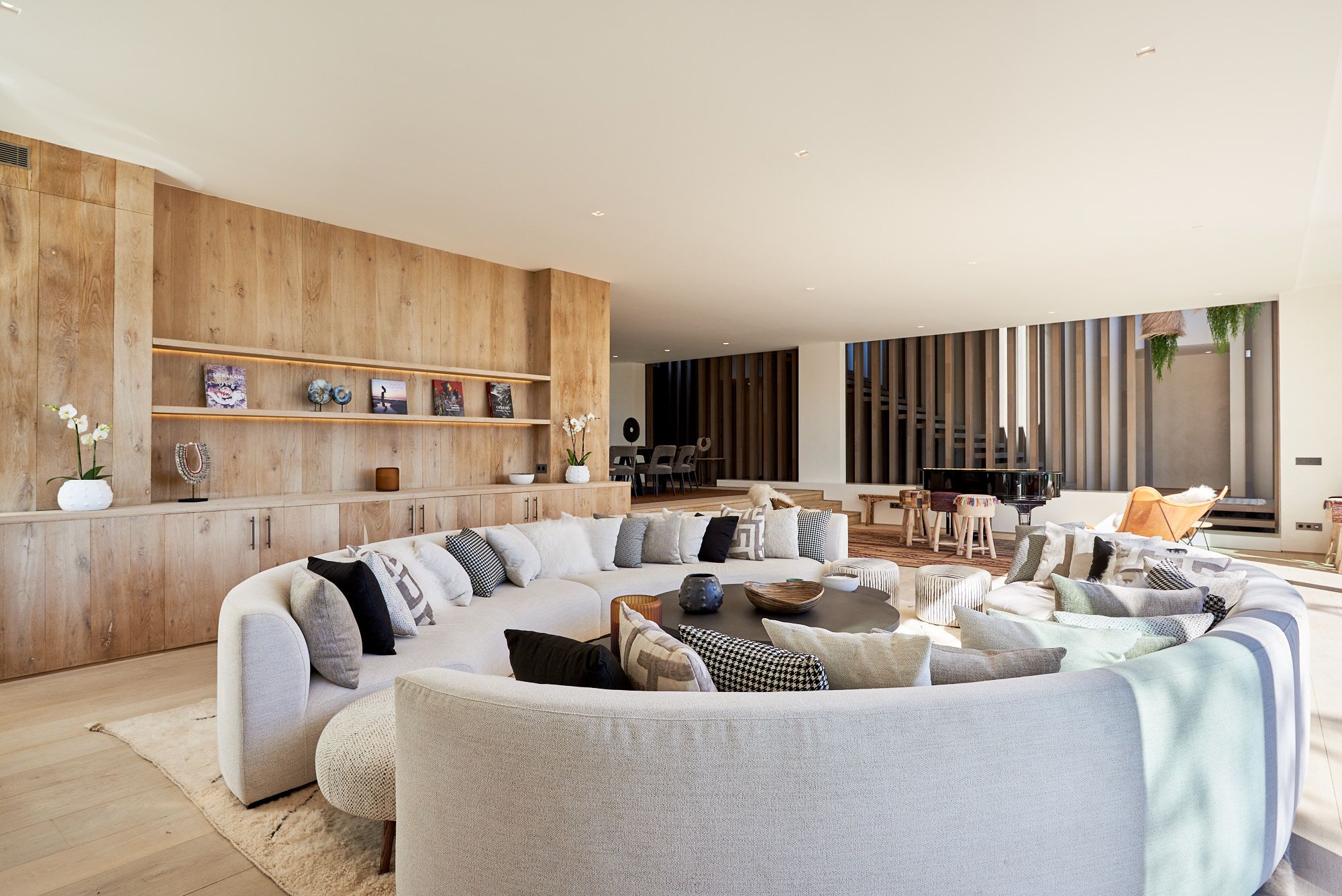 This villa completely embraces the Ibizan lifestyle. Days can be spent dipping in and out of the infinity pool, lounging on sprawling sofas across shaded patios, mixing up cocktails at the outdoor bar or playing games of petanque in the sun. Inside, there’s just as much to keep you entertained with a subterranean spa with treatment rooms in the basement, a dedicated home cinema and endless space to spread out. Bedrooms are as grand as hotel suites. Location-wise, you’re out in the peace and quiet, a twenty-minute walk from the day clubs of Cala Jondal beach.