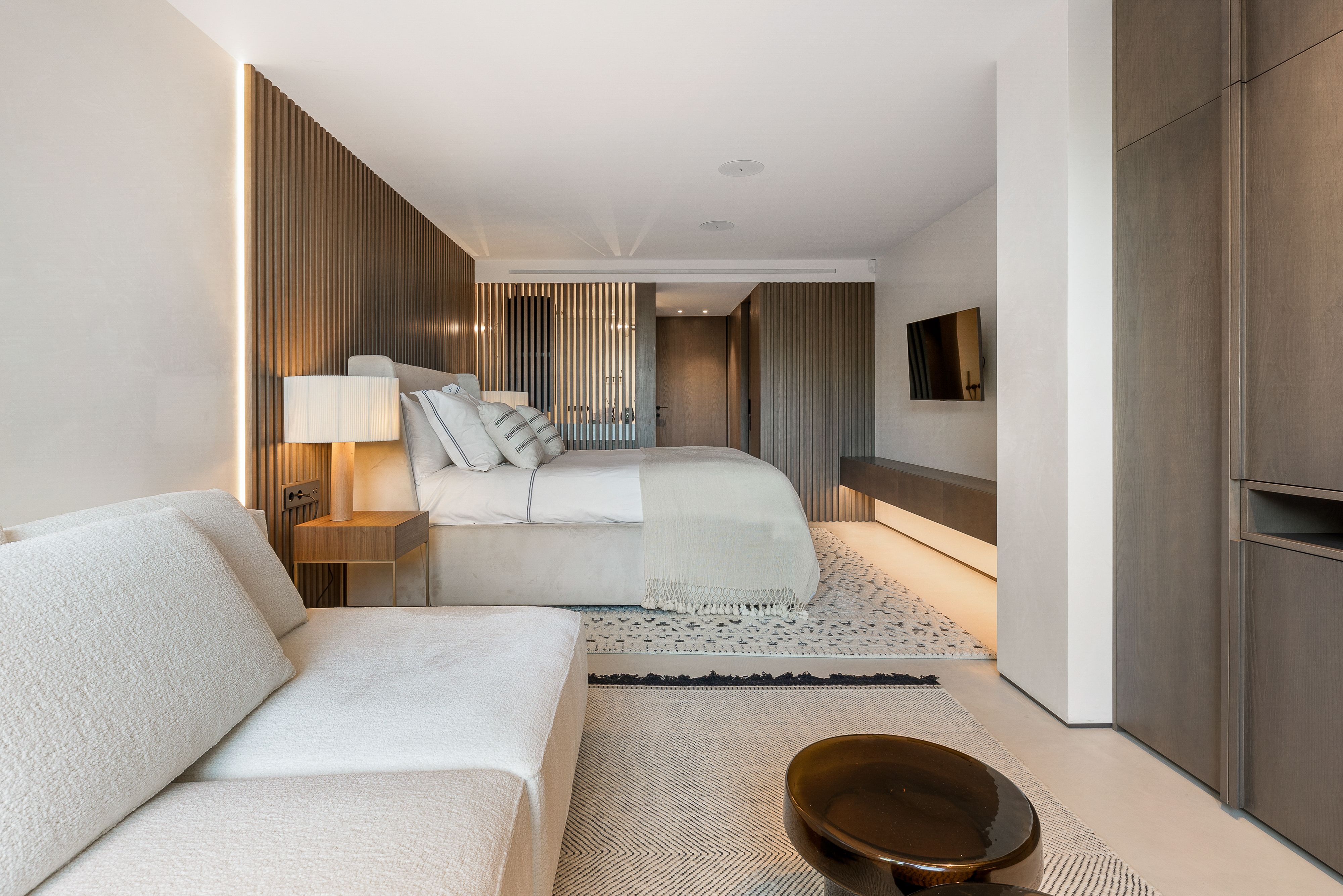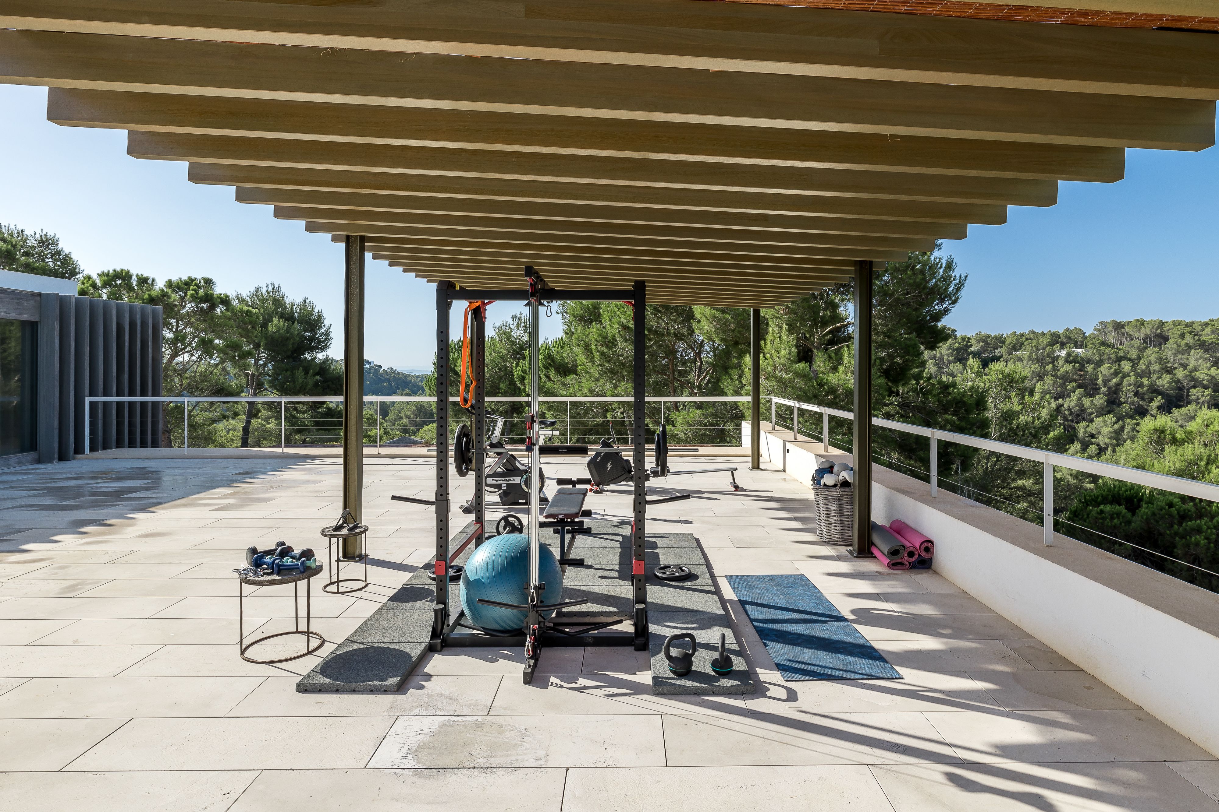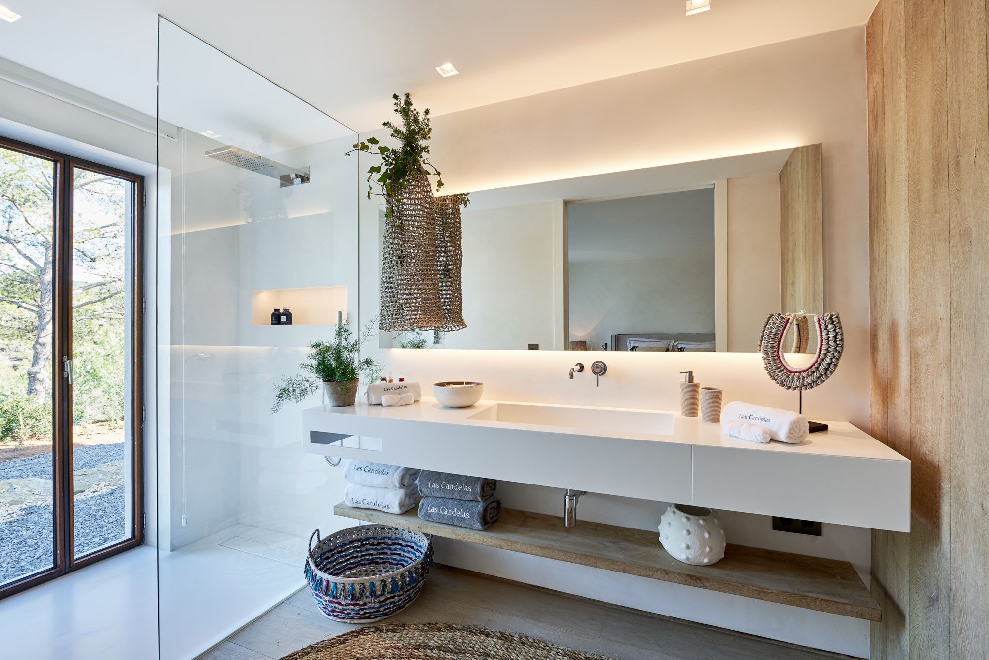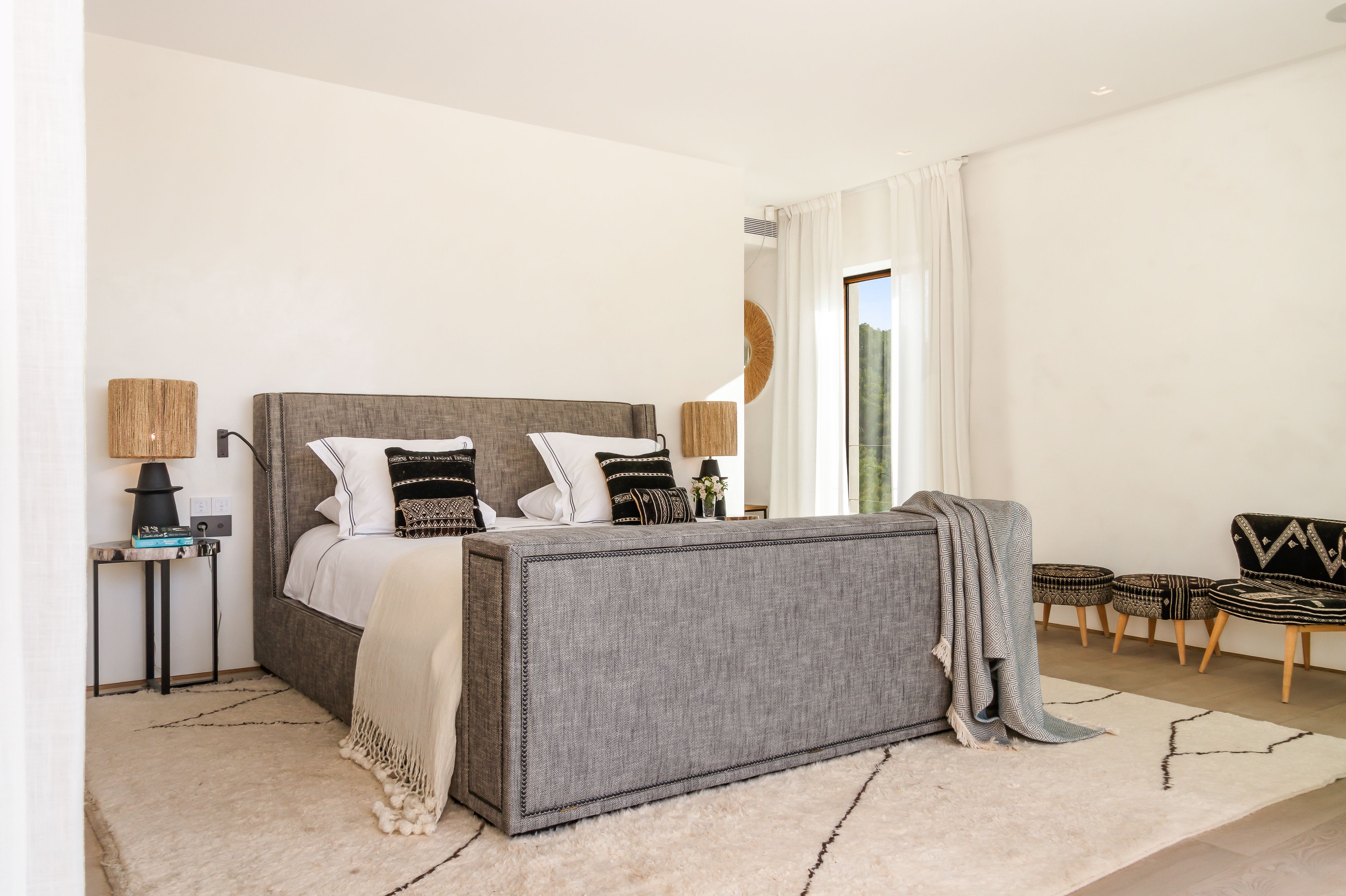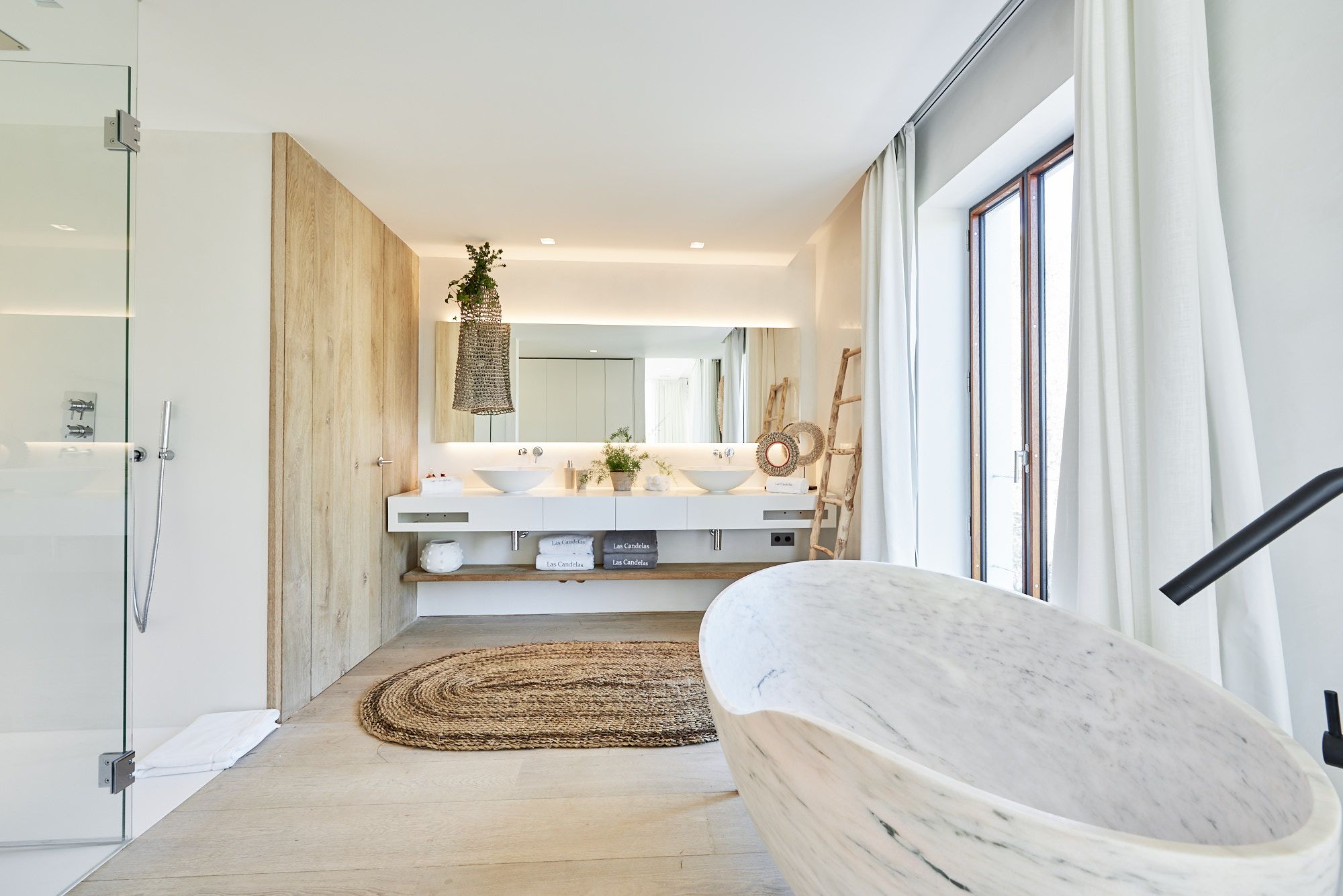 This villa completely embraces the Ibizan lifestyle. Days can be spent dipping in and out of the infinity pool, lounging on sprawling sofas across shaded patios, mixing up cocktails at the outdoor bar or playing games of petanque in the sun. Inside, there’s just as much to keep you entertained with a subterranean spa with treatment rooms in the basement, a dedicated home cinema and endless space to spread out. Bedrooms are as grand as hotel suites. Location-wise, you’re out in the peace and quiet, a twenty-minute walk from the day clubs of Cala Jondal beach.