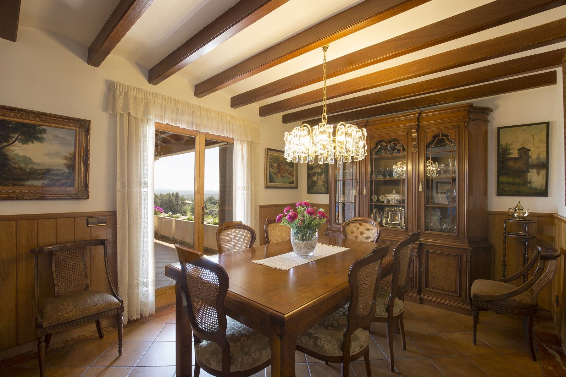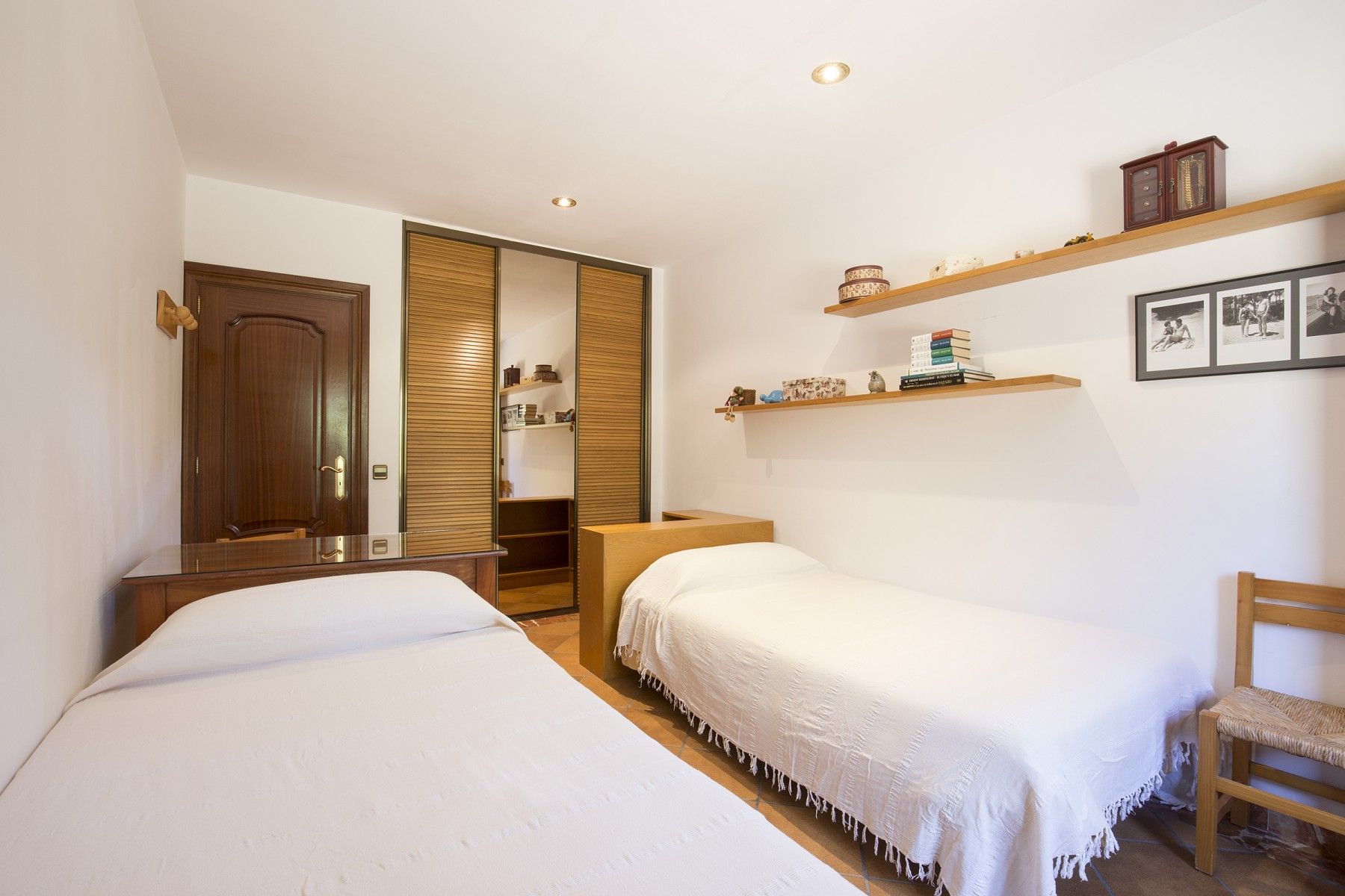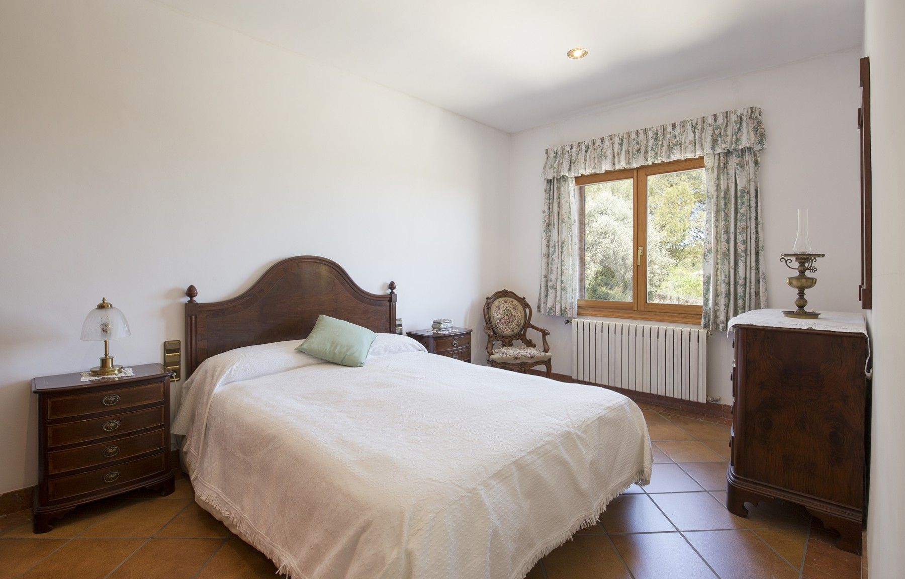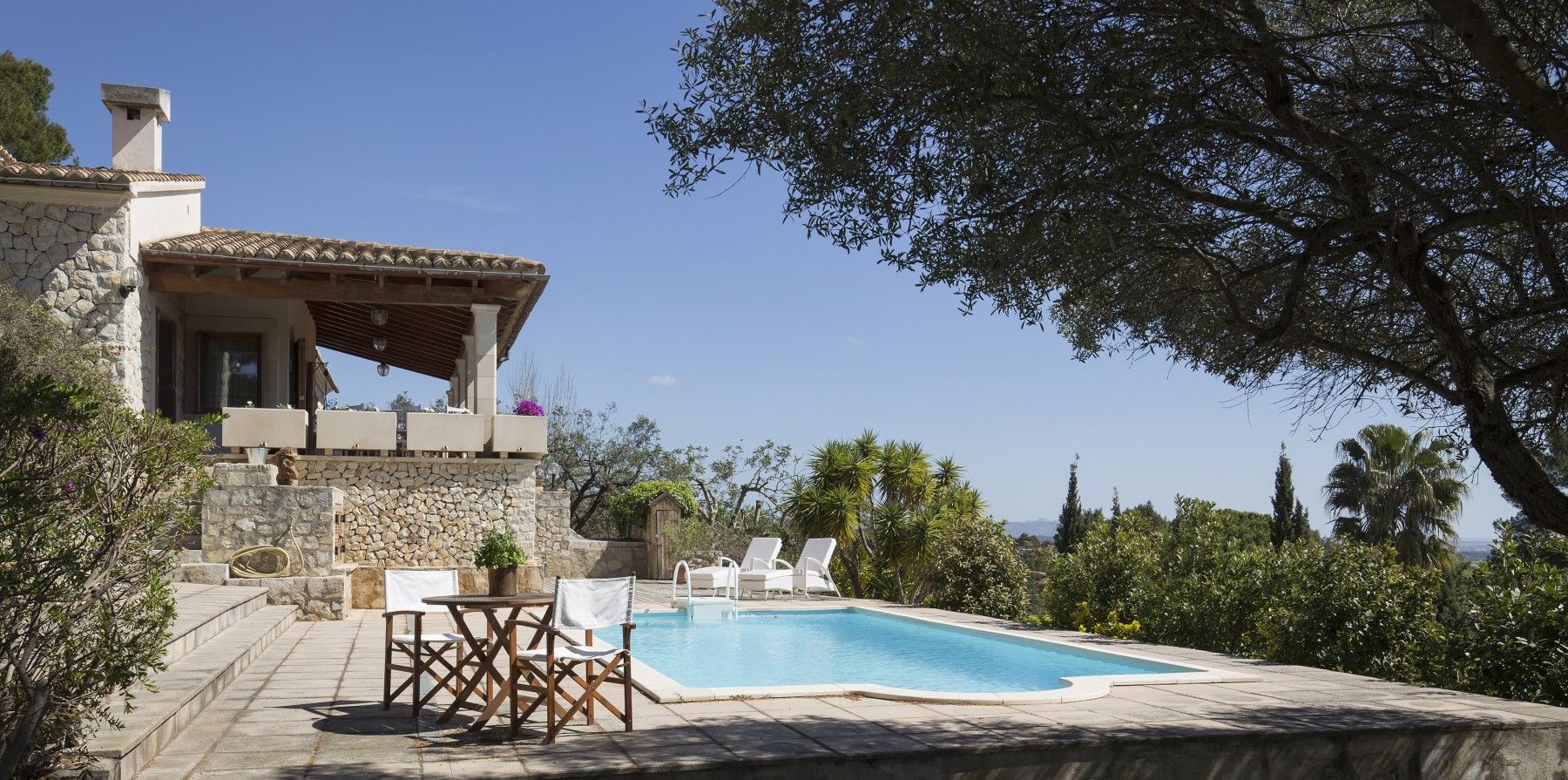 Live the good life here, plunging into the Roman-style swimming pool when the sun gets too hot, and drying off on a lounger on the wooden deck. There’s nothing but the sound of birds and crickets. The view from the dining table on the shaded terrace is simply sublime. Outside, the stone facade is all traditional finca, and the interior follows suit with wood-beamed ceilings and terracotta floors. Dark wood furniture adds an old-world feel and there’s a dedicated office for those that need to work remotely. During the chilly months, there’s a wood-burning stove in the living room, along with books on shelves throughout.