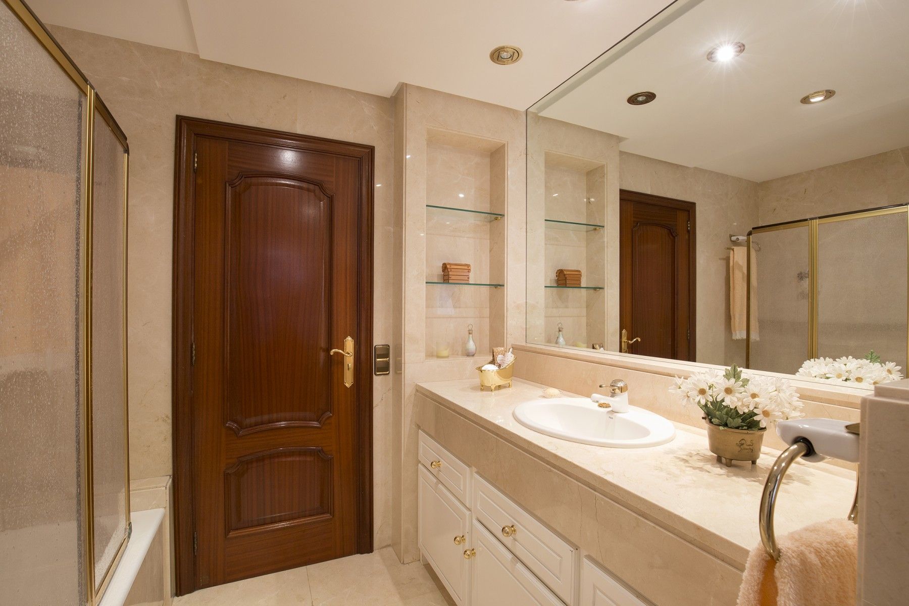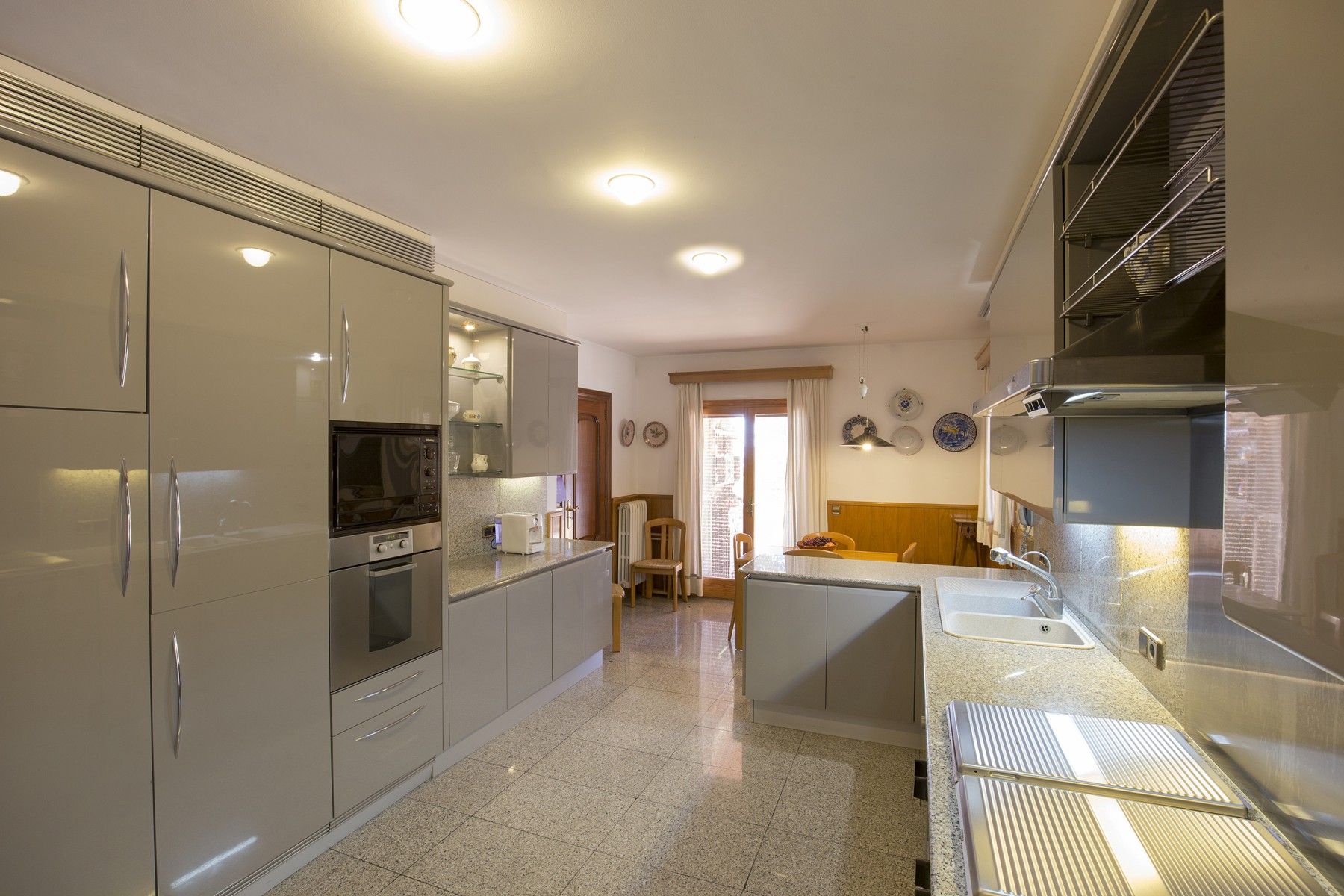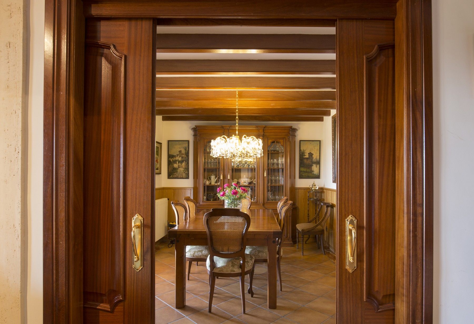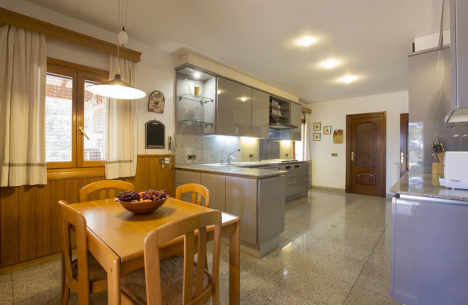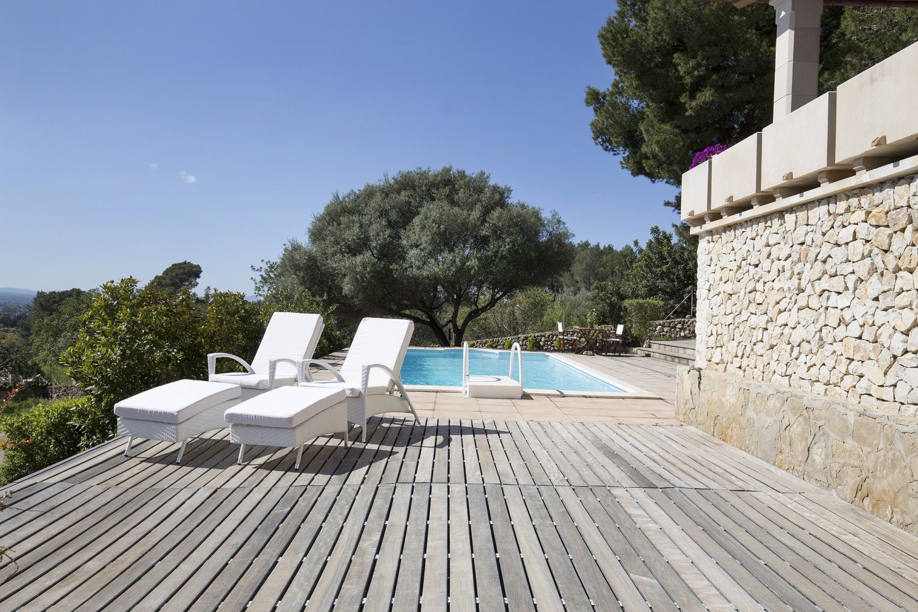 Live the good life here, plunging into the Roman-style swimming pool when the sun gets too hot, and drying off on a lounger on the wooden deck. There’s nothing but the sound of birds and crickets. The view from the dining table on the shaded terrace is simply sublime. Outside, the stone facade is all traditional finca, and the interior follows suit with wood-beamed ceilings and terracotta floors. Dark wood furniture adds an old-world feel and there’s a dedicated office for those that need to work remotely. During the chilly months, there’s a wood-burning stove in the living room, along with books on shelves throughout.