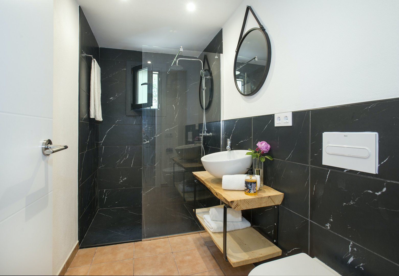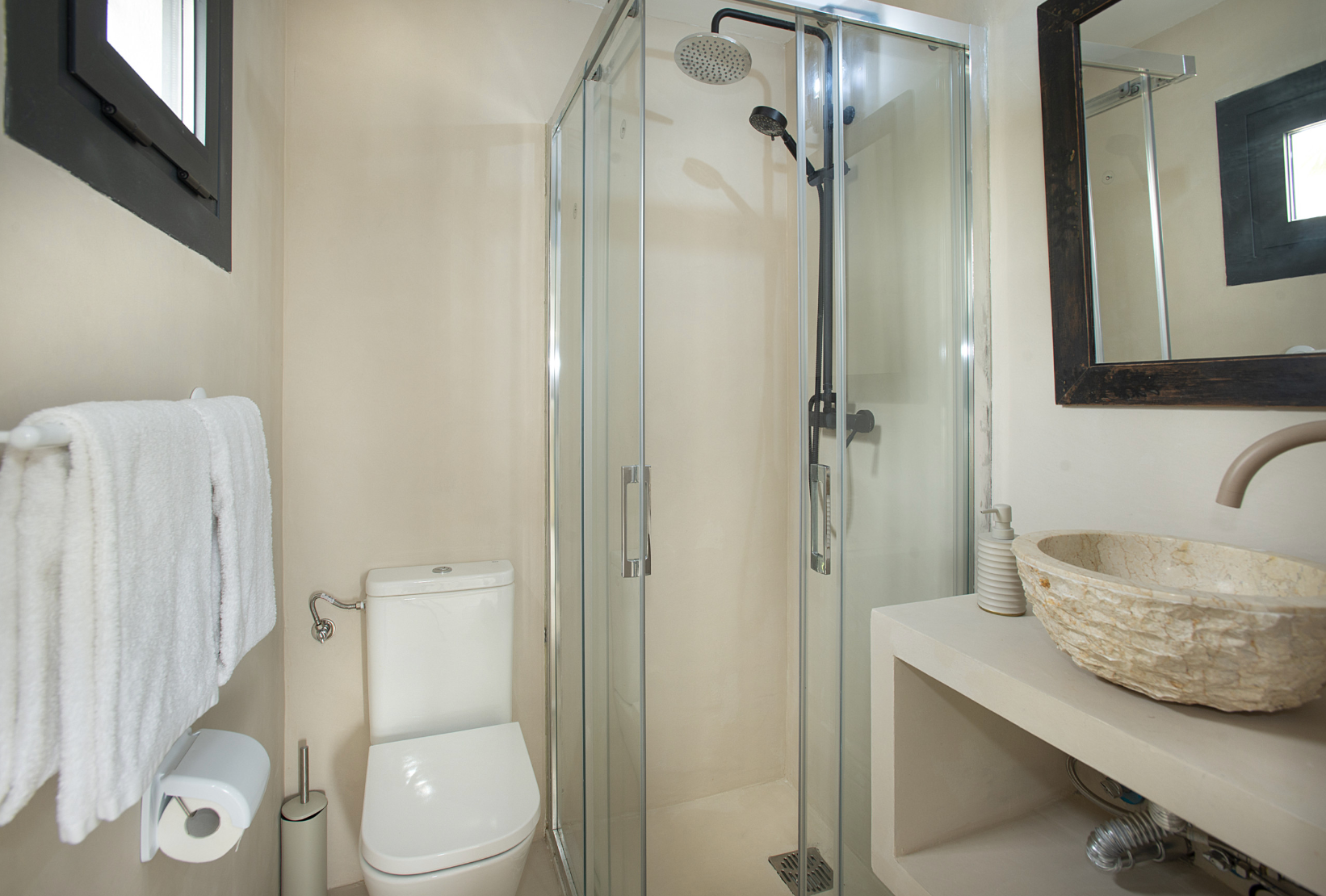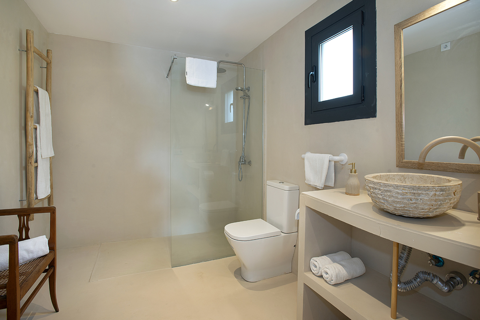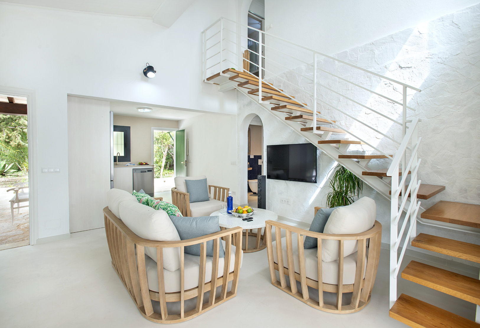 Inside, the living quarters feel bright and airy, thanks to the large glass doors letting in ample amounts of natural light and an open layout that lets this asset flow about unimpeded. The furnishings and finishes are simple in style, with only the patches of exposed stonework and terracotta tiles in keeping with traditional Baleric design – the wood-burning stove in the living room is rather rustic, too.