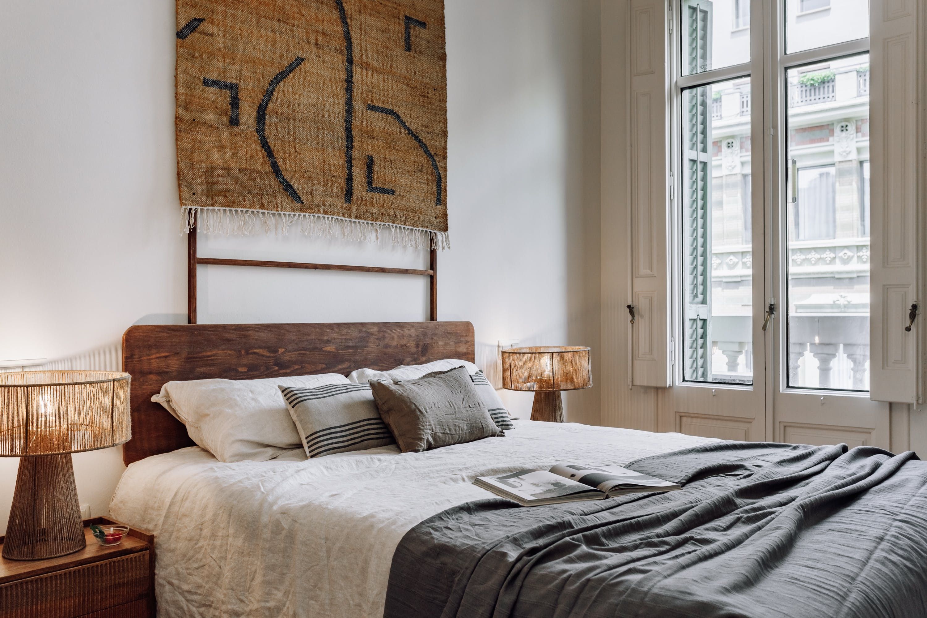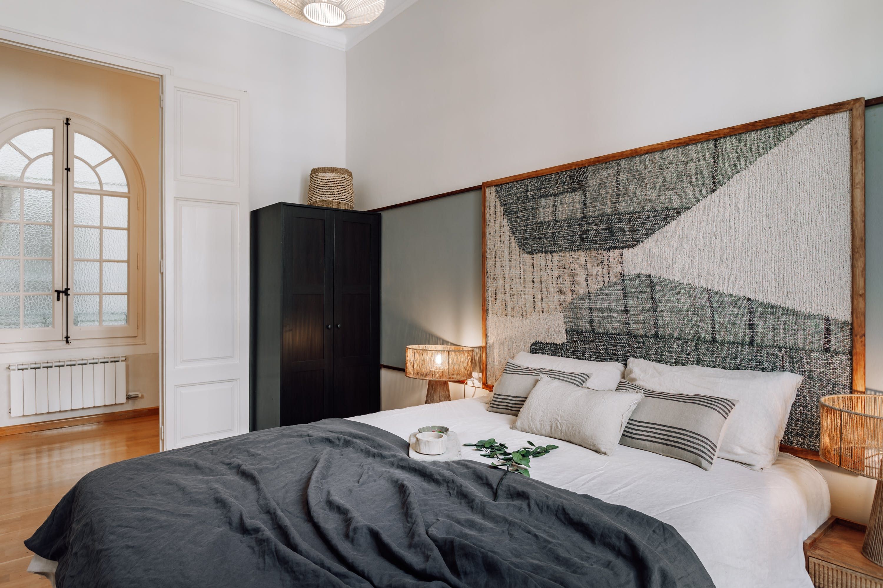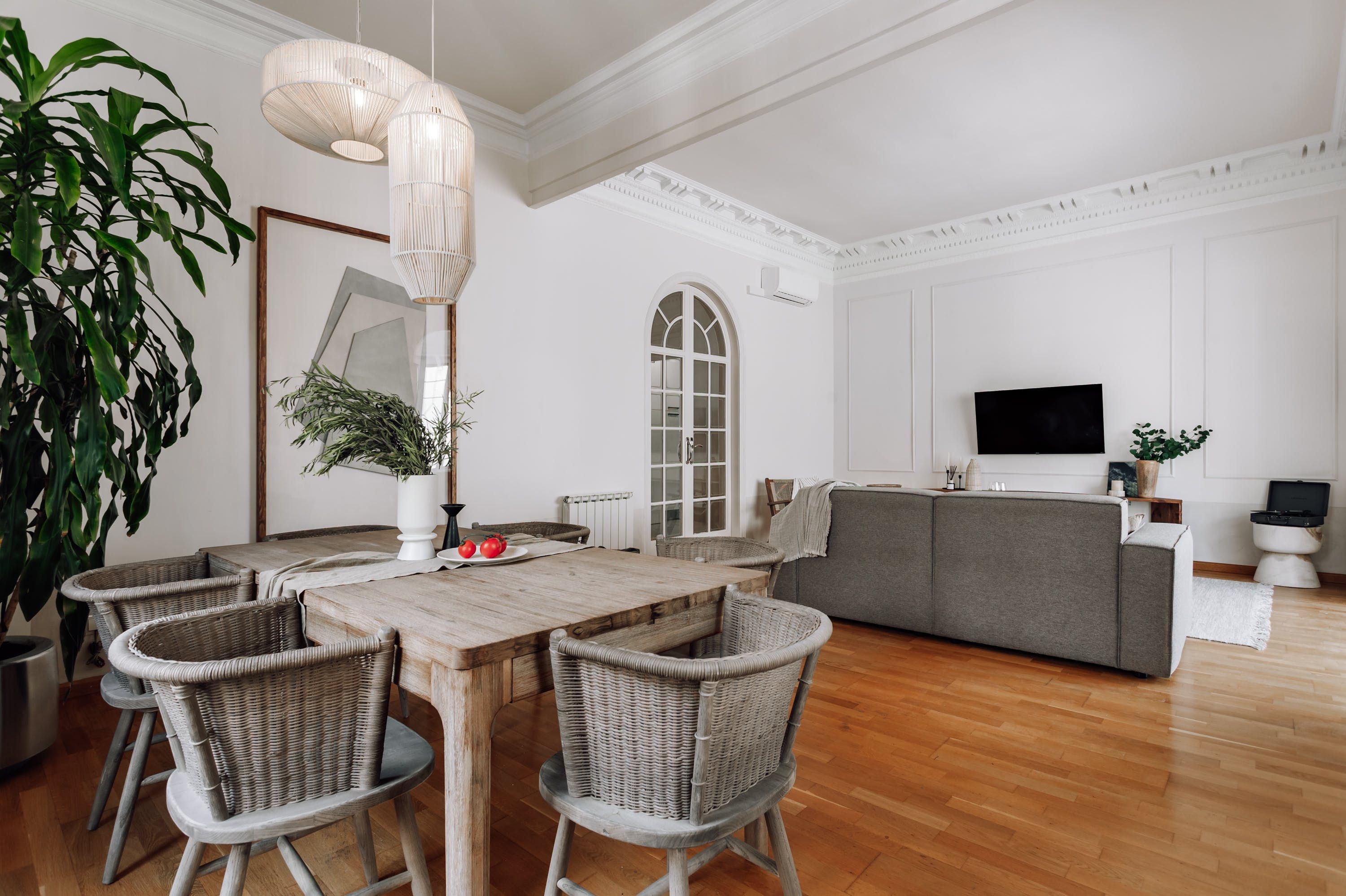 This stylish apartment is a great base for a large family or a group of friends. It’s in La Dreta de l’Eixample, a cool part of Barcelona rich in Gaudi-inspired architecture, boutiques, and upscale restaurants. When you’re not strolling along Paseo de Gracia or Rambla Catalunya, you’ll enjoy having such a tranquil space to call home. There’s a petite French balcony so you can sip your morning coffee while watching the streets below come to life. We love the large windows, which make the open-plan living and dining space bright and welcoming.