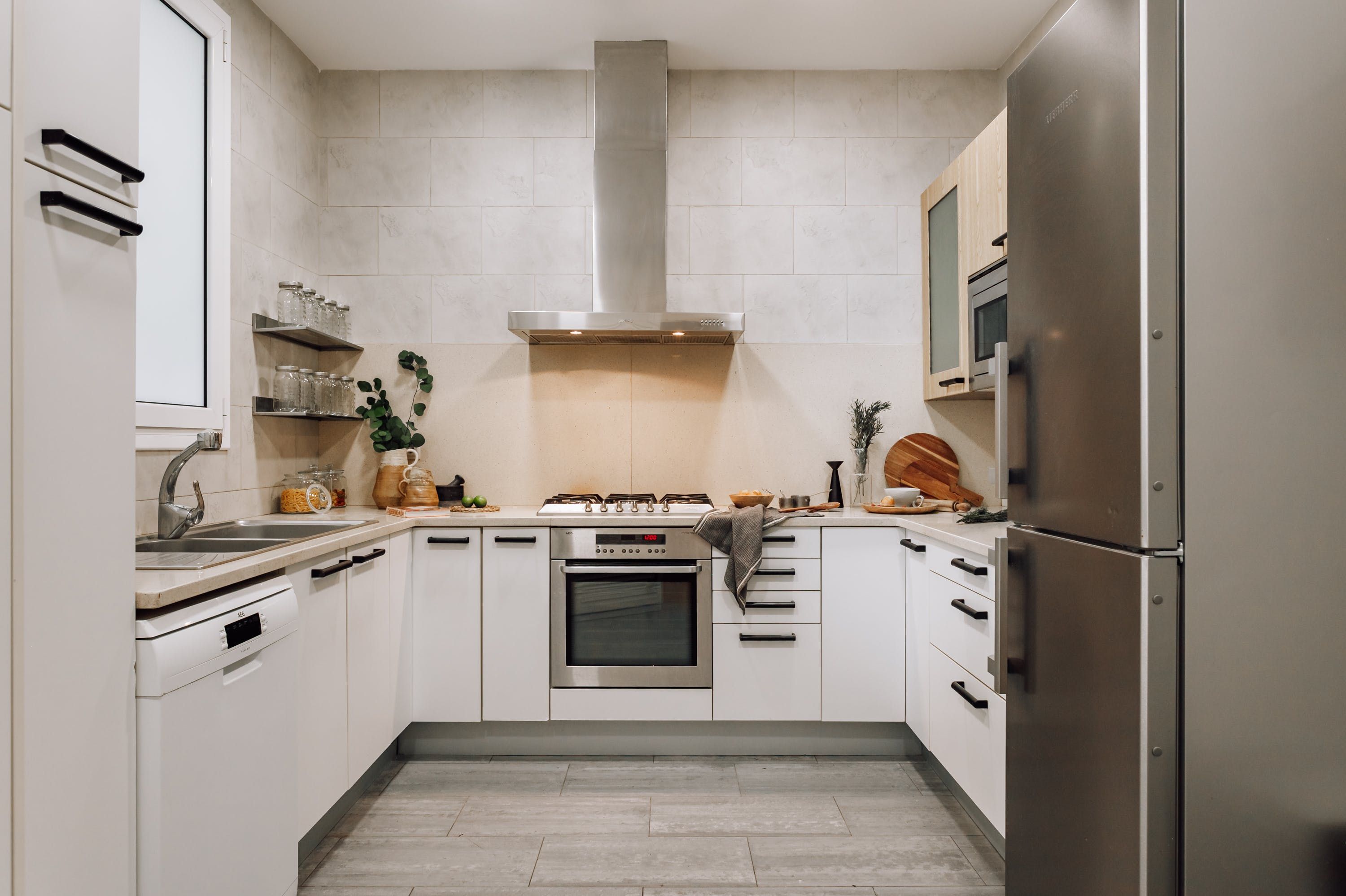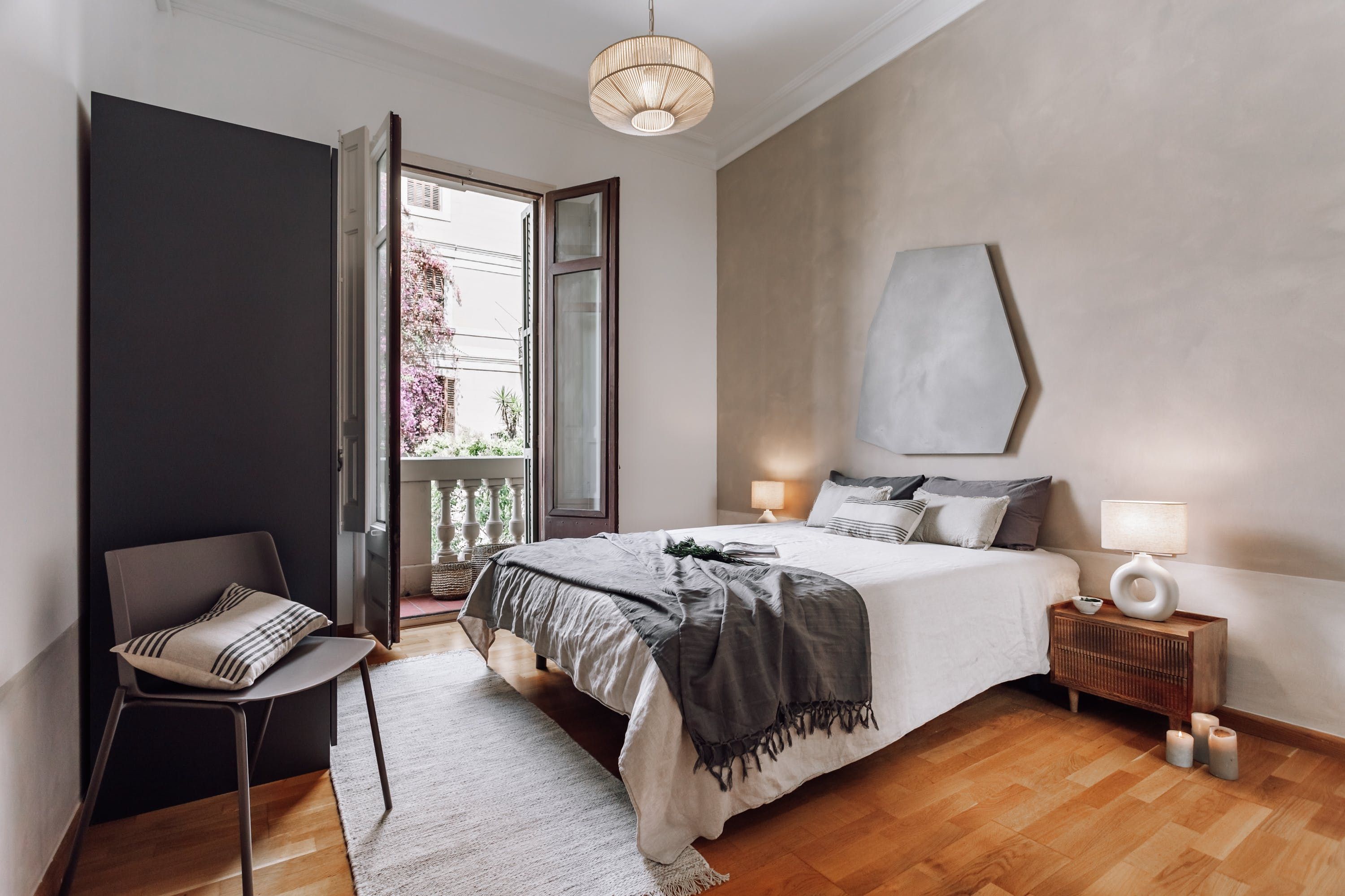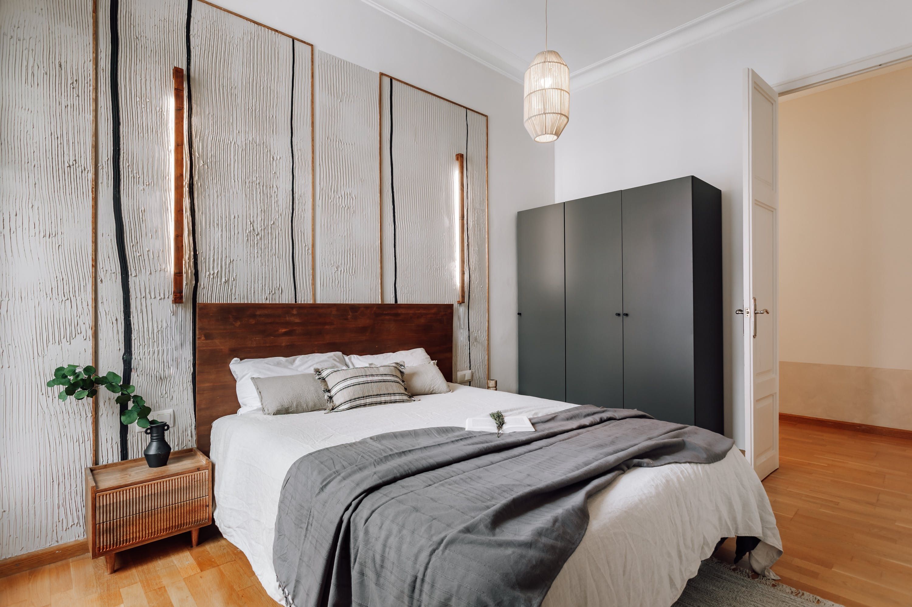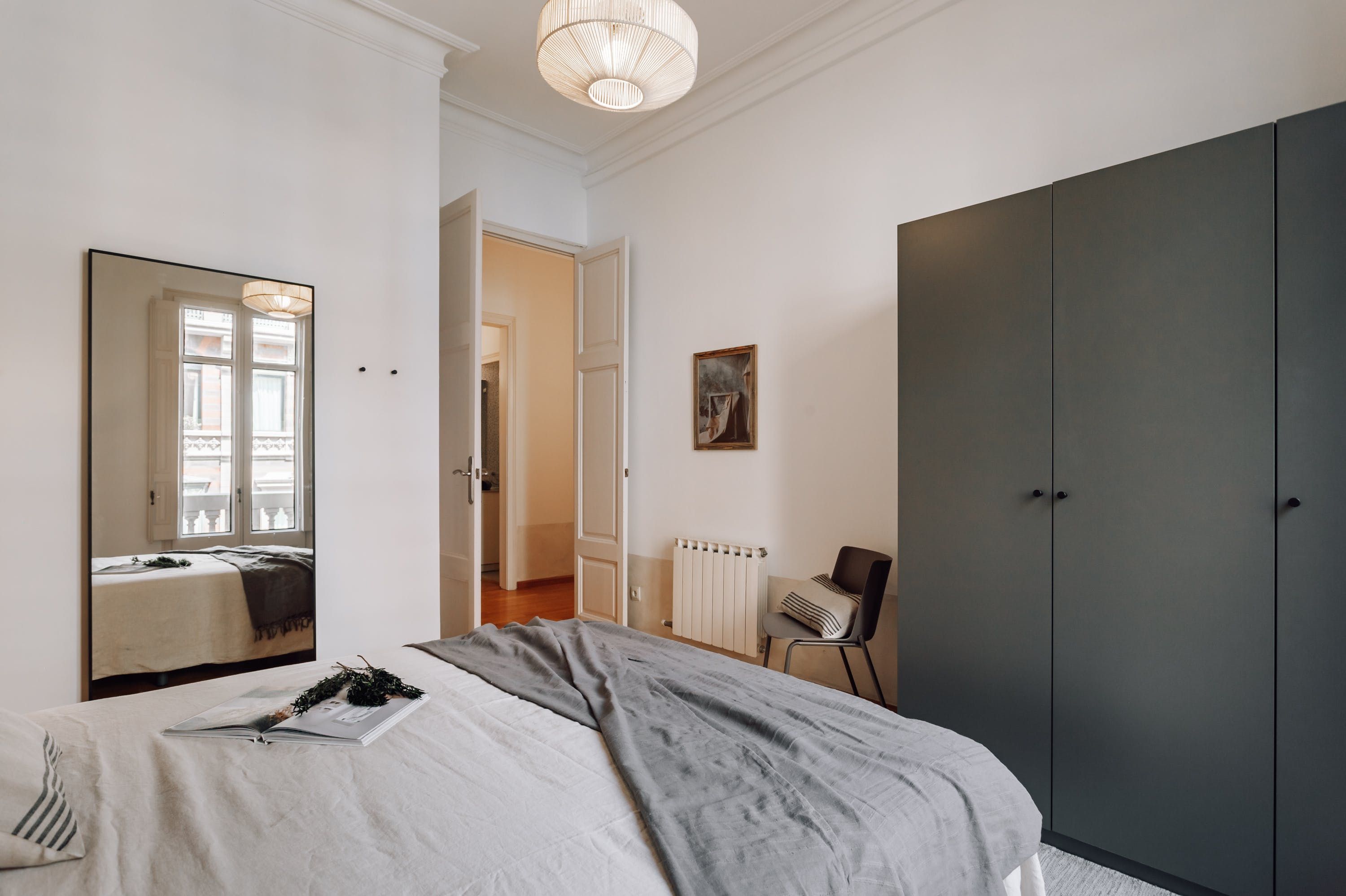 This stylish apartment is a great base for a large family or a group of friends. It’s in La Dreta de l’Eixample, a cool part of Barcelona rich in Gaudi-inspired architecture, boutiques, and upscale restaurants. When you’re not strolling along Paseo de Gracia or Rambla Catalunya, you’ll enjoy having such a tranquil space to call home. There’s a petite French balcony so you can sip your morning coffee while watching the streets below come to life. We love the large windows, which make the open-plan living and dining space bright and welcoming.