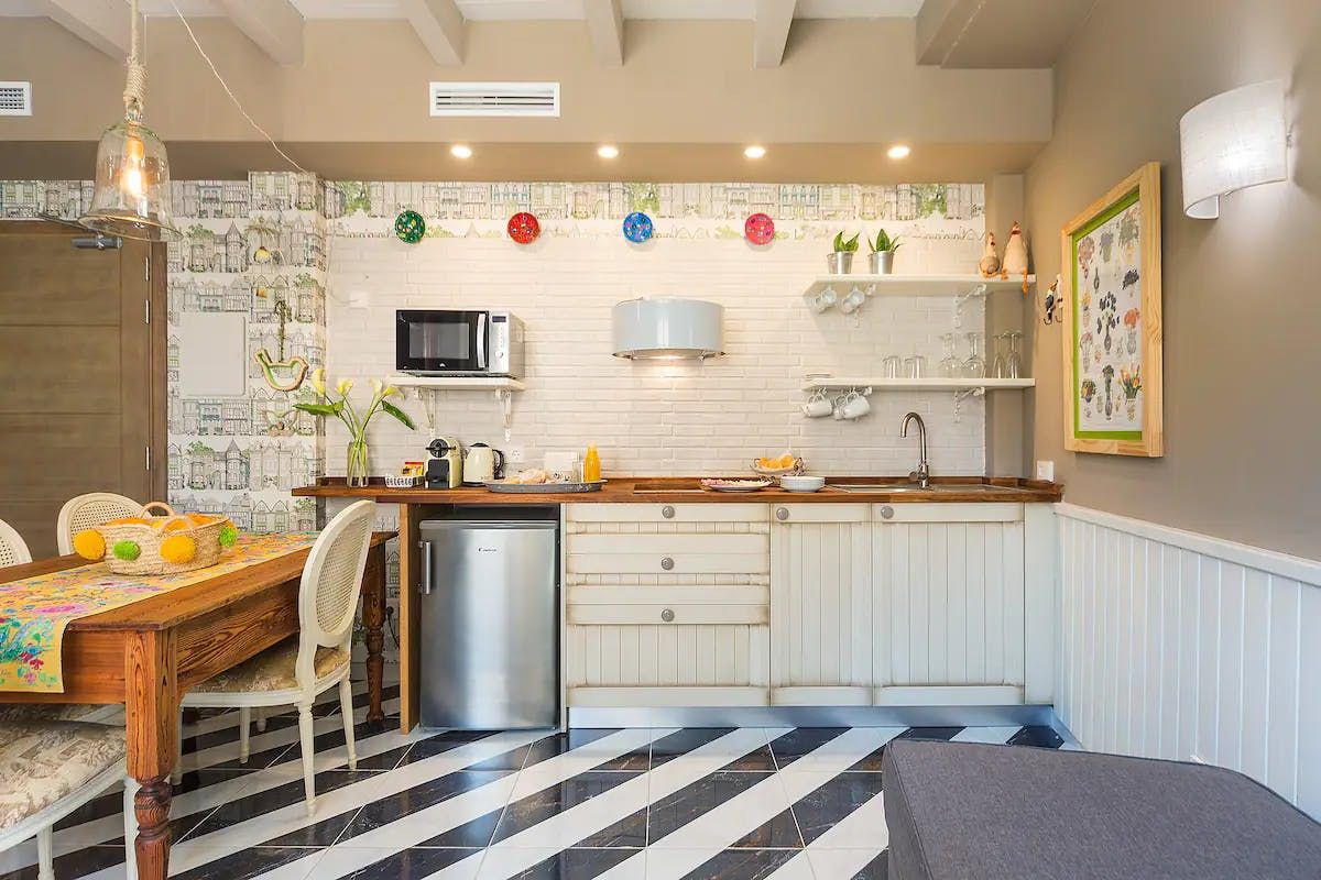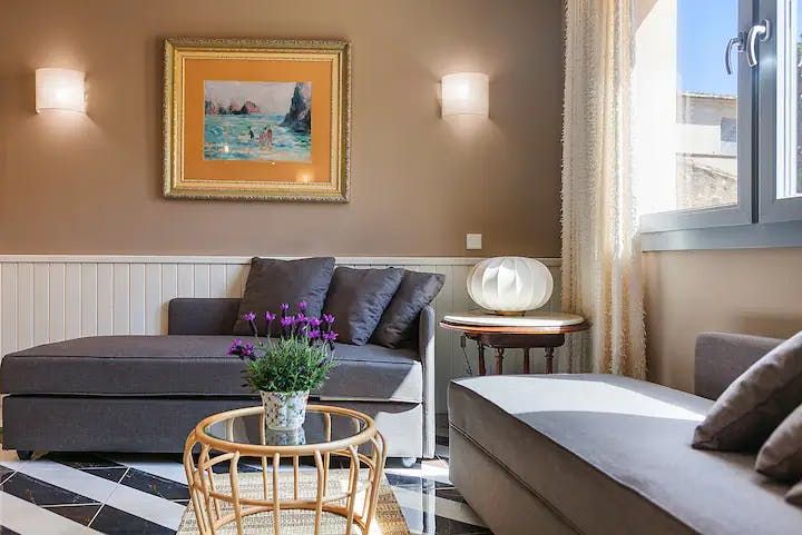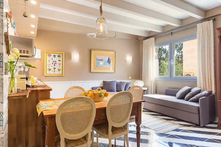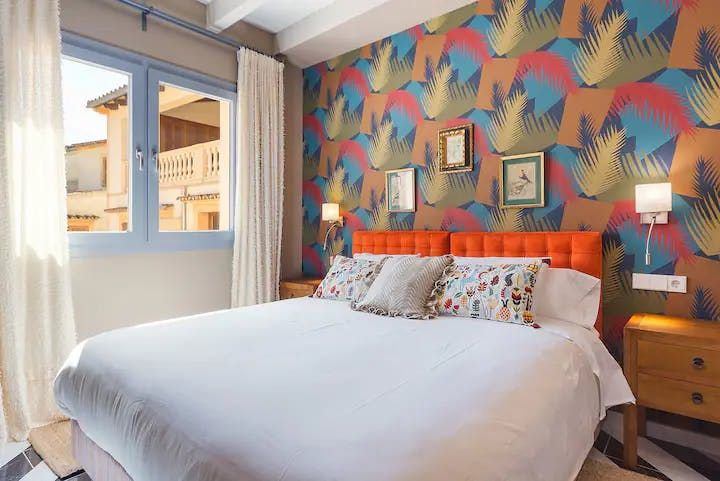 Relax on this home's lovely roof terrace with a glass of Mallorcan wine and take in the views over Llucmajor's terracotta rooftops. Inside, this professionally designed home has half wood panelled walls and plenty of artwork adorning the walls. We love the bedroom with its plush, orange velvet headboard and vibrant botanical wallpaper.