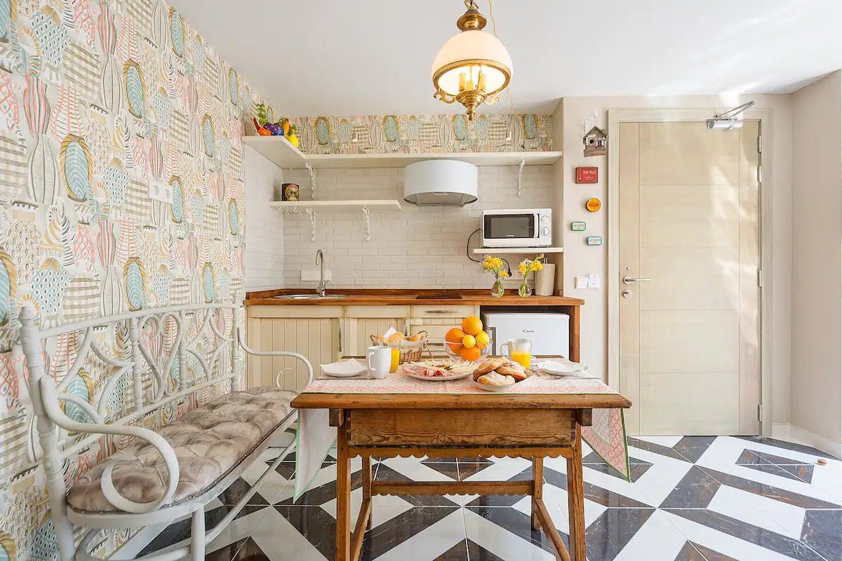 Decked out in pretty pastel prints that feel like they've been taken straight from a storybook cottage, the apartment’s decor is cosy and welcoming with streams of light pouring through the wall of glass separating the living room from its private rooftop terrace. Slide open the doors to step out onto this sun-baked spot where a table and chairs invite alfresco meals and celebratory drinks as the sun sets over the rooftops.