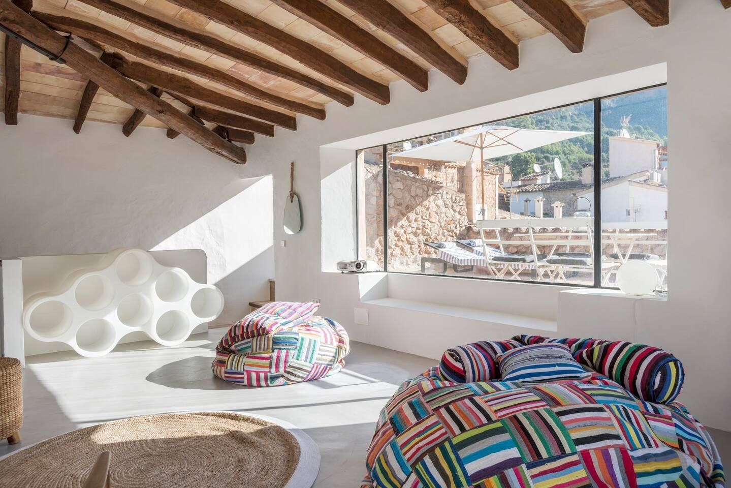 The white-washed nooks and crannies created in the 11th century have been modernised, but, with terracotta tiles, wood beams and honey-brown stone walls it still feels like an old Moorish retreat. Admire the mountains from the fragrant, bougainvillaea-shaded terrace with a barbecue on the go. Cool off in the plunge pool, surrounded by boho loungers. Get your yoga mat out in the studio and project your class on the walls before refreshing under the outdoor rooftop shower. This bean-bag-filled room doubles as a boho cinema pad too.