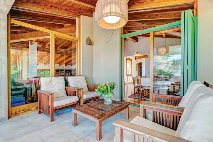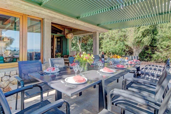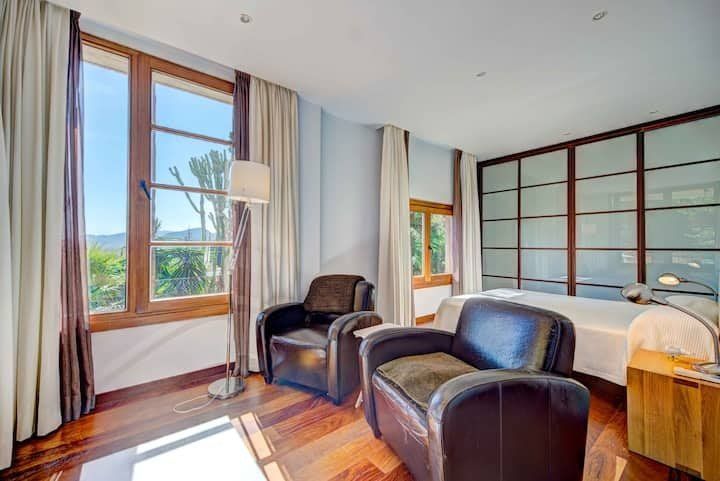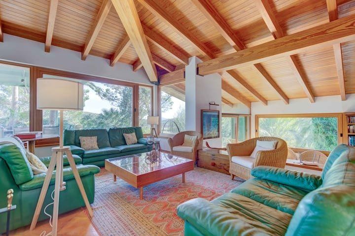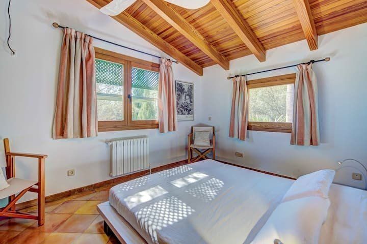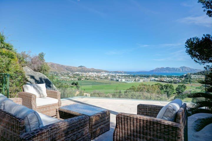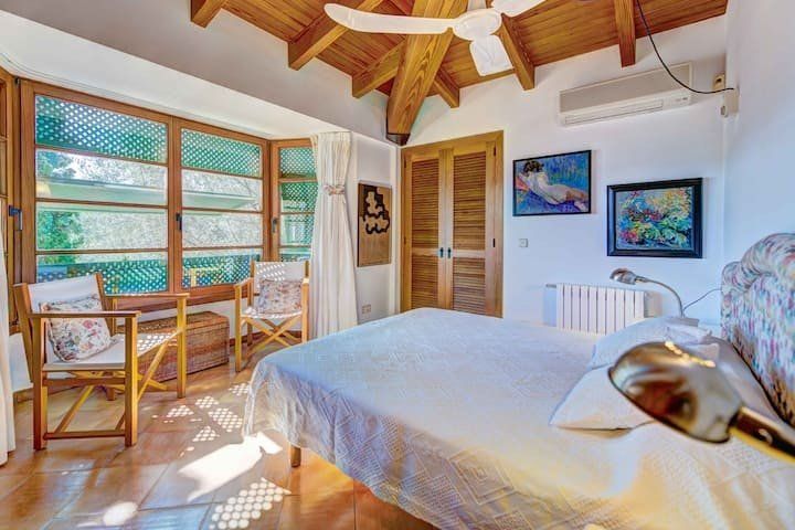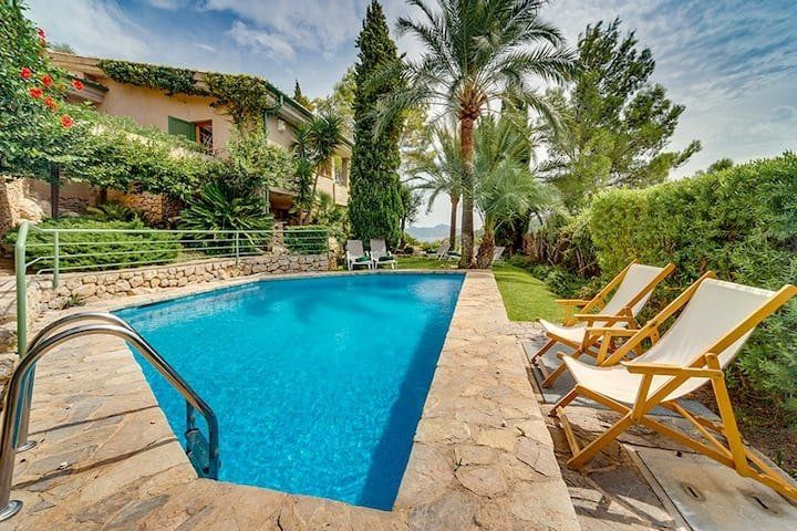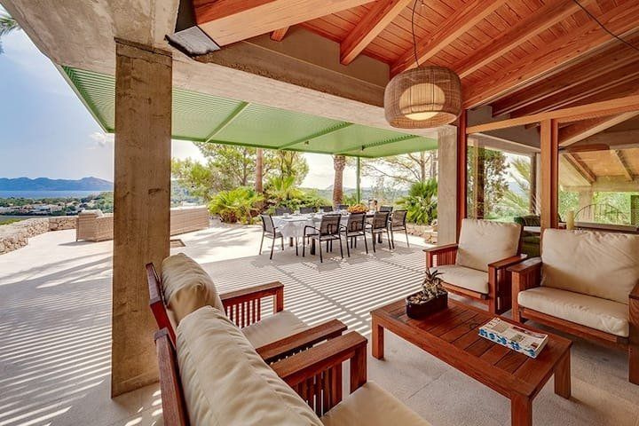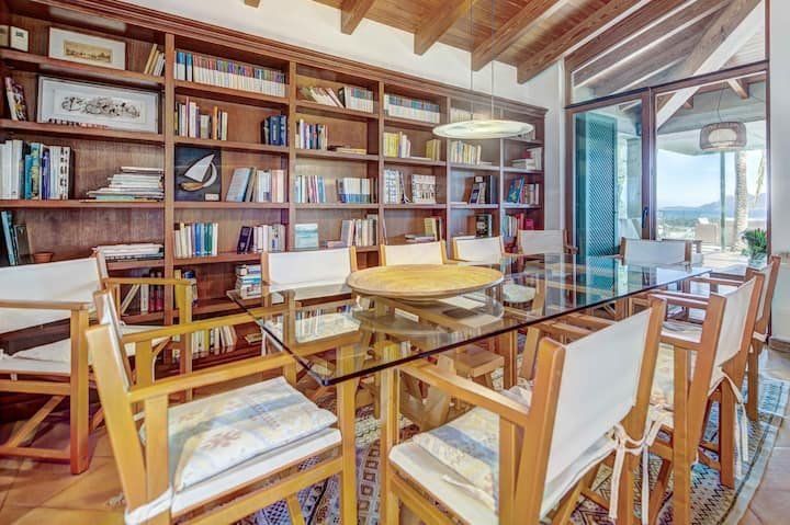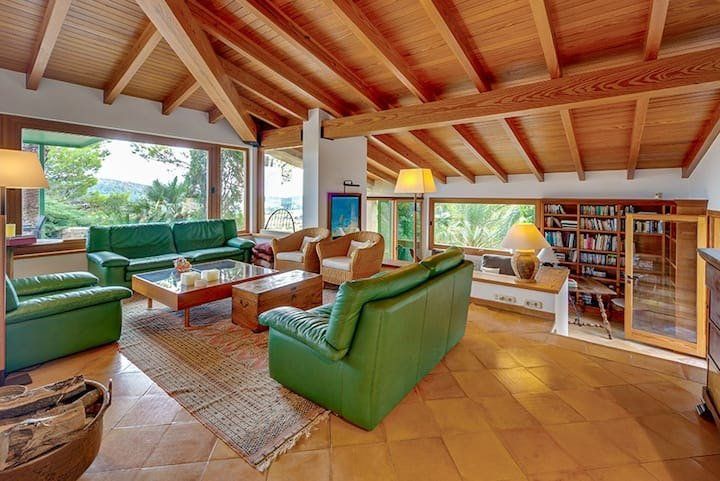 Overlooking the Bay of Pollensa, this villa surely has one of the best and most sought-after positions in all of Mallorca. Those panoramic views are complemented by easy access to the local beaches and a five-minute drive into the heart of Pollensa town, while the house itself is no slouch either. With a backdrop of palm trees and lush vegetation, this well-hidden home offers privacy and seclusion in a popular area of the island. Inside, there’s a subtle mid-century California vibe, especially in the large living area which features a high, beamed ceiling and low-slung picture windows. The glass dining table is surrounded by director’s chairs, and there’s a well-stocked bookcase to offer entertainment to the avid readers in your group. Of course, you may want to eschew indoor eating for out – there are several terraces to choose from when it comes to alfresco dining, and you’ll want to make sure to try out each one as they all offer a slightly different angle to that spectacular view.