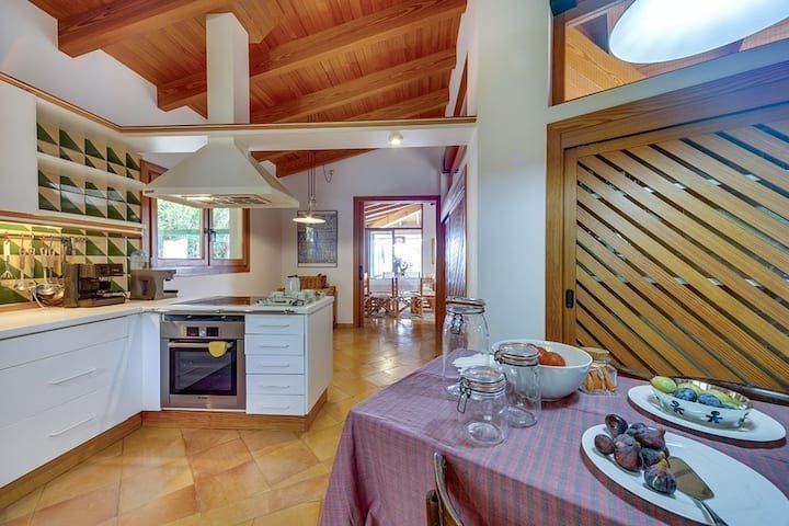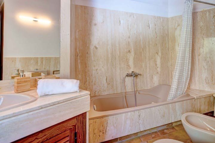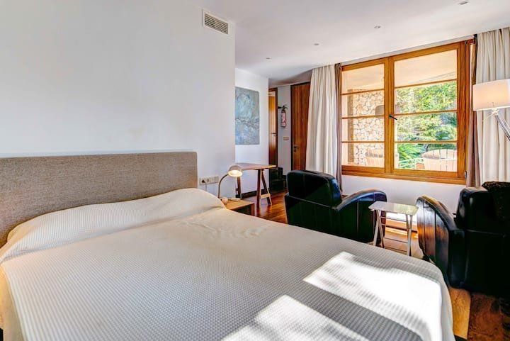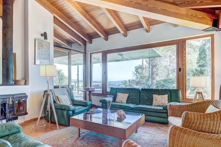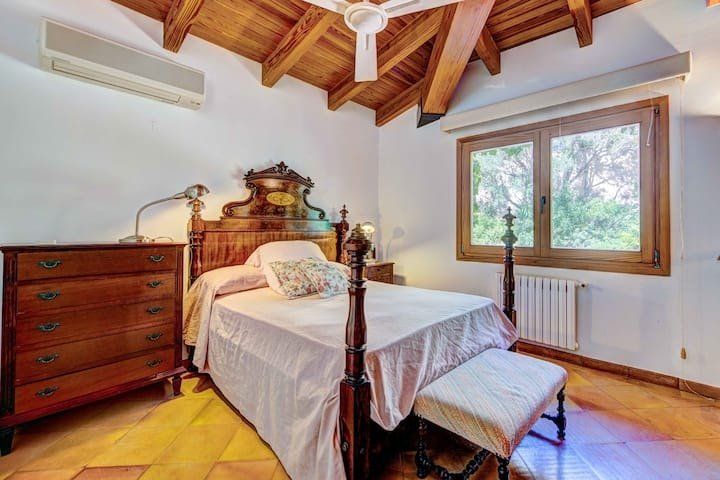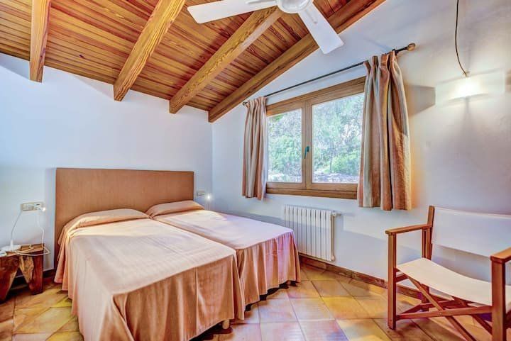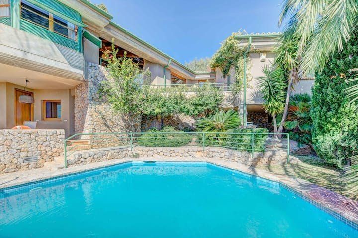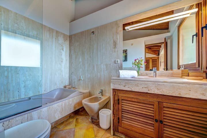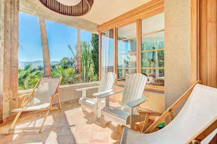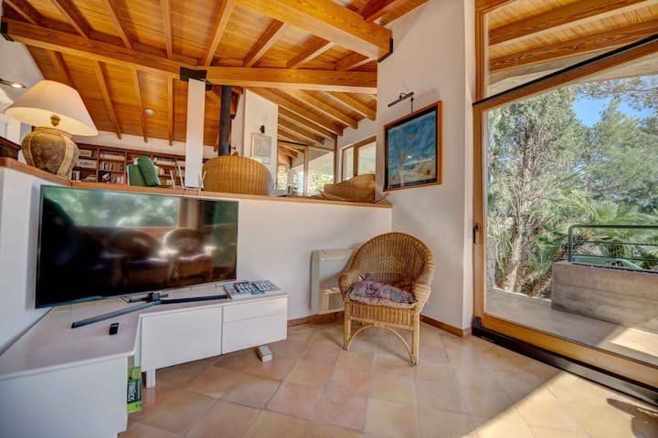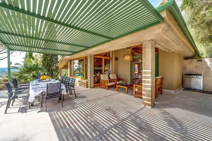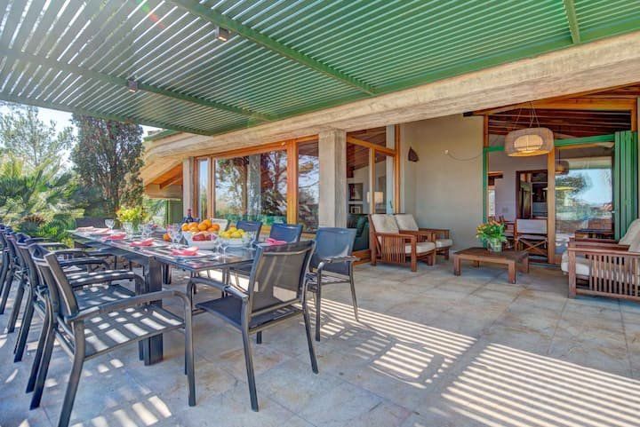 Overlooking the Bay of Pollensa, this villa surely has one of the best and most sought-after positions in all of Mallorca. Those panoramic views are complemented by easy access to the local beaches and a five-minute drive into the heart of Pollensa town, while the house itself is no slouch either. With a backdrop of palm trees and lush vegetation, this well-hidden home offers privacy and seclusion in a popular area of the island. Inside, there’s a subtle mid-century California vibe, especially in the large living area which features a high, beamed ceiling and low-slung picture windows. The glass dining table is surrounded by director’s chairs, and there’s a well-stocked bookcase to offer entertainment to the avid readers in your group. Of course, you may want to eschew indoor eating for out – there are several terraces to choose from when it comes to alfresco dining, and you’ll want to make sure to try out each one as they all offer a slightly different angle to that spectacular view.