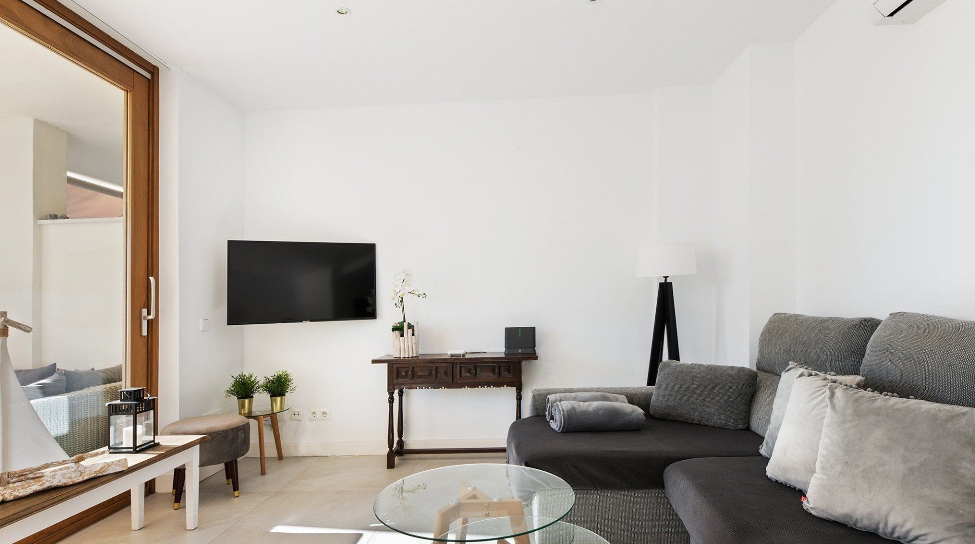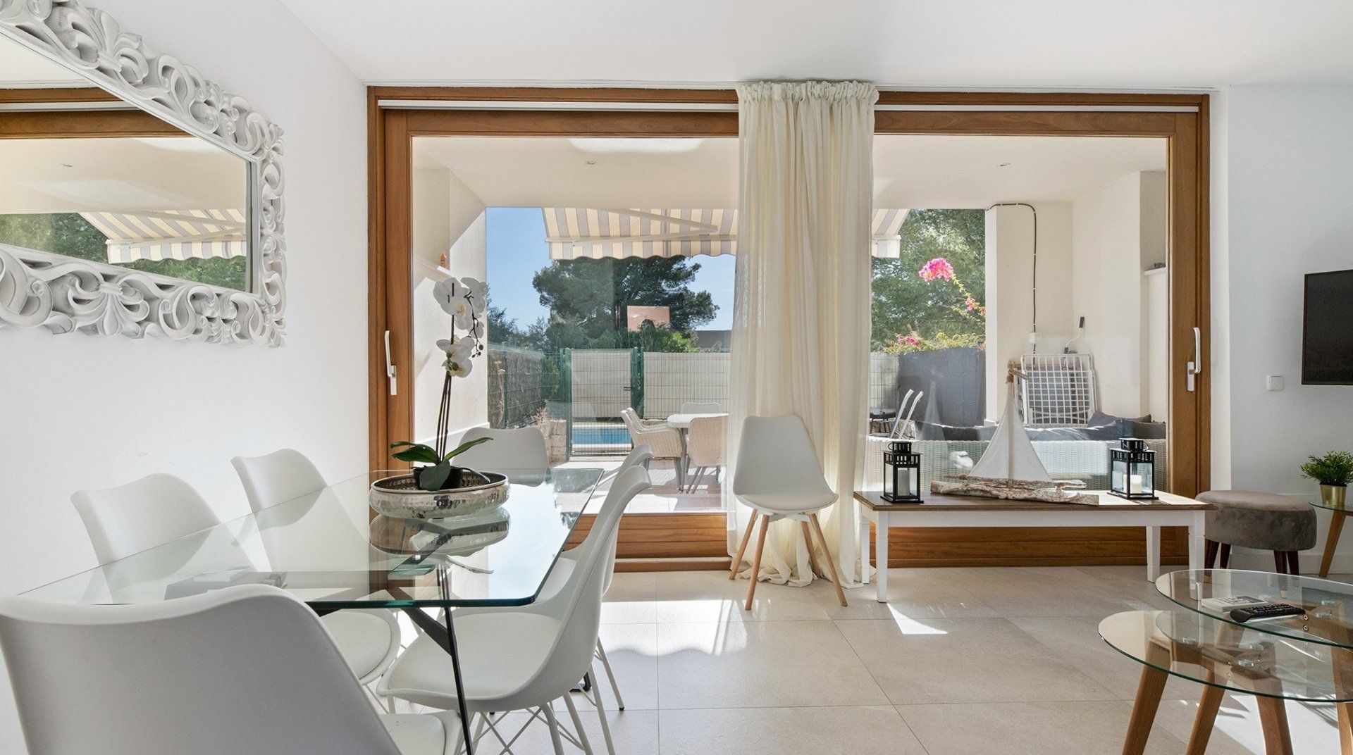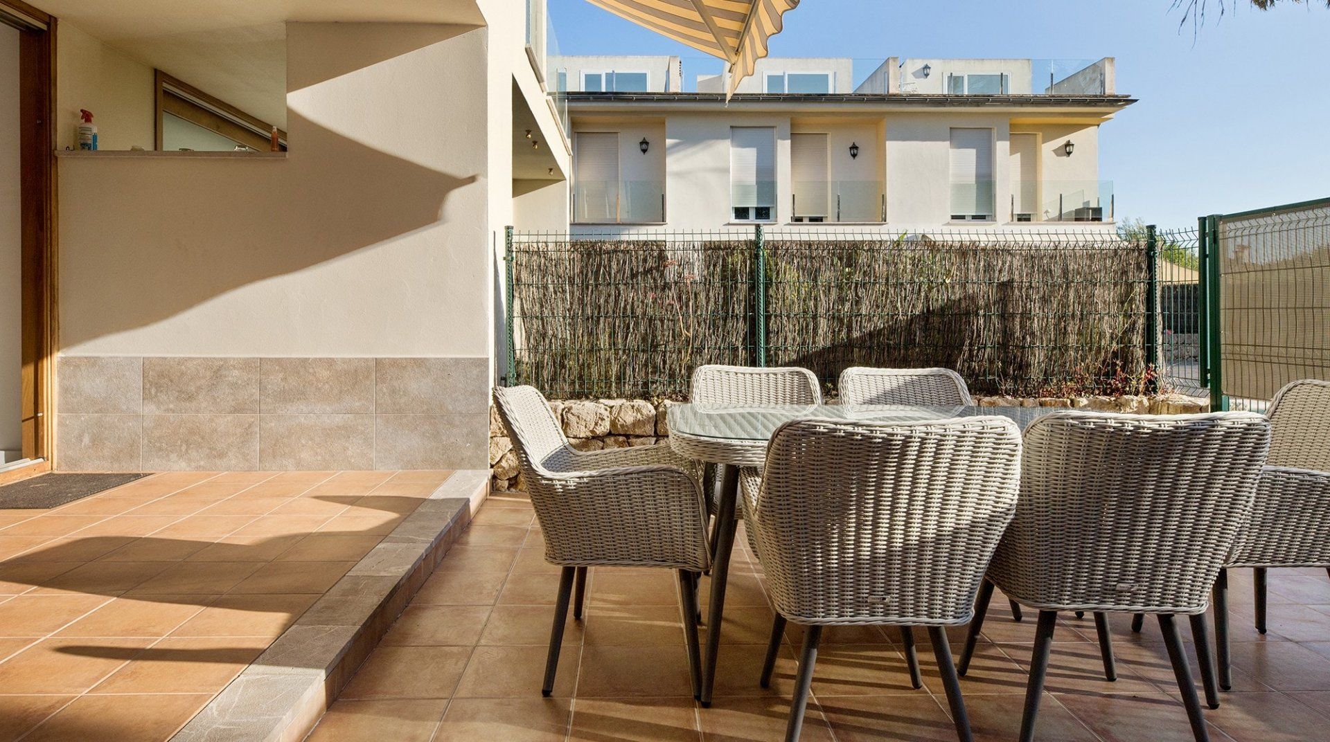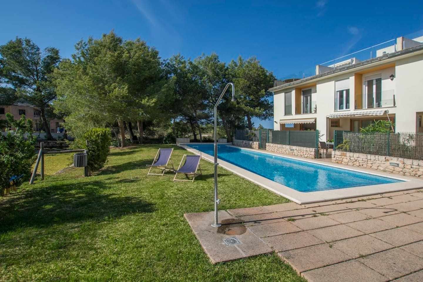 Inside, a monochromatic colour scheme combines with driftwood art and nautical details in the living room which leads out onto a sun-baked patio ready to host alfresco barbecue feasts and plenty of tanning on the sun loungers. Open the gate here to step out onto the shared lawn where a glistening communal pool awaits luxurious dips in its welcoming waters. Pick a spot on the grass to soak up some more of those Spanish rays and cool off beneath the shared outdoor shower.