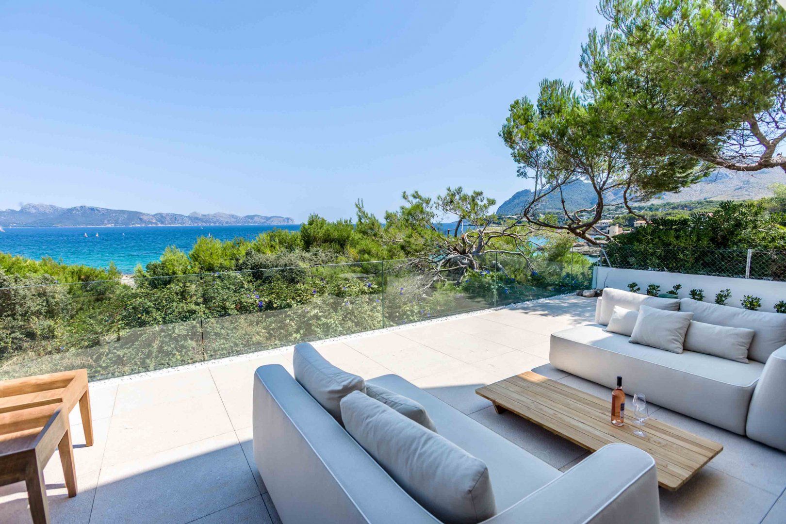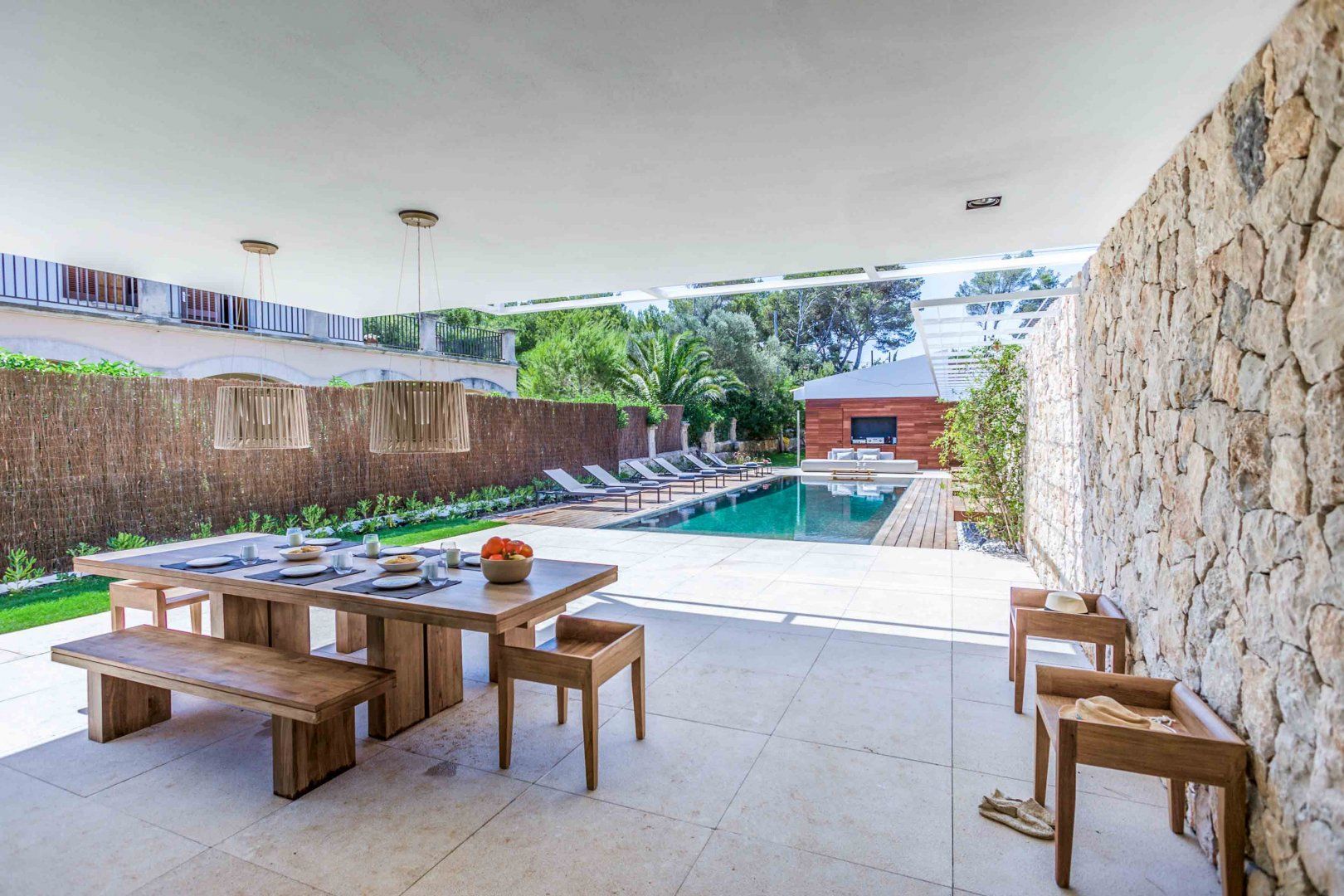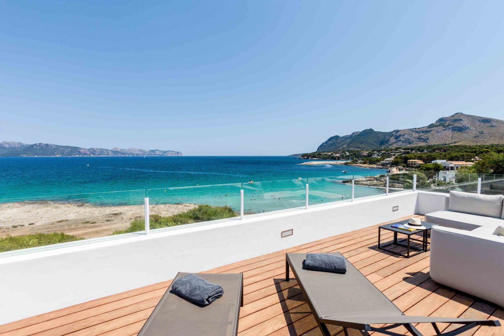 Escape to the beautiful Balearics with a stay in this contemporary villa. Based right on the water, in the affluent Mal Pas neighbourhood, you’ve got direct beach access to Sant Pere and Sant Joan. Here you’ll find white sands, turquoise seas that are perfect for snorkelling and rustic beach bars serving ice-cold beers. The villa is a real head-turner, with angular shapes, and sightlines straight through the living area to the ocean and mountains. Interiors are modern with design-forward furniture in neutral tones and a white gloss kitchen, but the exposed blonde stone gives a nod to traditional Mallorcan architecture. The oh-so-chic pool area has us wanting to break out the bikini right away, and there couldn’t be a dreamier place to top up the tan than the roof terrace, with its shimmering vista. Be the first to hit the beach and the last to leave, with a quick break for lunch on the shady terrace. Come sundown, the roof terrace beckons, for sangria and nibbles.