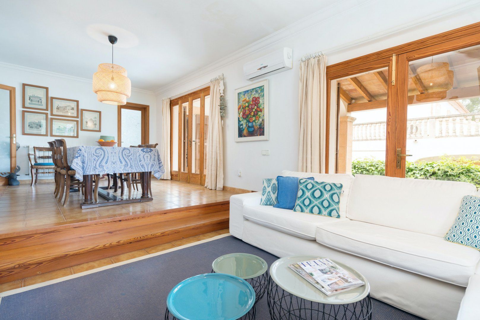 This semi-detached villa, situated in the desirable residential area of Mal Pas, has Mediterranean Sea glimpses through the trees from its terrace. There’s a pretty garden to relax in, too, as well as plenty of room to dine on the spacious covered veranda for all your family or friends. Inside, it’s a bit dated, especially the kitchen and another thing to note is there’s no swimming pool. Though there’s a very big pool (the sea) close by at Sant Pere beach (under 100 metres away).
