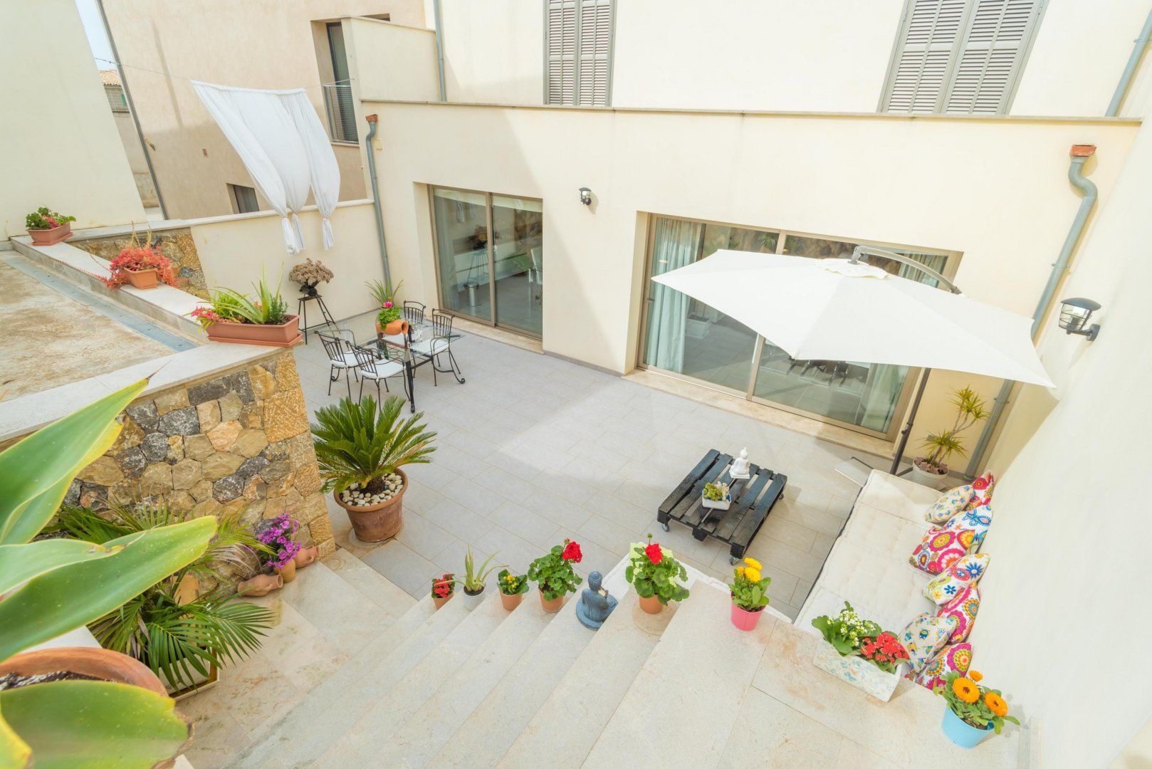 Tucked away in Maria de la Salut – a small hilltop town in central Mallorca – this cosy home for two is a wonderful pied-à-terre. Modern comfort and traditional style blend beautifully, with crisp, clean interiors that enhance the beauty of the traditional stonework of the terrace.