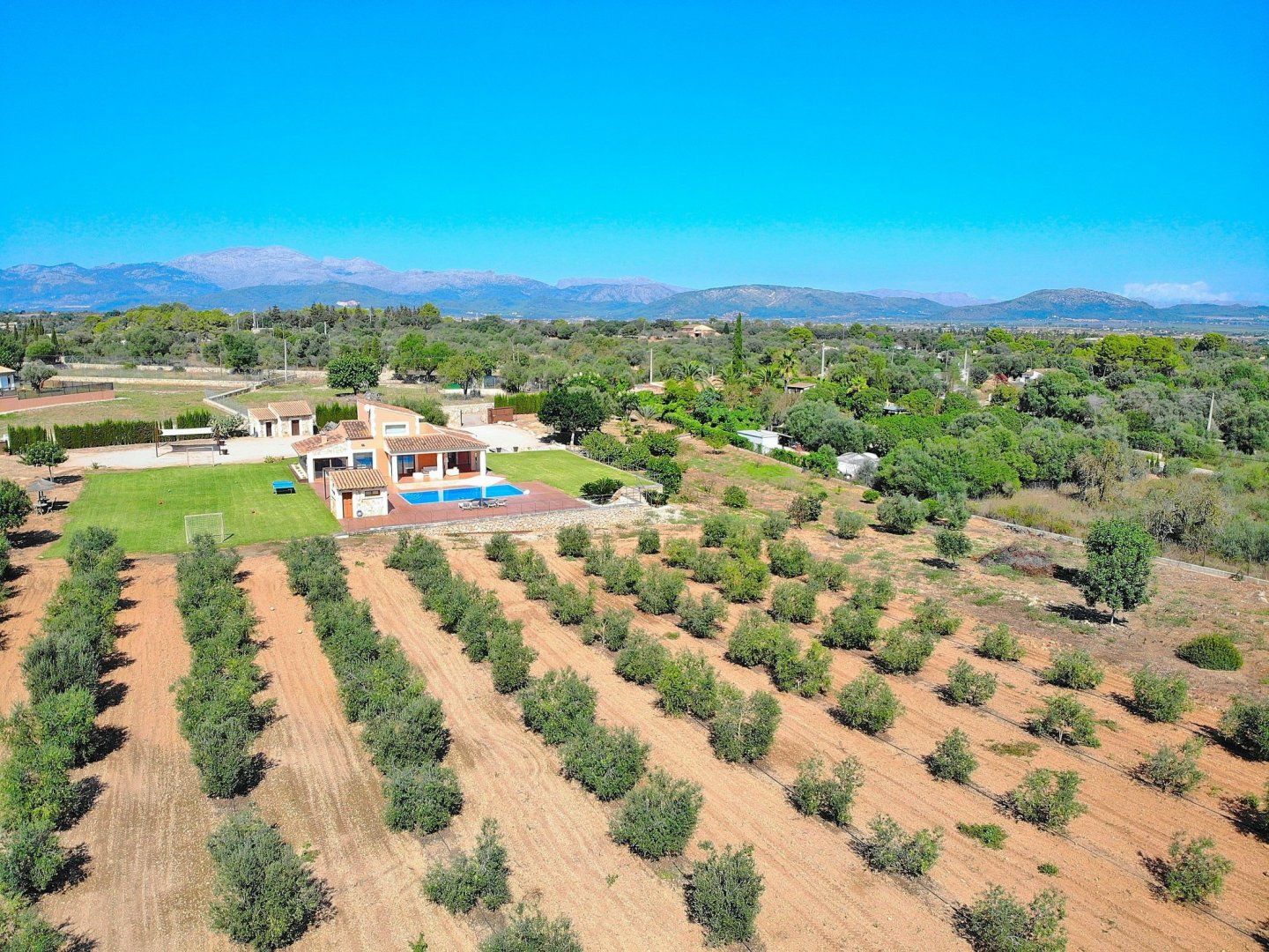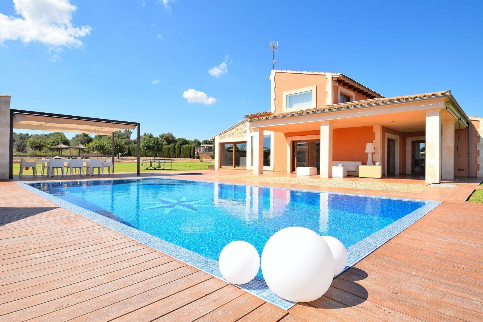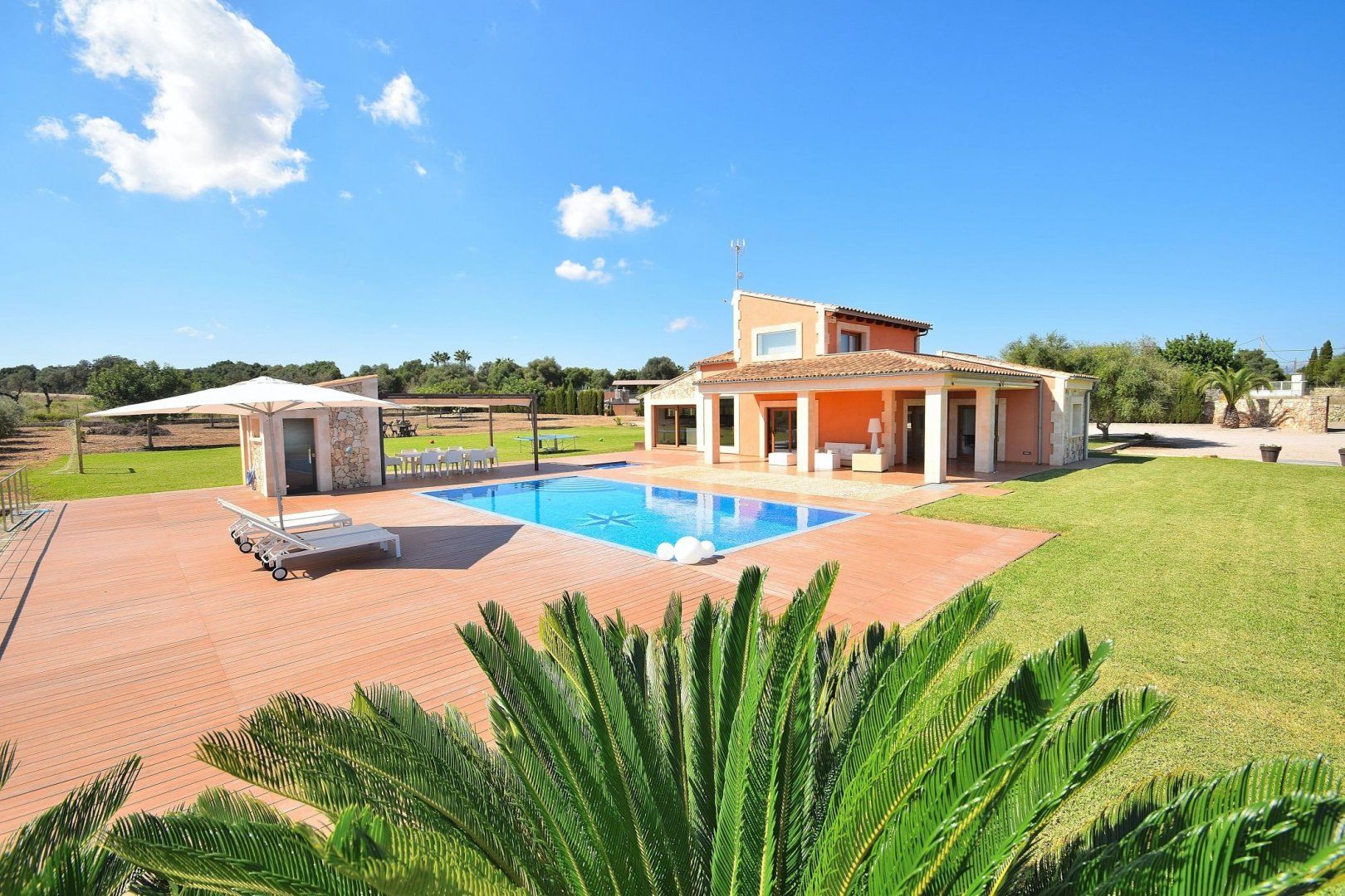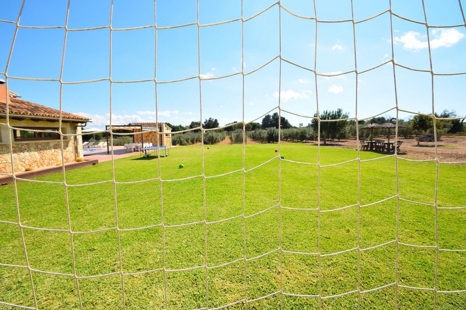 This beautiful modern villa is situated in the heart of Muro, Mallorca, and enjoys majestic views of the surrounding mountains. Traditional on the outside, yet sleek and modern on the inside, you'll easily get the most out of your holiday at this gorgeous home. Whether you're going for a float in the clear blue waters of the pool or waking up to the bright sunshine streaming through the windows, that holiday feeling will follow you wherever you go. Step into the Jacuzzi and let the bubbling water relax your muscles, or play a game of football with the kids with the goals that make a small pitch in the garden. If football isn't your thing, why not go for a round of table tennis once everyone's finished a hearty supper under the covered terrace? Whether you prefer to cook a feast in the fully-equipped kitchen indoors or on the barbecue outside, that's up to you.