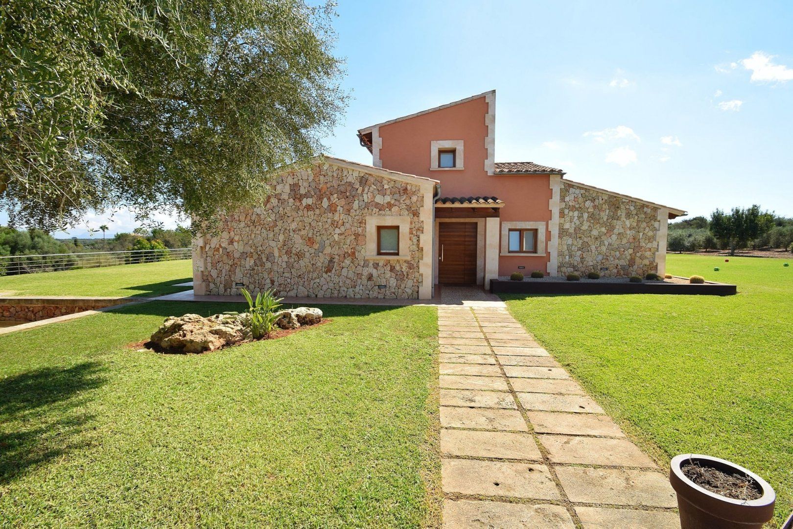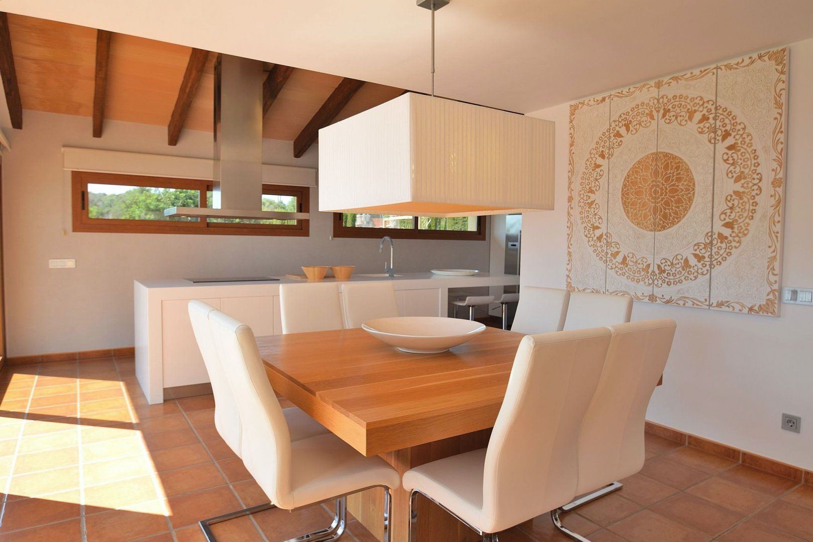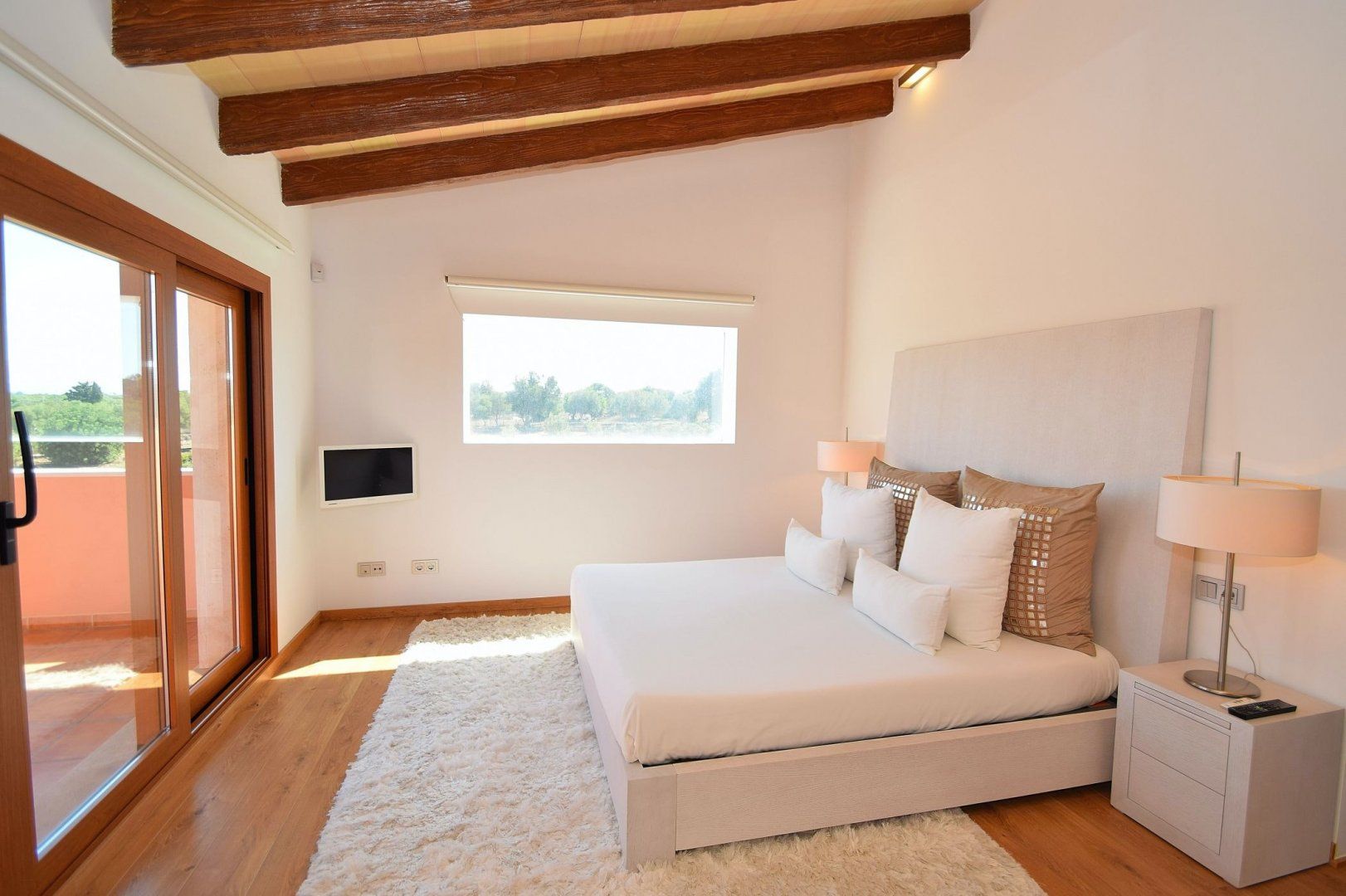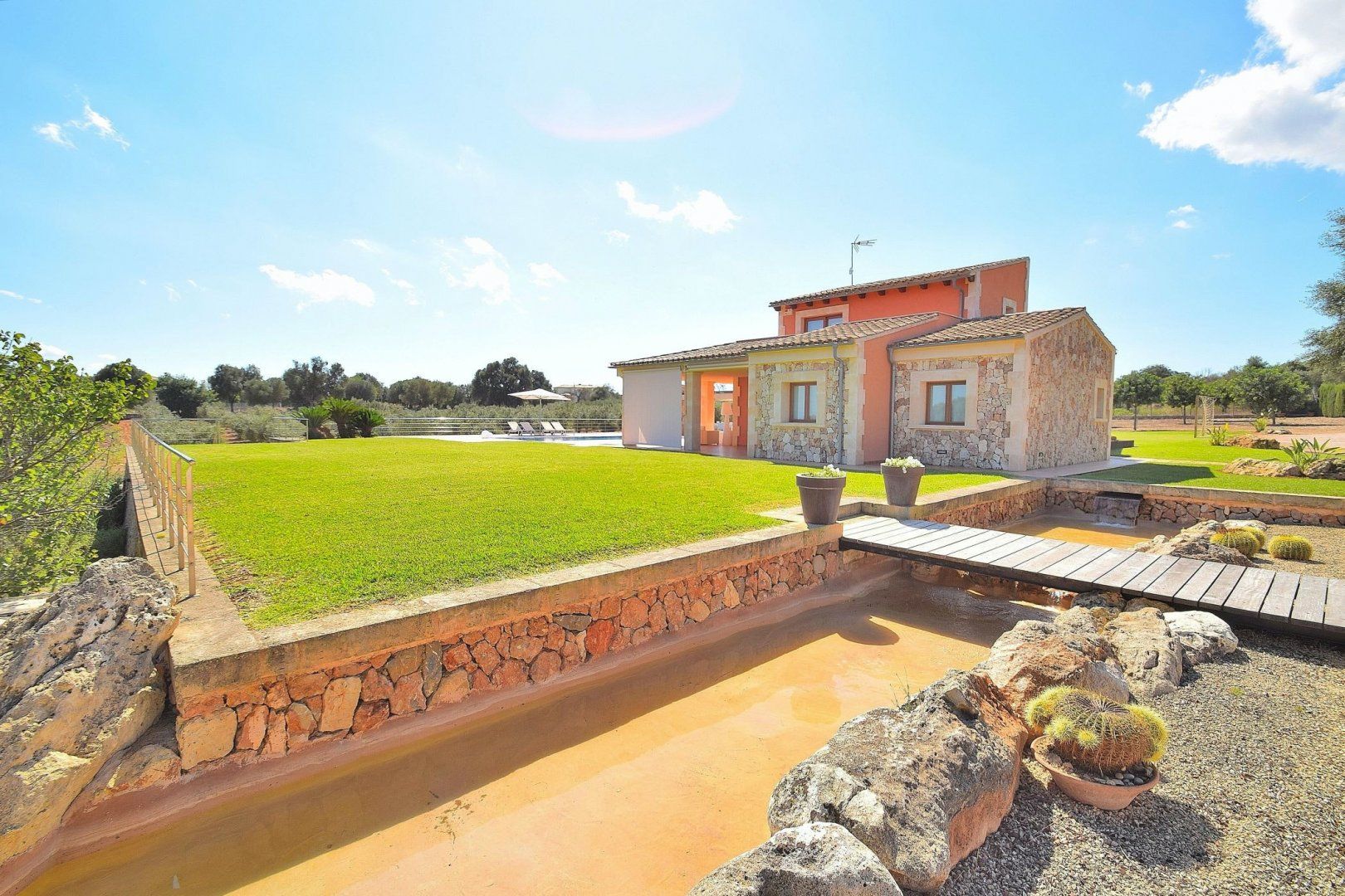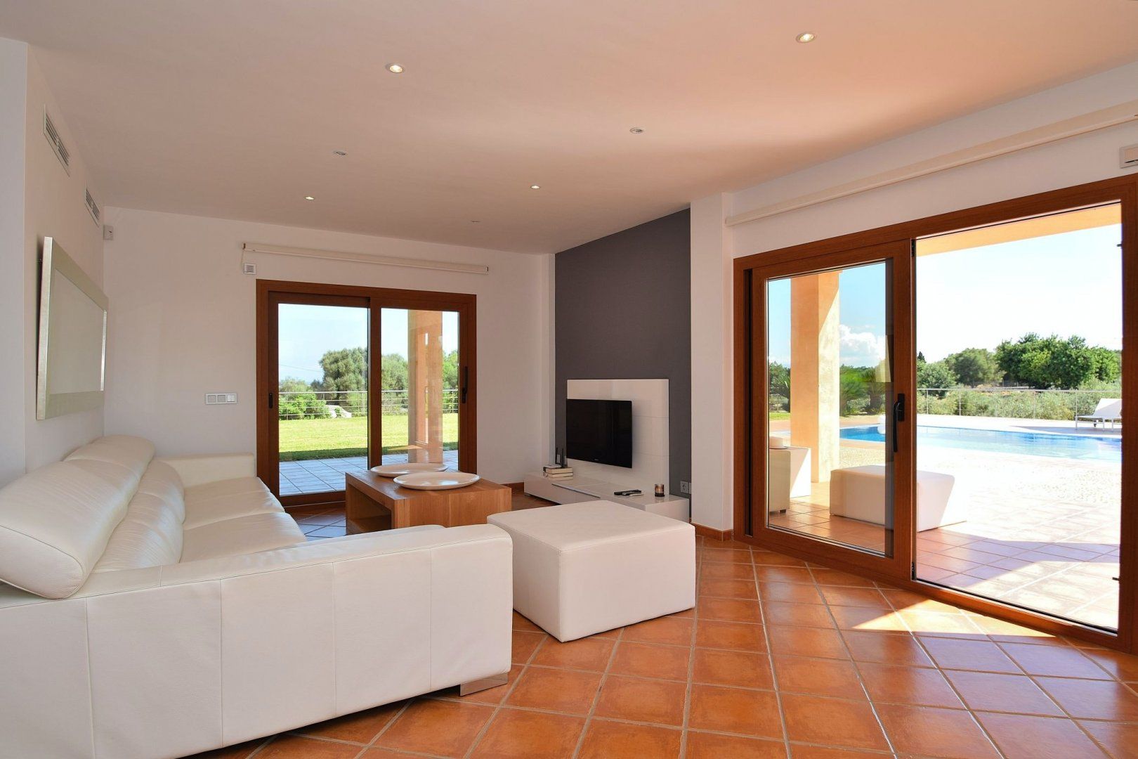 This beautiful modern villa is situated in the heart of Muro, Mallorca, and enjoys majestic views of the surrounding mountains. Traditional on the outside, yet sleek and modern on the inside, you'll easily get the most out of your holiday at this gorgeous home. Whether you're going for a float in the clear blue waters of the pool or waking up to the bright sunshine streaming through the windows, that holiday feeling will follow you wherever you go. Step into the Jacuzzi and let the bubbling water relax your muscles, or play a game of football with the kids with the goals that make a small pitch in the garden. If football isn't your thing, why not go for a round of table tennis once everyone's finished a hearty supper under the covered terrace? Whether you prefer to cook a feast in the fully-equipped kitchen indoors or on the barbecue outside, that's up to you.