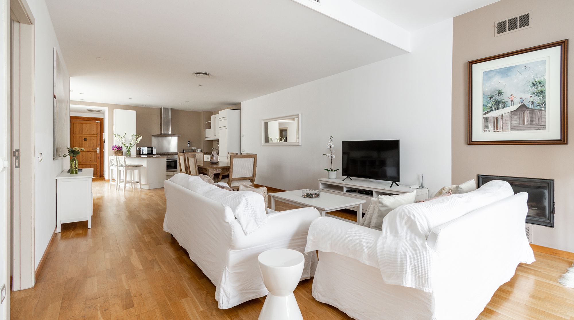 Back at this home, housed in a beautiful 18th-century mansion, open up the French doors to the balcony – they allow light to flood into the open plan living space. A neutral colour scheme, plants, and flowers create a calm and welcoming space. We were surprised when we were here how quiet it was considering its fabulous, central location. This place is perfect for a family, group of friends or business colleagues who want to be in the heart and soul of Palma.