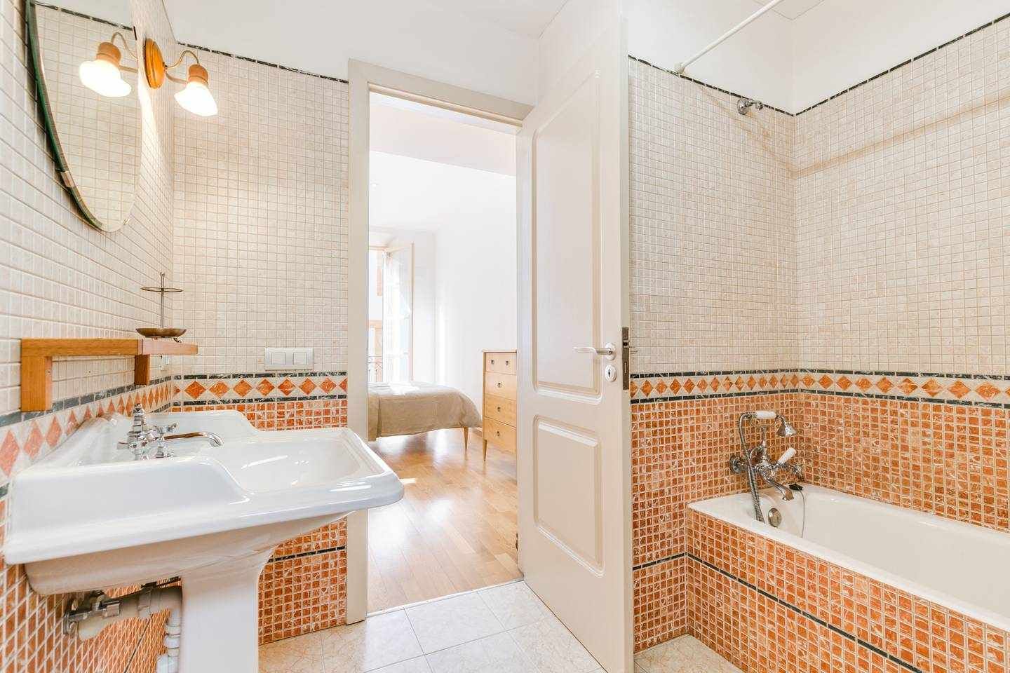 That's not to say it's completely anonymous, though. There are some Asian influences in the decorations, particularly the elephant statue and the orange patterned rug. We're also big fans of the intricate mosaic tiling in the bathroom too, also in sunset tones.