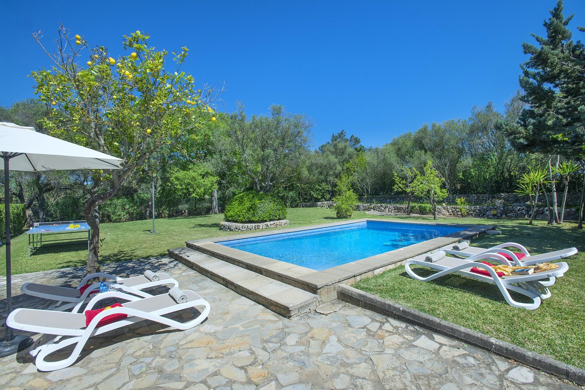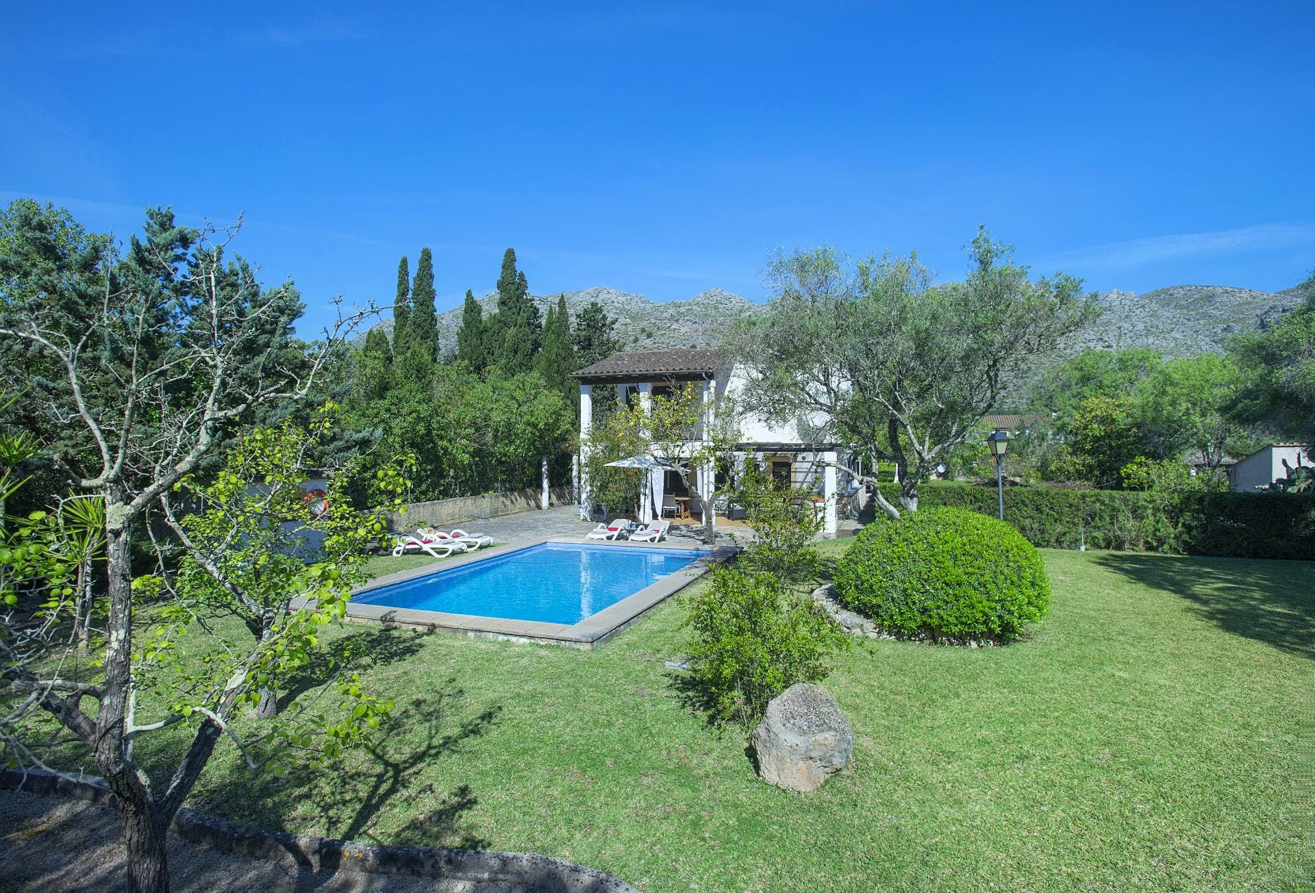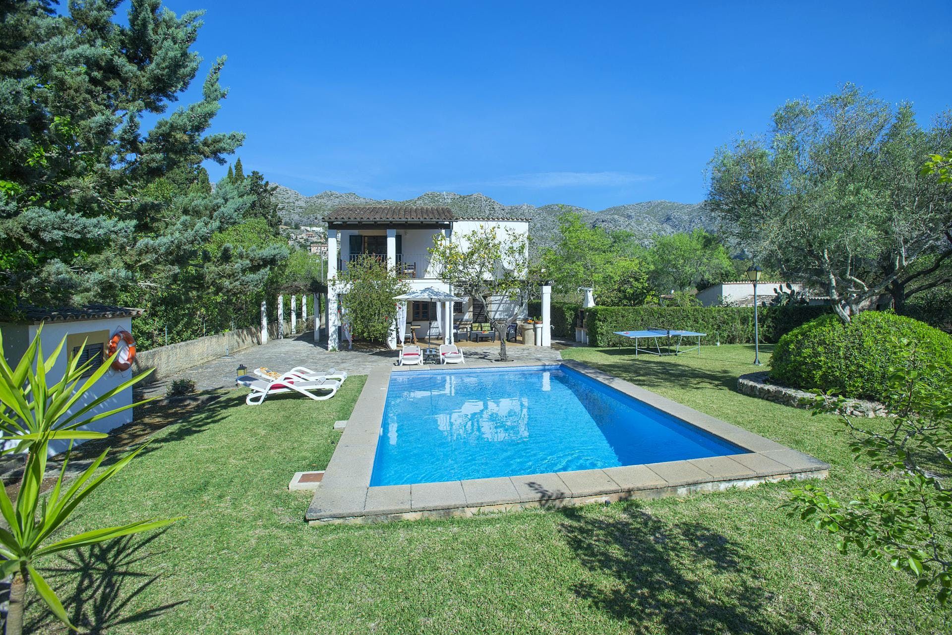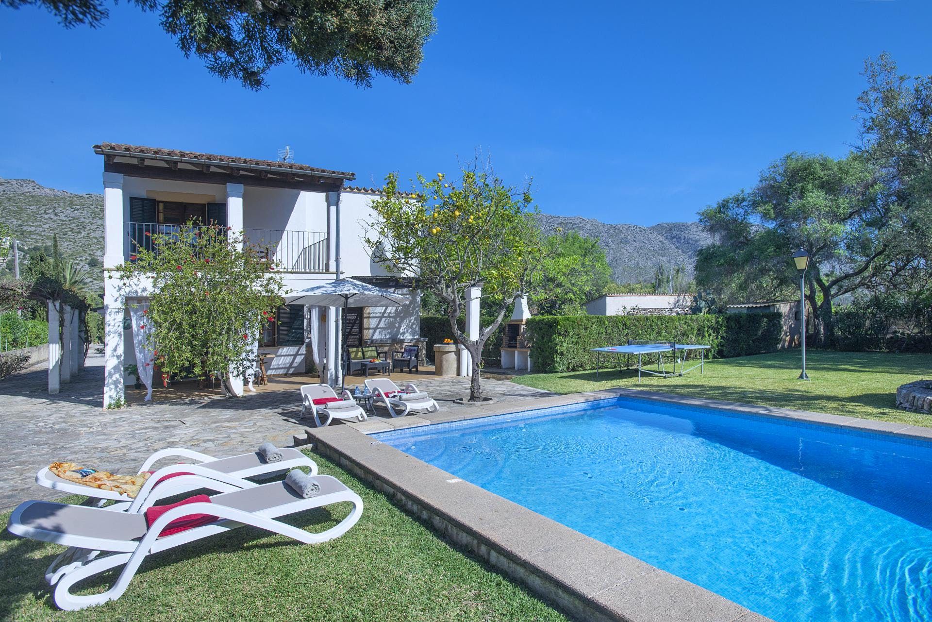 Sitting at the end of a quiet country lane in La Font, this villa invites ample relaxation within its lush green grounds. A private pool takes centre stage in its outdoors, with a shaded alfresco dining spot and a plethora of sun loungers completing the idyllic scene. A blend of contemporary and traditional decor can be found inside, with beamed ceilings and practical furnishings providing a warm welcome. And the upstairs main bedroom offers a private terrace – ideal for enjoying a sundowner while taking in views over the verdant grounds. When you’re not spending time at home, hop in the car to explore Pollença Town (less than a ten-minute drive) or make a beeline for Port de Pollença with its stretch of sandy shoreline.