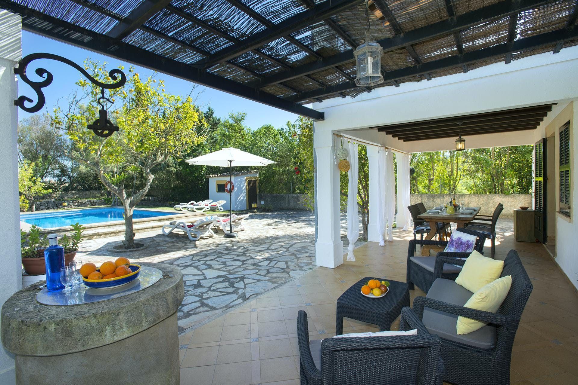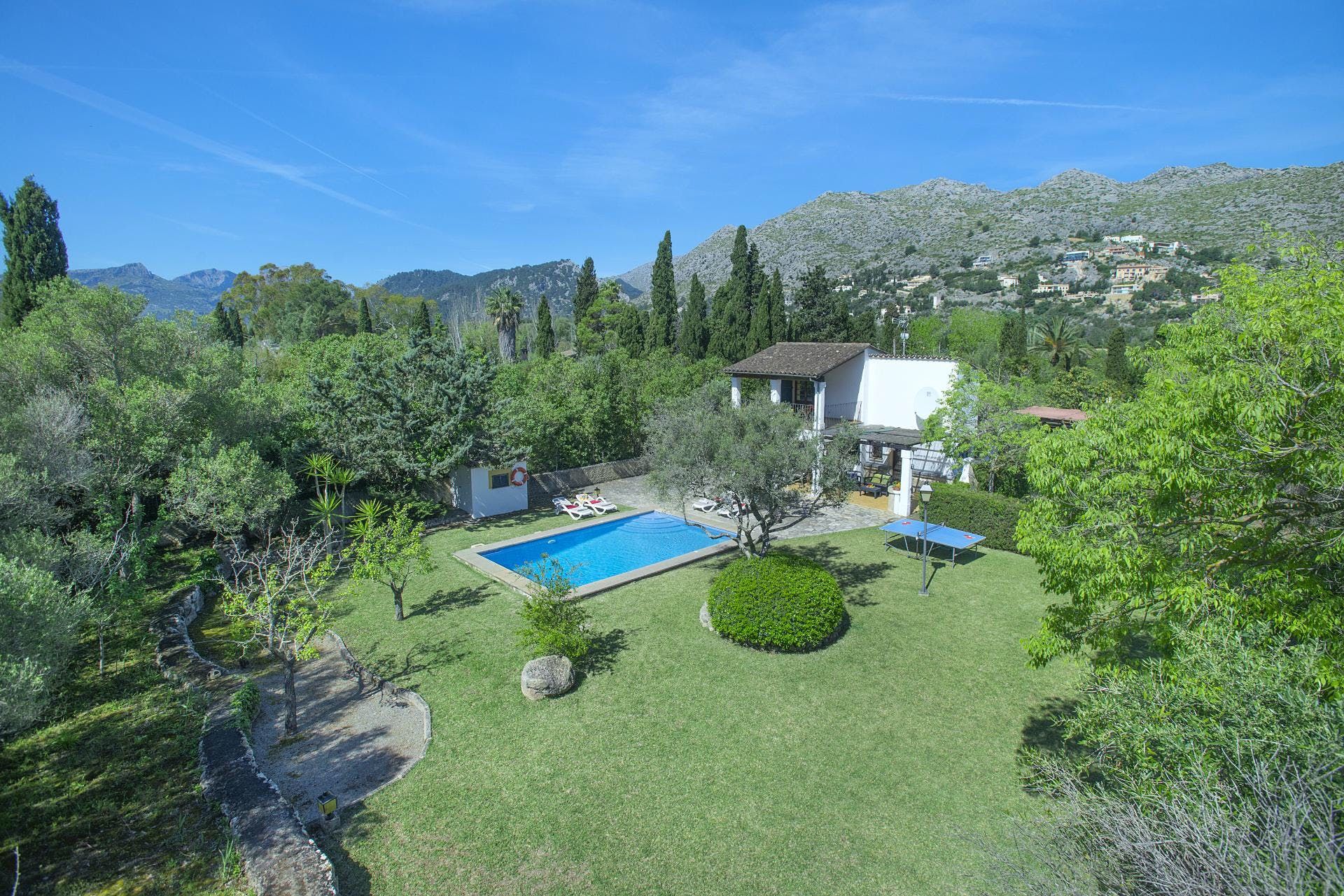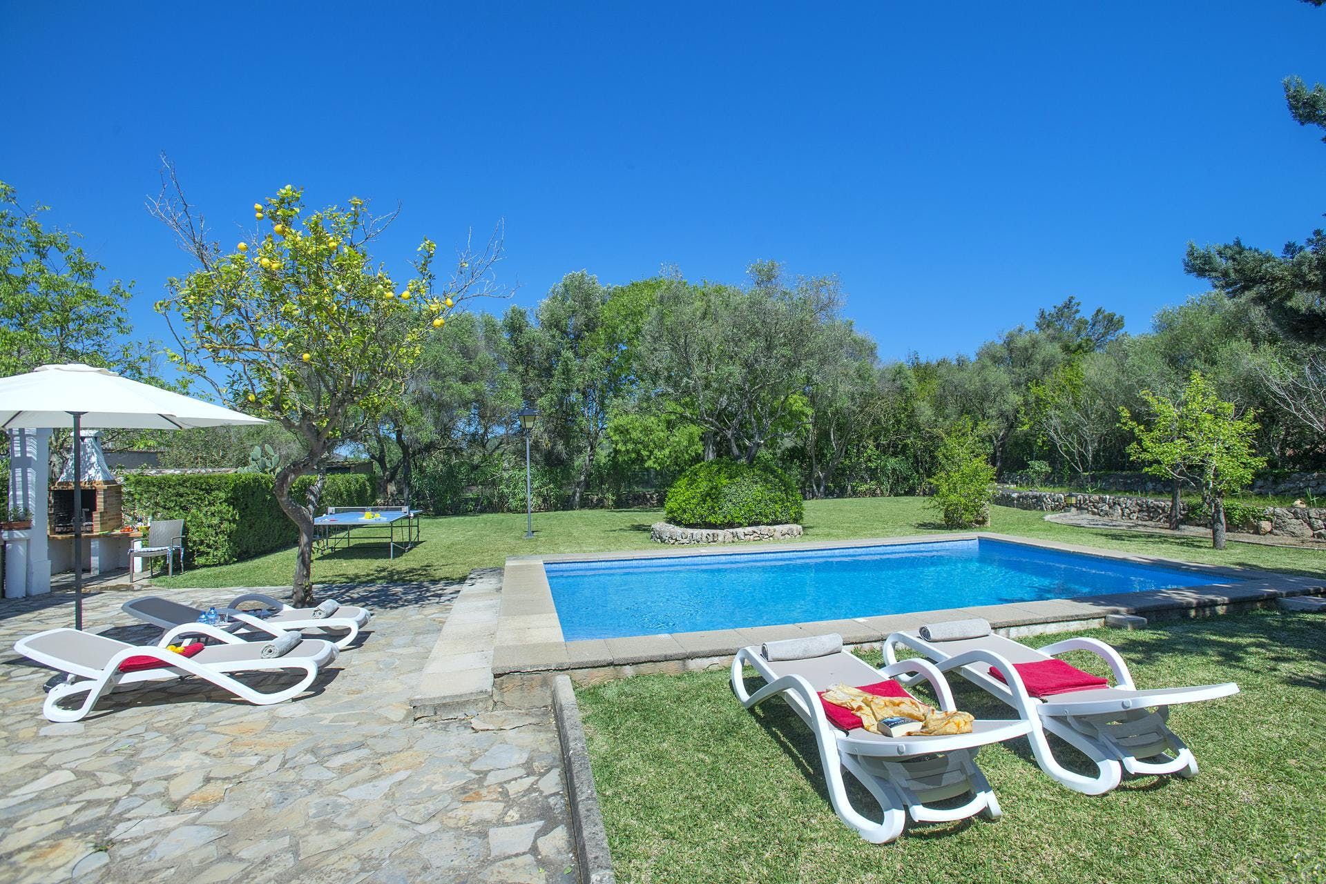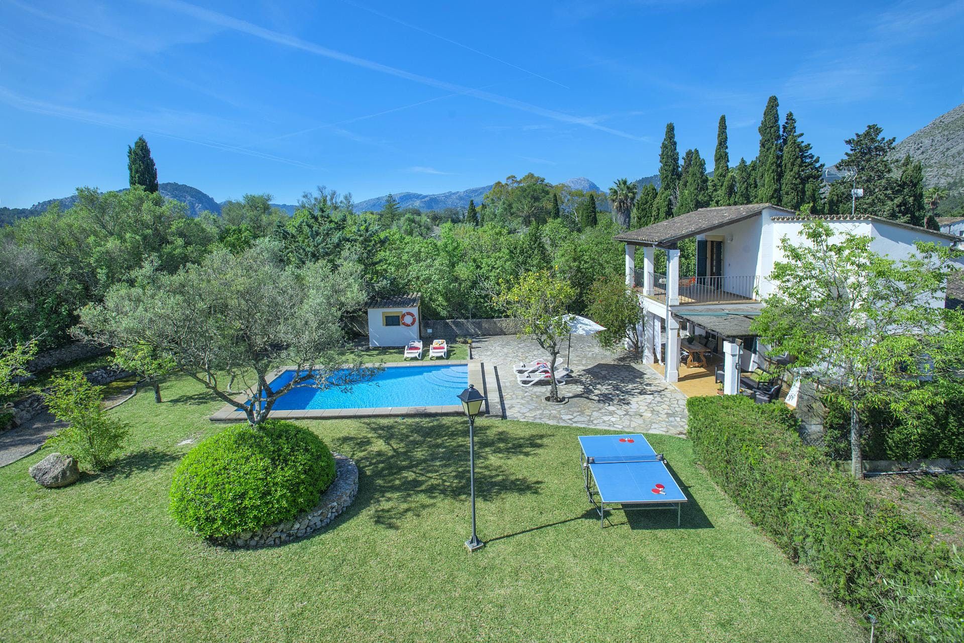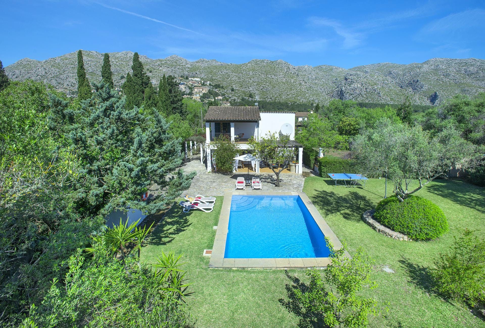 Sitting at the end of a quiet country lane in La Font, this villa invites ample relaxation within its lush green grounds. A private pool takes centre stage in its outdoors, with a shaded alfresco dining spot and a plethora of sun loungers completing the idyllic scene. A blend of contemporary and traditional decor can be found inside, with beamed ceilings and practical furnishings providing a warm welcome. And the upstairs main bedroom offers a private terrace – ideal for enjoying a sundowner while taking in views over the verdant grounds. When you’re not spending time at home, hop in the car to explore Pollença Town (less than a ten-minute drive) or make a beeline for Port de Pollença with its stretch of sandy shoreline.