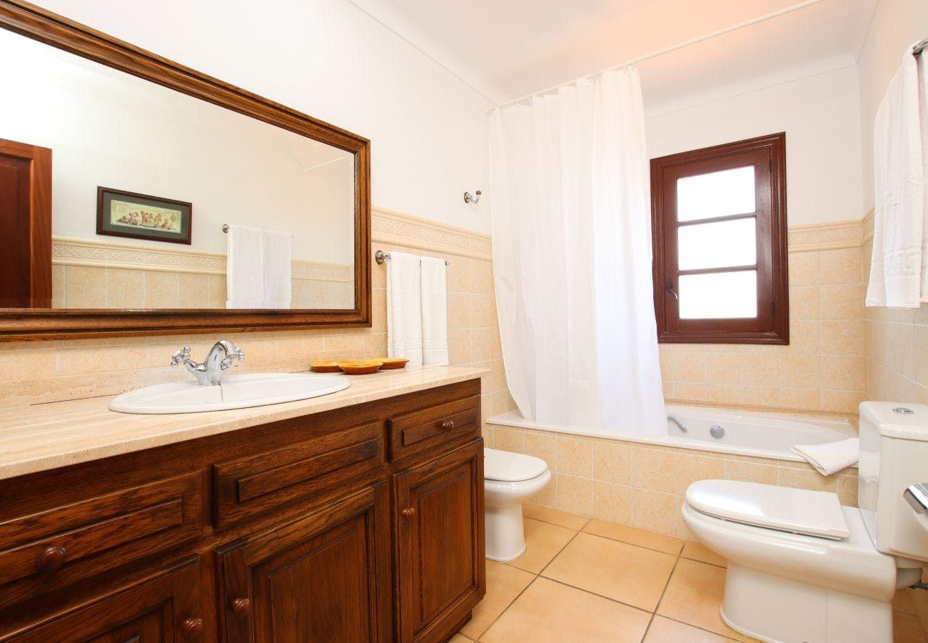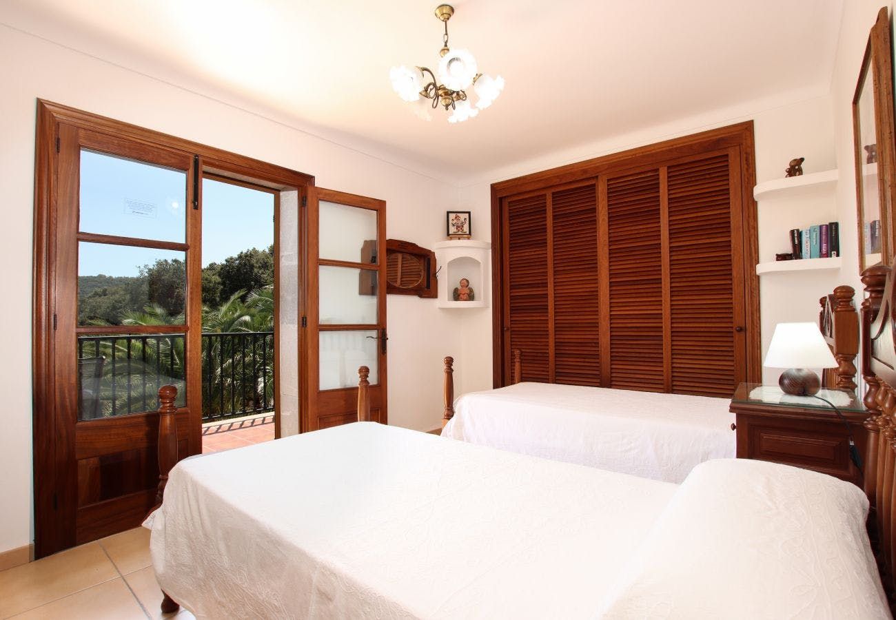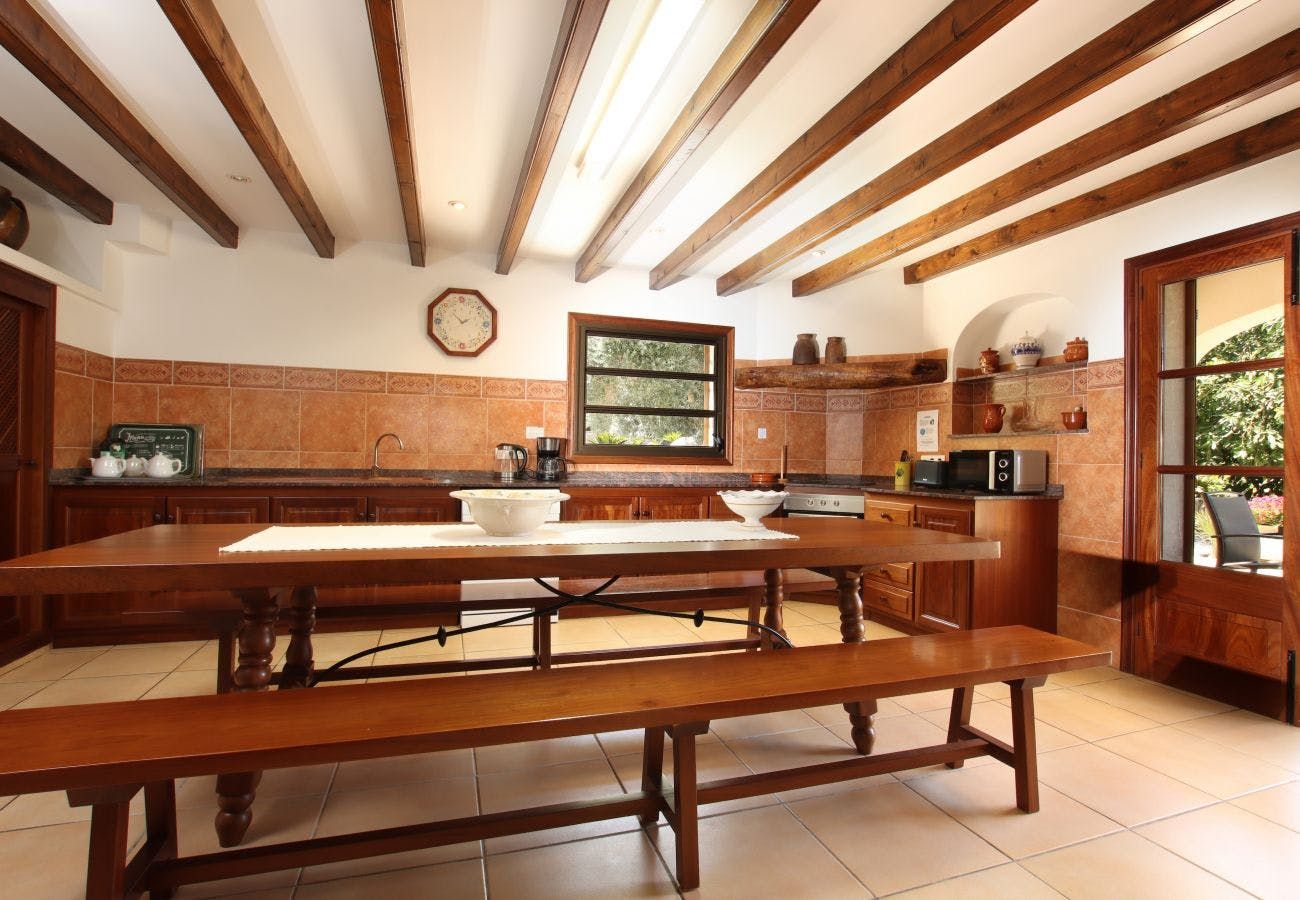 Stepping past the traditional stone facade, you’ll find two cosy living rooms to choose from where gnarled wood beams are on display alongside an old brick fireplace. The second sitting room, upstairs, houses an upright piano for an evening sing-along. The huge, picnic-style table in the kitchen is the ideal spot for breakfast and a more formal dining room can handle evening meals of sopas mallorquinas and bread drizzled with olive oil. The old-world charm continues in bedrooms where mahogany accents keep things classy.