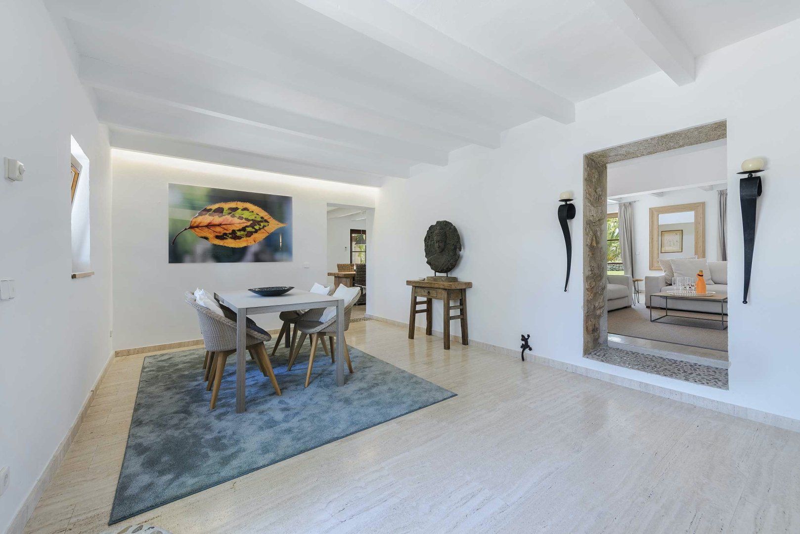 Offering a stunning mountain view and its very own private saltwater swimming pool, as well as a convenient location close to Pollensa golf course and a whole host of handy amenities and entertainment options including table tennis, this recently renovated cosy country villa in the Mallorcan countryside provides the perfect place to relax, unwind, and familiarise yourself with this magical Balearic Island. The interiors of this home feel bright, airy, and inviting, exuding an easy and quintessentially Spanish charm with a thoroughly modern twist. We especially love the impressive lounge area – which, with its double-height ceilings and a carefully curated selection of elegant furnishings, rightfully forms the heart of this wonderful villa.