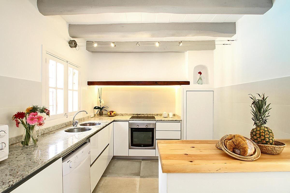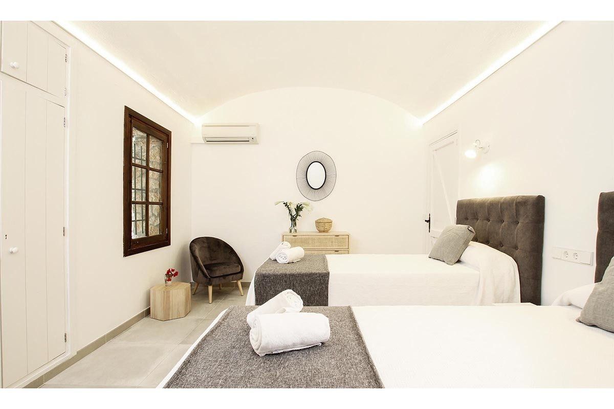 Inside, the home is contemporary but characterful – beam ceilings are combined with Scandi-style furniture, for a really trendy vibe. There's a round dining table that's great for when you want to enjoy Cava and card games in the evenings, and a large lounge where you can all kick back after long days exploring the island.