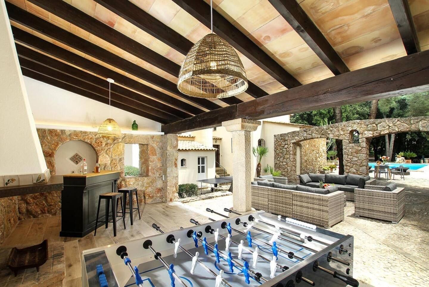 The outdoor areas are the star of the show at this home – you'll find little seating areas scattered everywhere, with places to rest in the peaceful woodland areas, as well as spots to chill out and eat on the shady covered terrace. The pool provides the perfect cooling-off spot on hot days, and there are plenty of poolside loungers for when you want to soak up the sun. There's even a bar where you can mix up cocktails, as well as a football table and ping pong table for when you want to challenge your loved ones to a game.