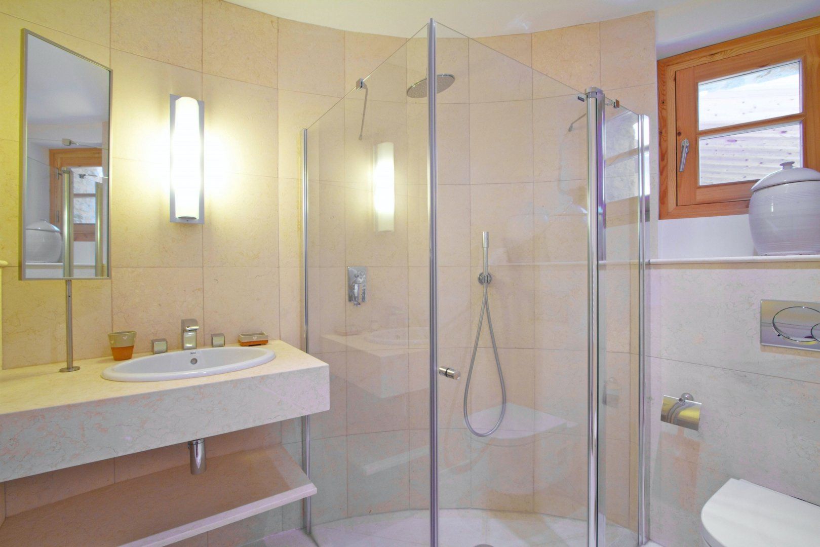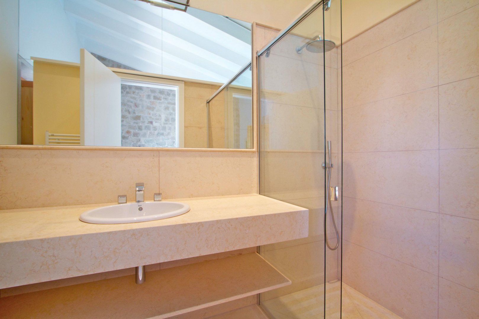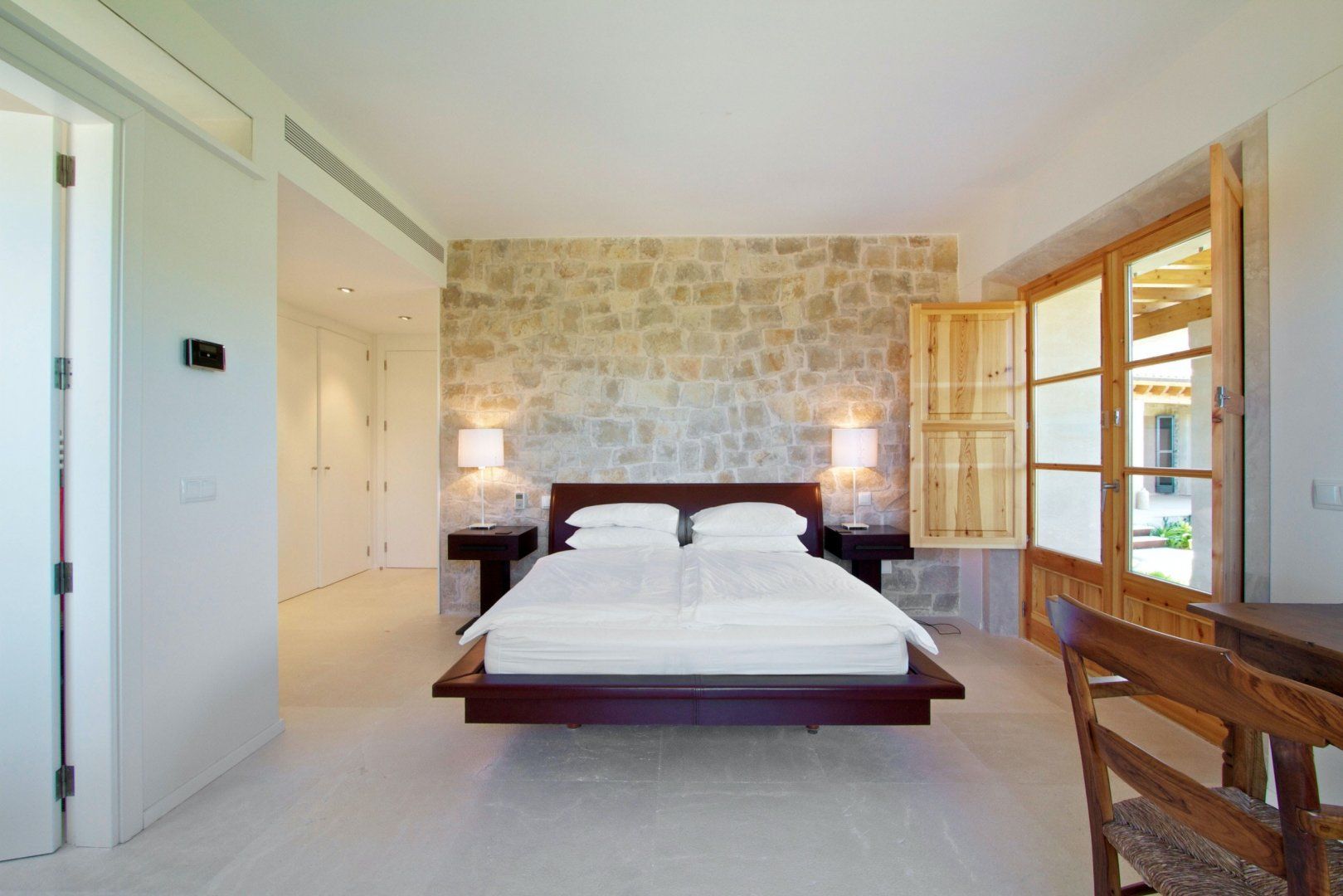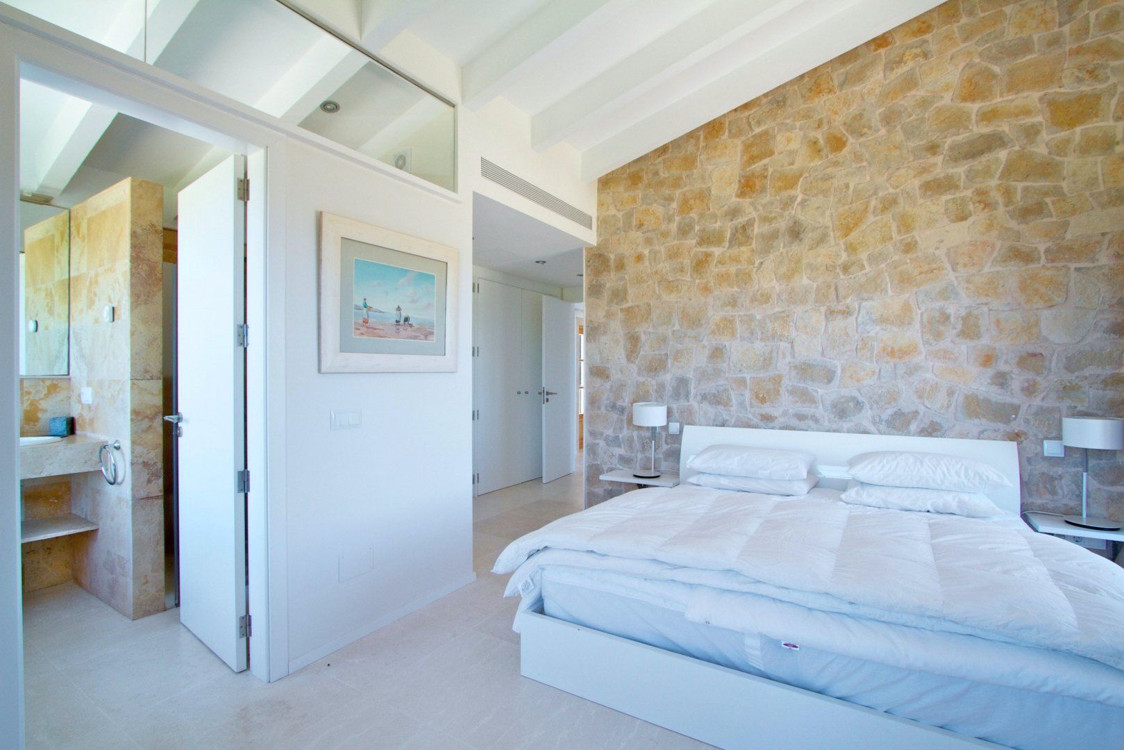 The home itself is bright and inviting thanks to the combination of large windows and whitewashed walls. Flashes of exposed stonework lend a traditional flavour, but otherwise, the choice of furnishings and finishes are contemporary in style, especially the glossy bathrooms and minimalist kitchen.