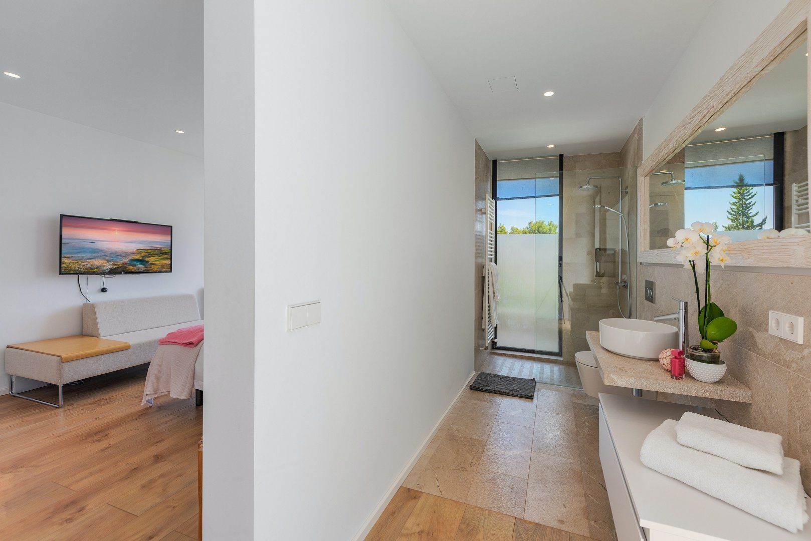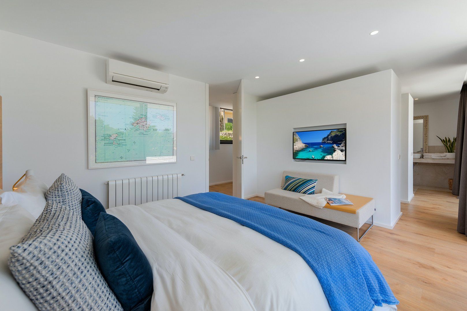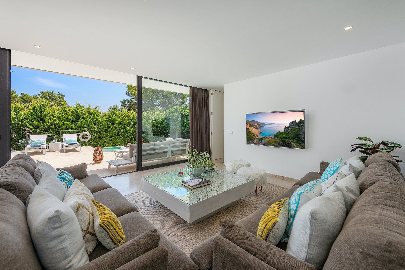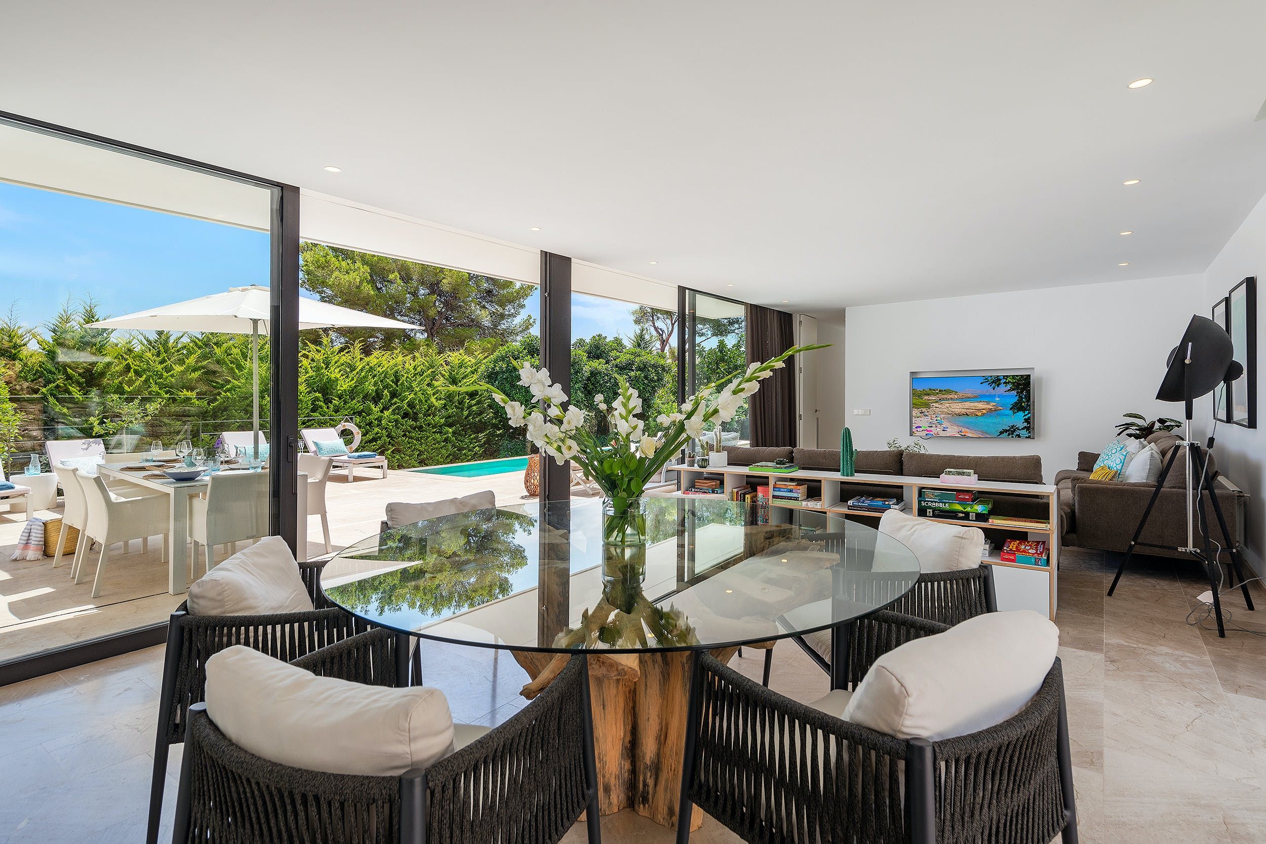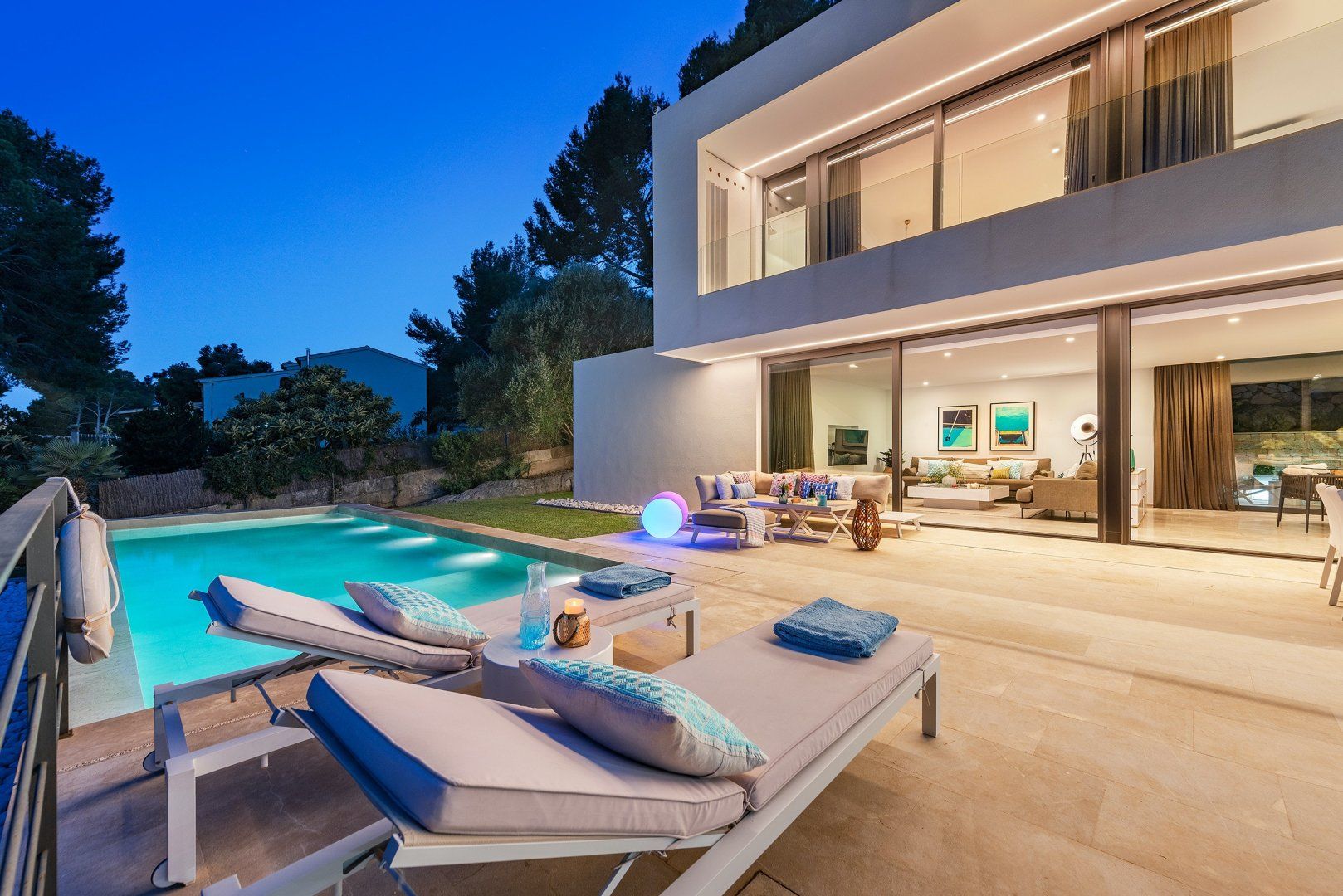 Situated in Puerto Pollensa, this modern villa offers a masterclass in indoor-outdoor living. Stylish in every sense, the home boasts large sliding glass doors connecting the open living space to the dazzling terrace, complete with sun loungers, a dining area and a private pool. We can think of nothing better than firing up the state-of-the-art barbecue and feasting with your group, long into those balmy summer evenings. And, with the vibrant poolside lights, you can't beat a midnight dip under the stars.