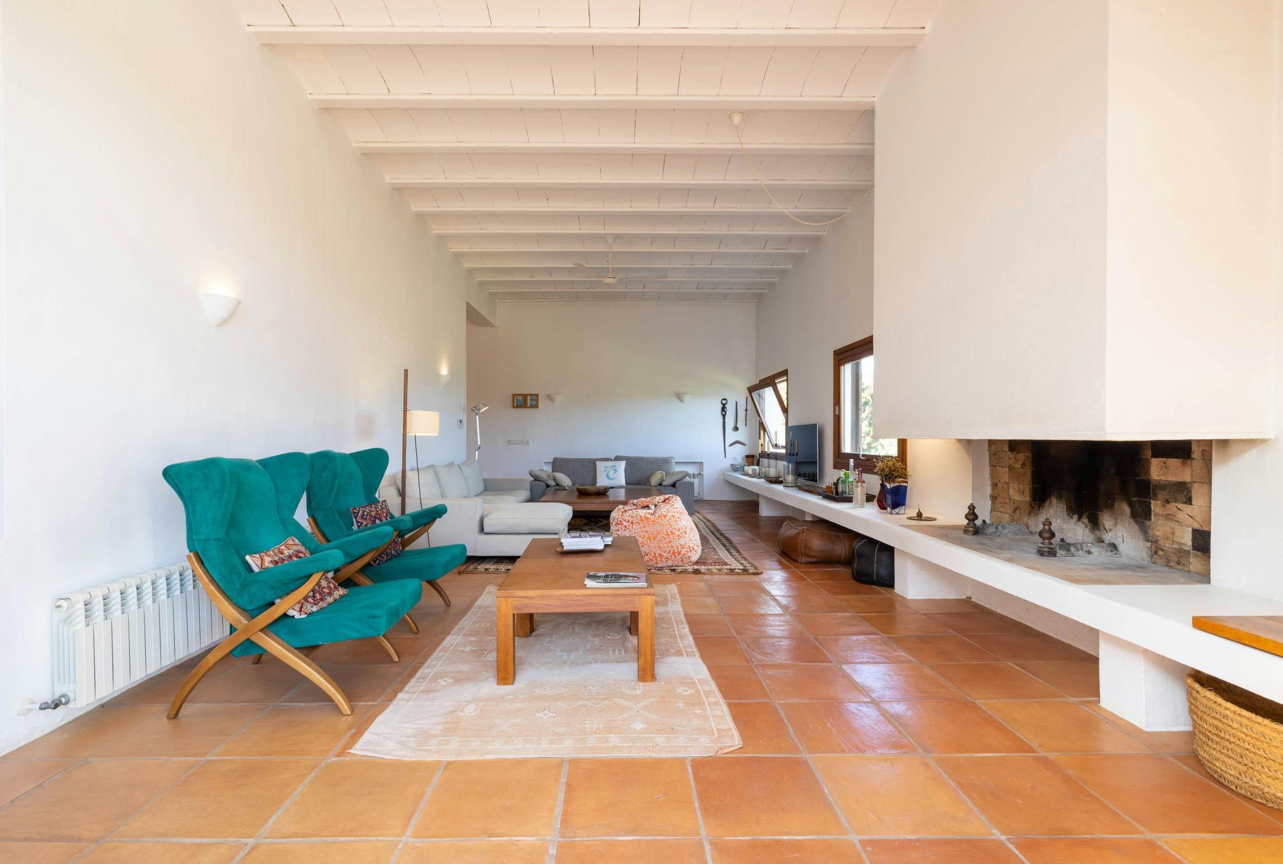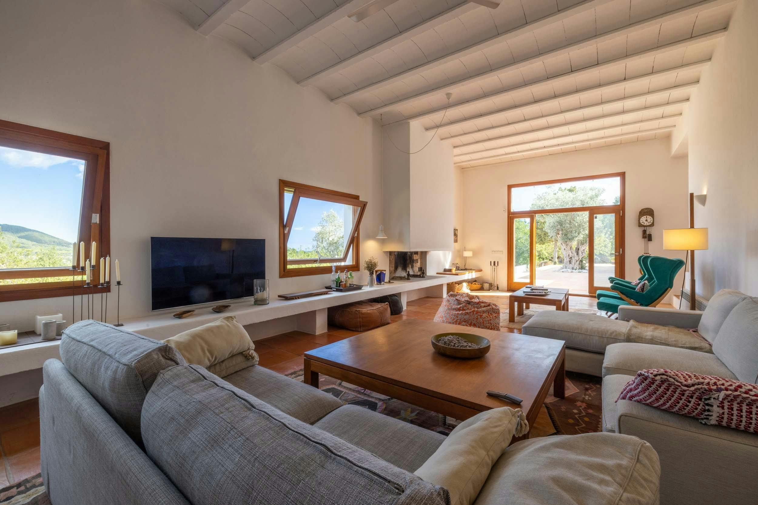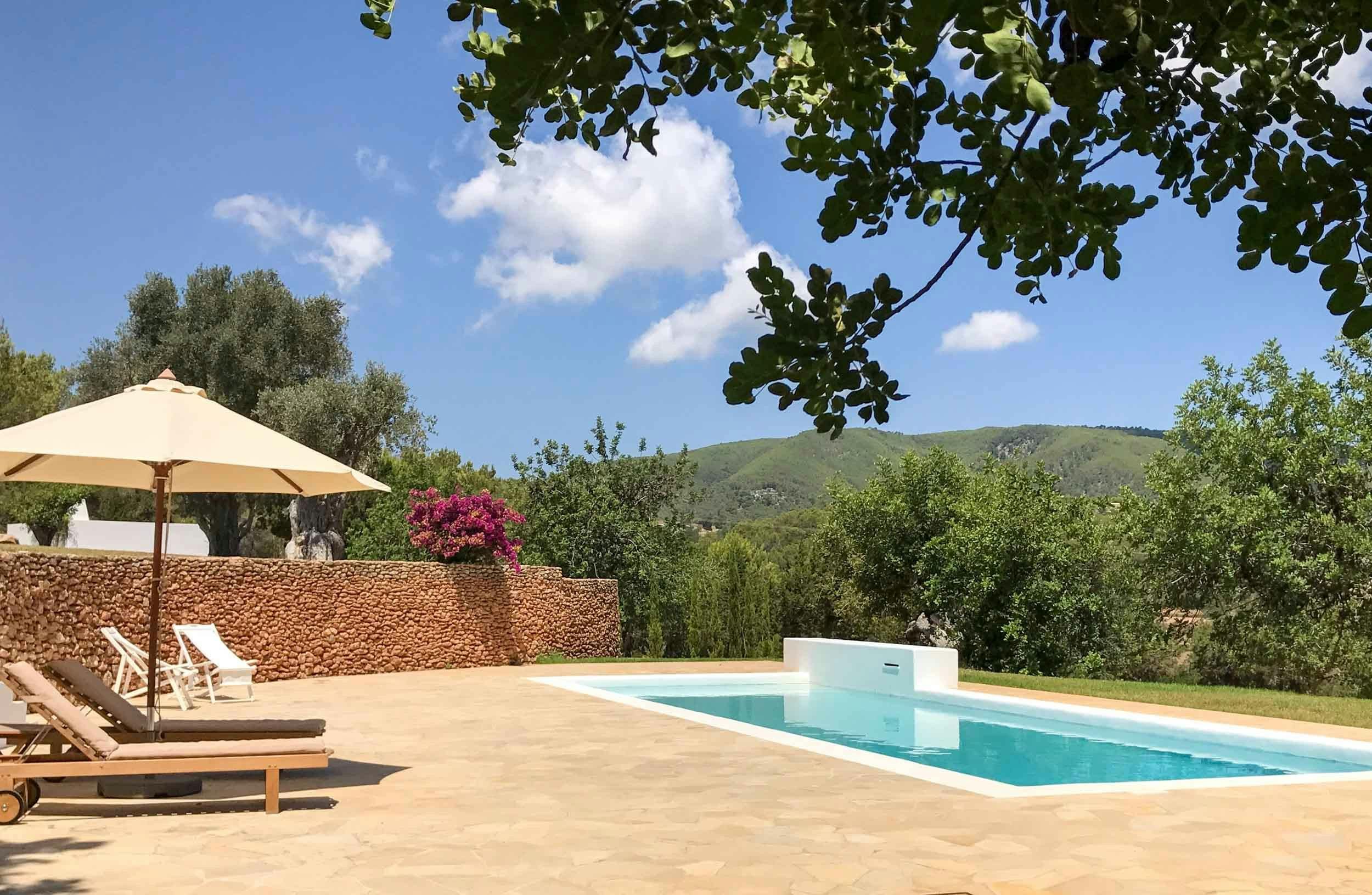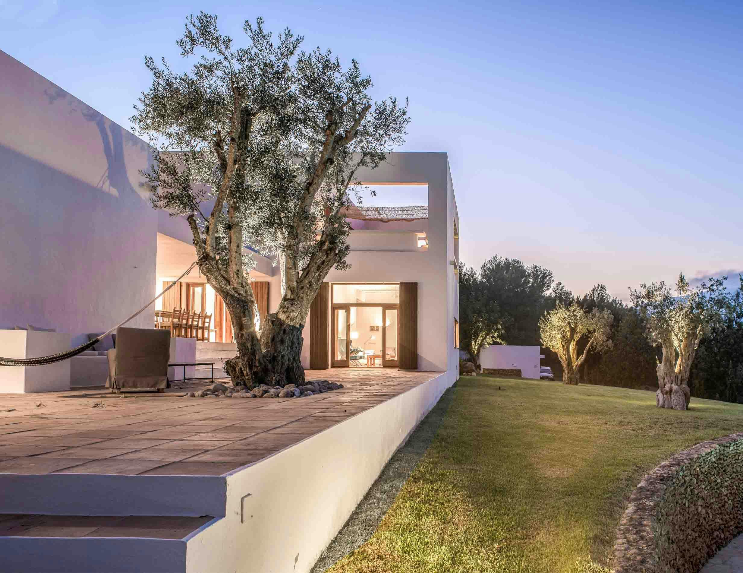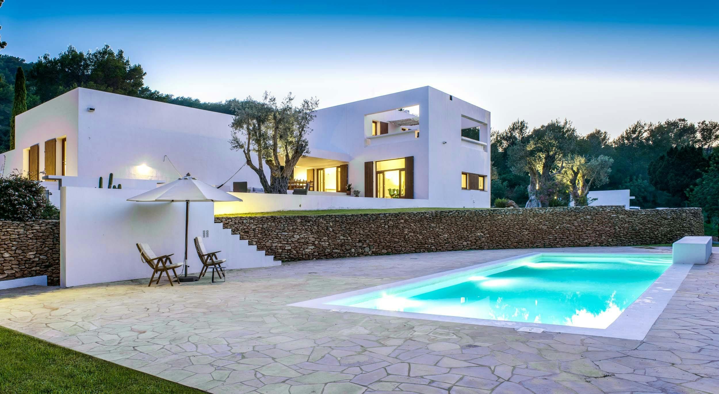 Nestled in one of the White Isle's quieter corners, this stunning and expansive villa embraces outdoor living. Dotted with ancient olive trees, the grounds feature two modern buildings connected by a shaded porch, where diners can glimpse the Mediterranean. Inside you'll find a fully equipped kitchen, a bright and comfortable living room, and four bedrooms, all kept cool with air conditioning and plenty of natural ventilation. Outside, terraces light up to embrace the warm summer night, while the alluring pool area entices guests to take a dip whatever the hour. Ideal for friends or larger families, this island retreat is 4km from the sandy Playa es Figueral, making for a perfect day trip or sunrise excursion.