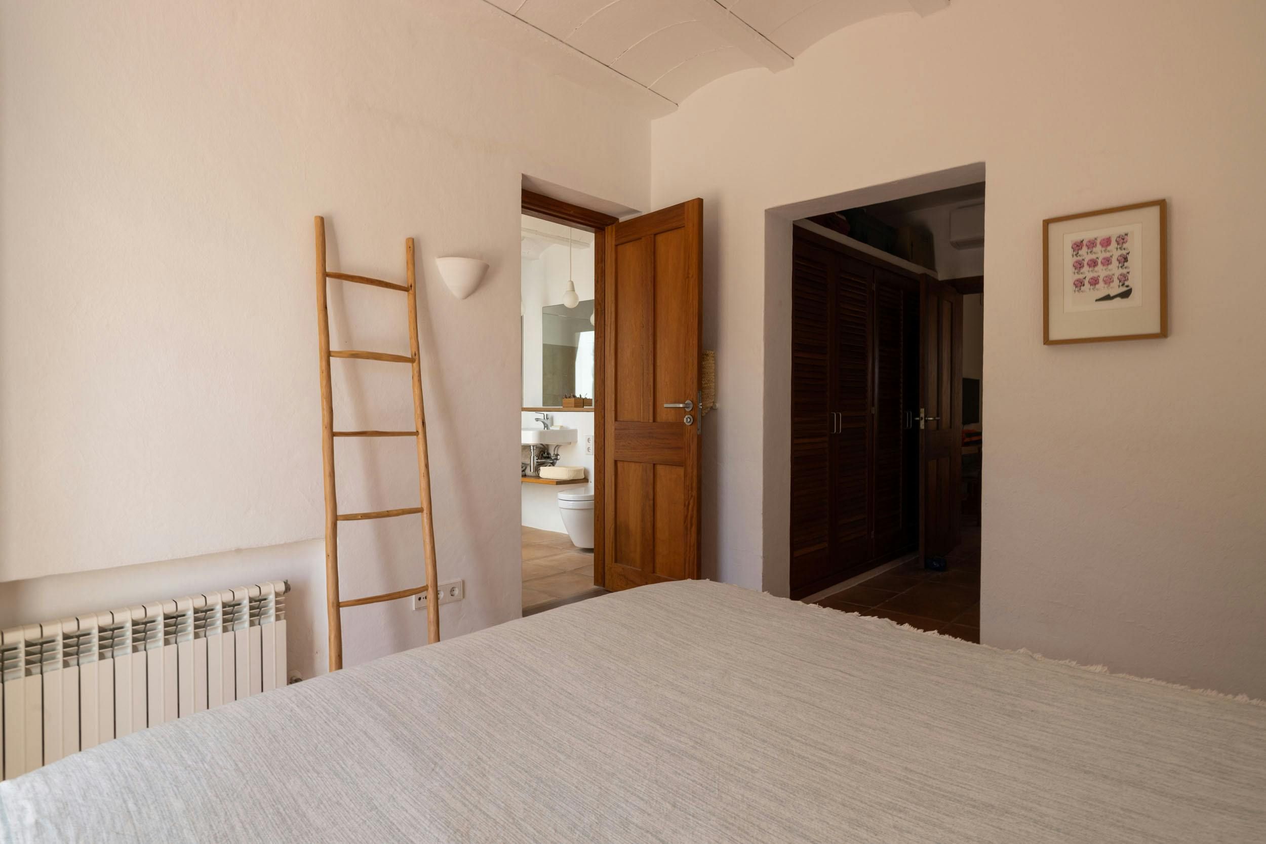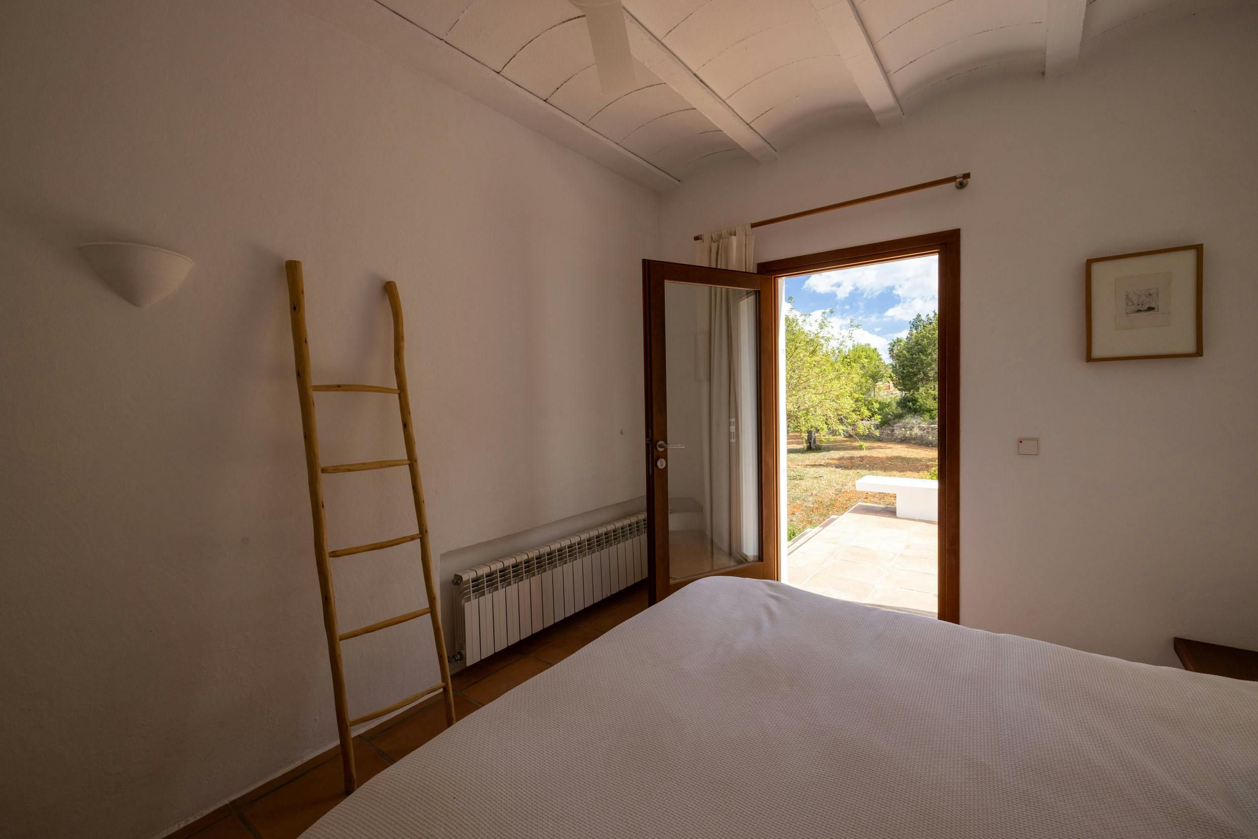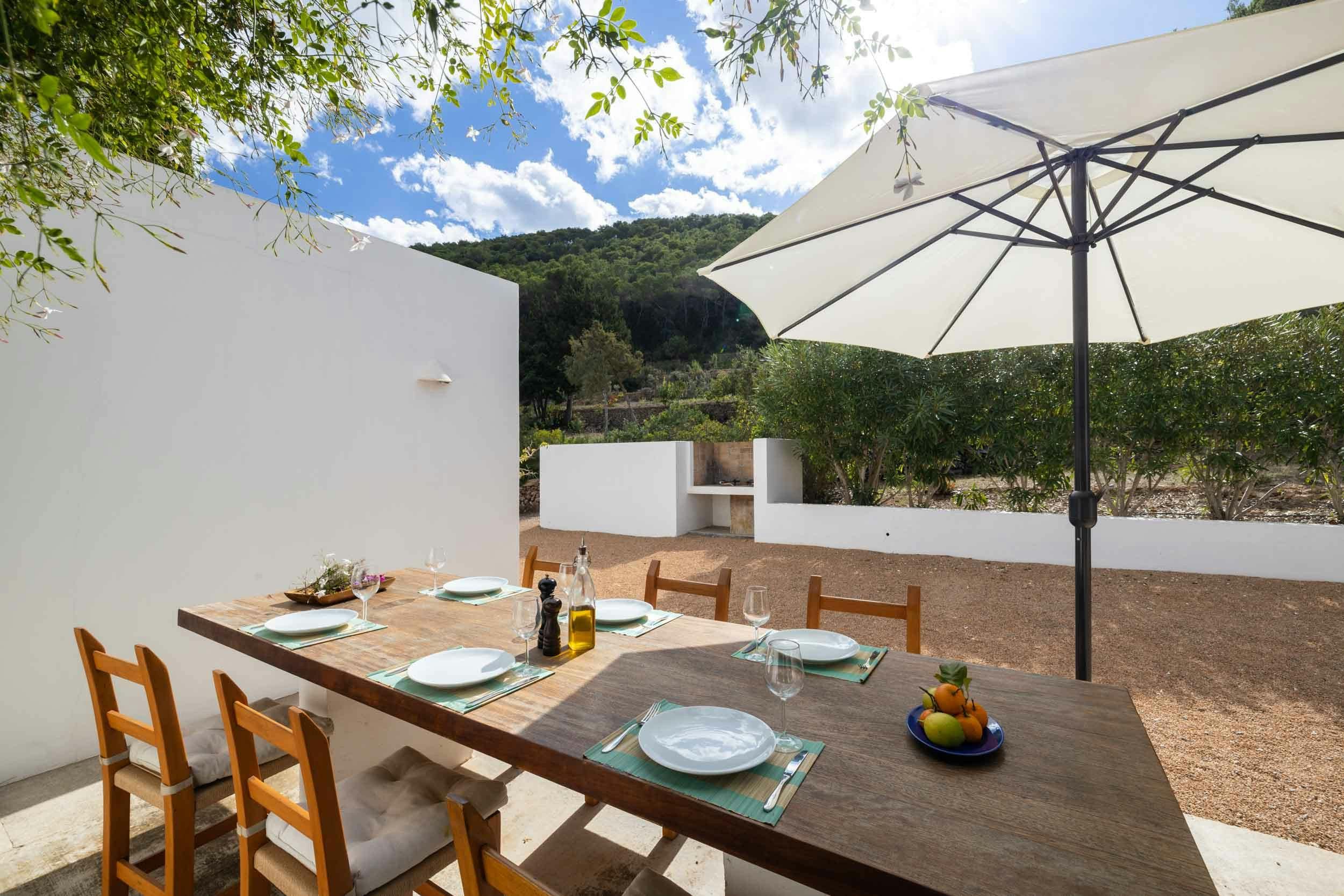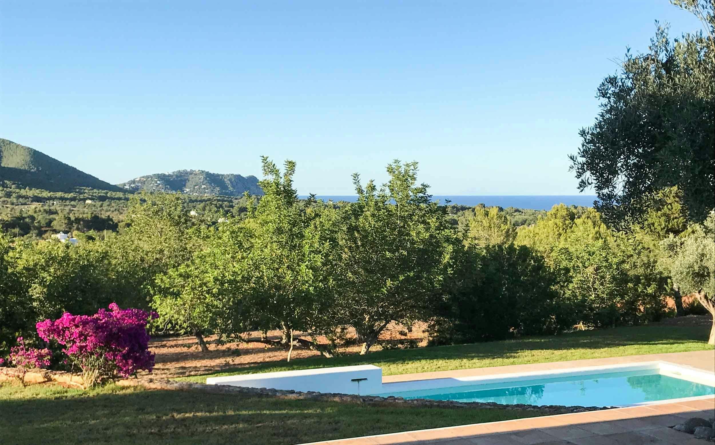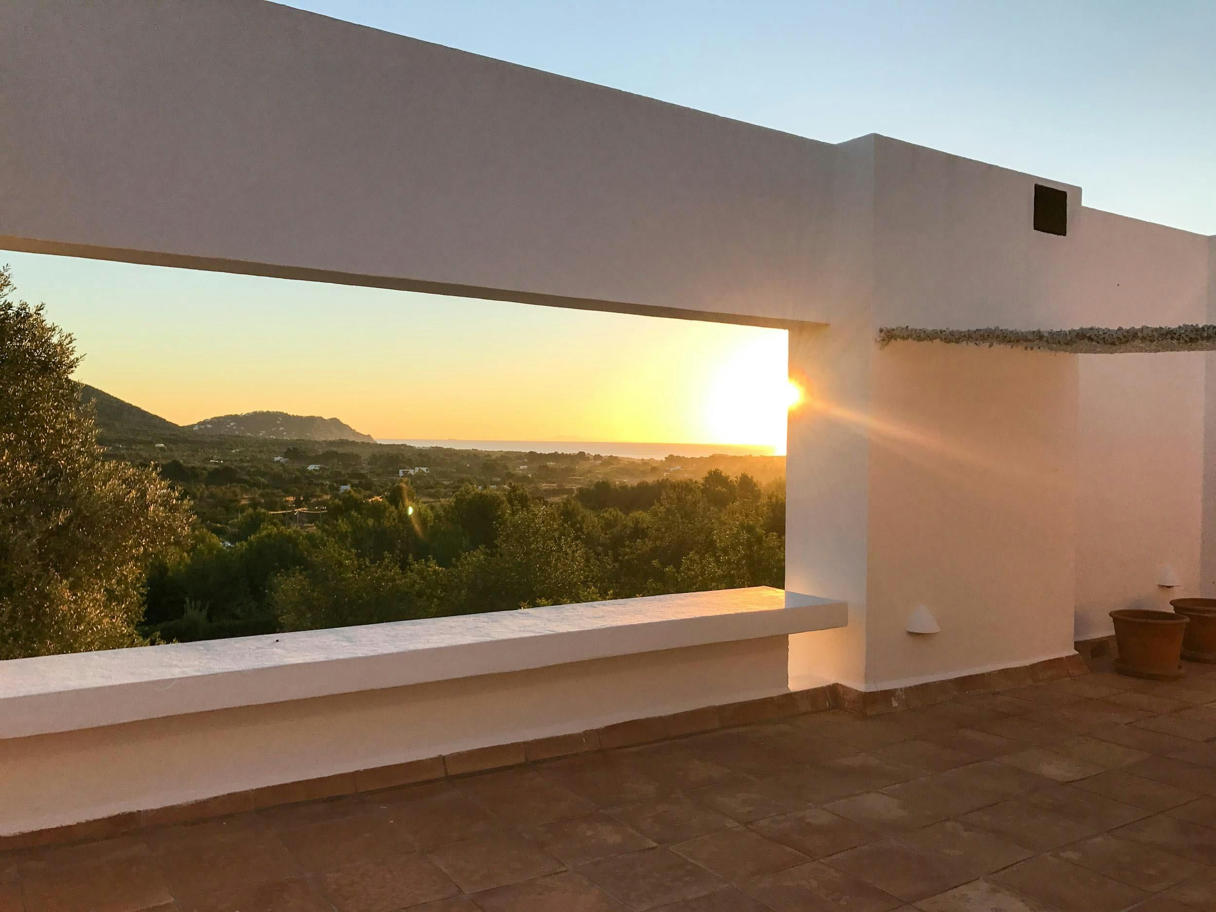 Nestled in one of the White Isle's quieter corners, this stunning and expansive villa embraces outdoor living. Dotted with ancient olive trees, the grounds feature two modern buildings connected by a shaded porch, where diners can glimpse the Mediterranean. Inside you'll find a fully equipped kitchen, a bright and comfortable living room, and four bedrooms, all kept cool with air conditioning and plenty of natural ventilation. Outside, terraces light up to embrace the warm summer night, while the alluring pool area entices guests to take a dip whatever the hour. Ideal for friends or larger families, this island retreat is 4km from the sandy Playa es Figueral, making for a perfect day trip or sunrise excursion.