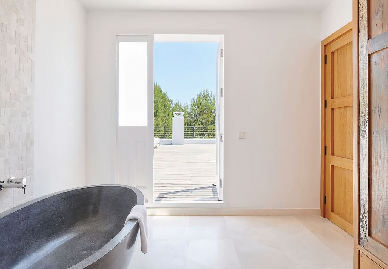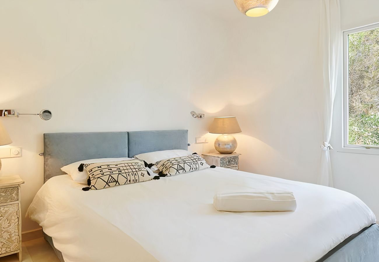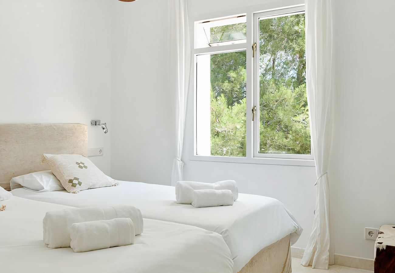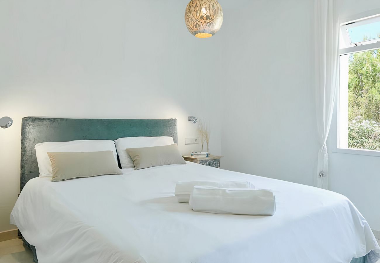 Hidden within the tree-lined hills of Southwest Ibiza, this whitewashed home opens its doors to pure relaxation. You’ll find a wonderful sense of privacy here, but it’s also just a short drive to Cala Jondal beach (4 kilometres away) with San Josep and Ibiza Town also within easy driving distance. The main bedroom occupies the first floor and features a private terrace – perfect for sunset drinks – while the two guest bedrooms in the garden ensure there’s plenty of space for groups to stretch out. There are also child-friendly amenities, and your host can help organise a range of lovely extras – including massage treatments and private chefs.
