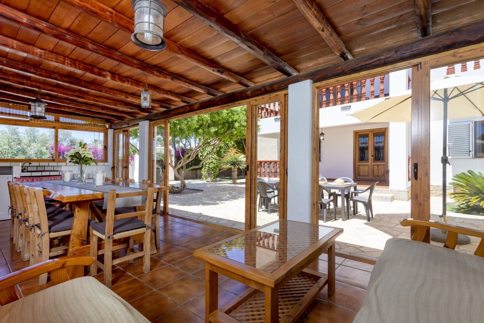 From the patio, entering the villa presents you with yet another open-concept living area, this time through the home's interiors. The ideal set-up for the autumn and winter months, you'll find yet another dining room to take advantage of when cooking at home. There's even a convenient bar area – perfect for serving up aperitifs and some Spanish tapas.
