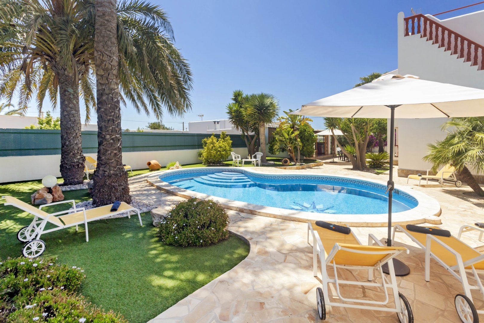 While you may only be just a stone's throw away from all-night dancing and the heart of the town's action, the villa offers a laid-back and somewhat secluded getaway with a fabulous outdoor area inviting guests to kick back in tranquillity. Complete with a private swimming pool, sun loungers, a lawned garden and a sheltered outdoor kitchen and dining area – transitioning from indoor to outdoor living flow as naturally as the warm summer's breeze here.