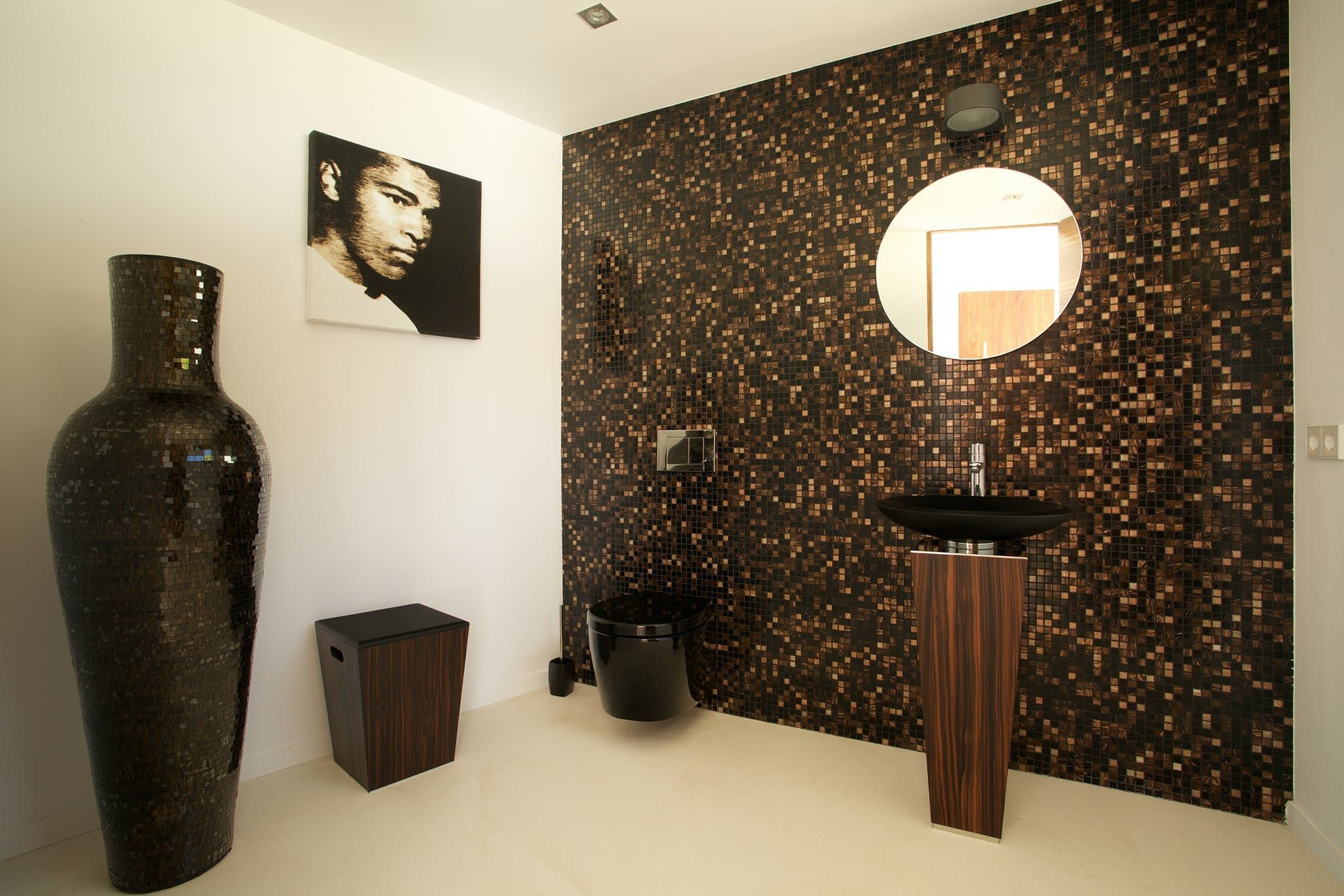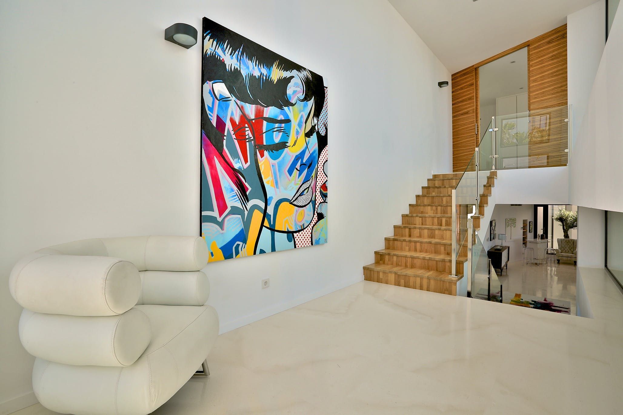 Inside, polished white stone floors keep things cool underfoot so you can stay barefoot all day. Walls of glass flood the luxurious interior with sunlight and mean you can enjoy a sea view from the open-plan living area and bedrooms too. In terms of seating, there are more than enough plush sofas to accommodate the group with two lounges mirror images of each other. Mid-century-style furnishings, dazzling modern artworks and a geometric-patterned dining table that could be in a gallery all combine to create the feeling you’ve stepped into the pages of an interior design magazine.