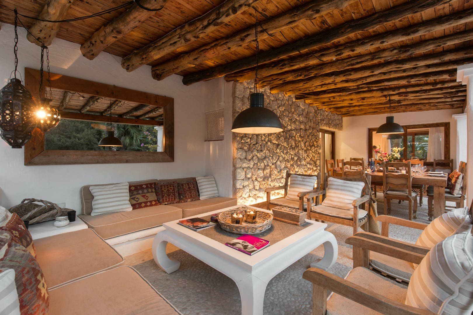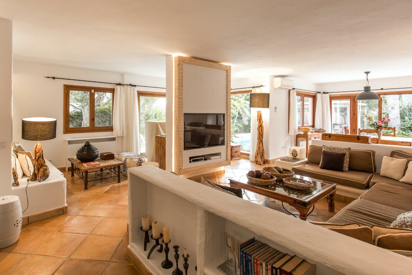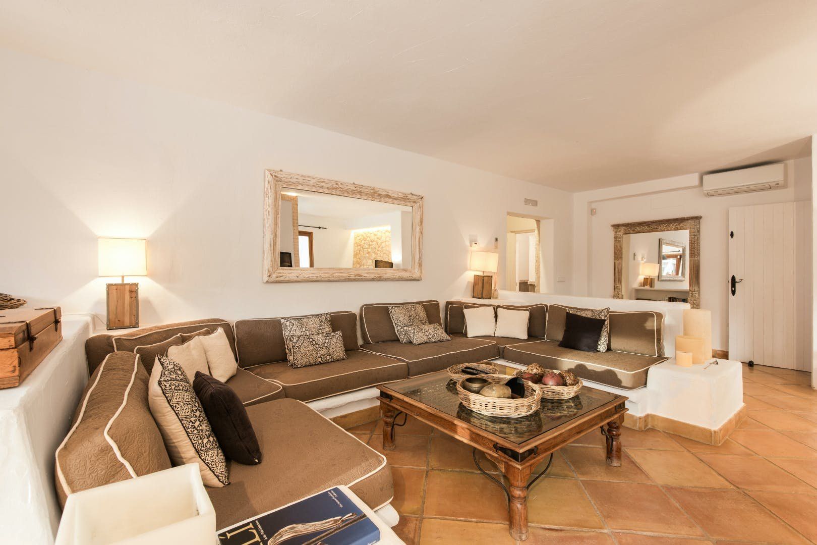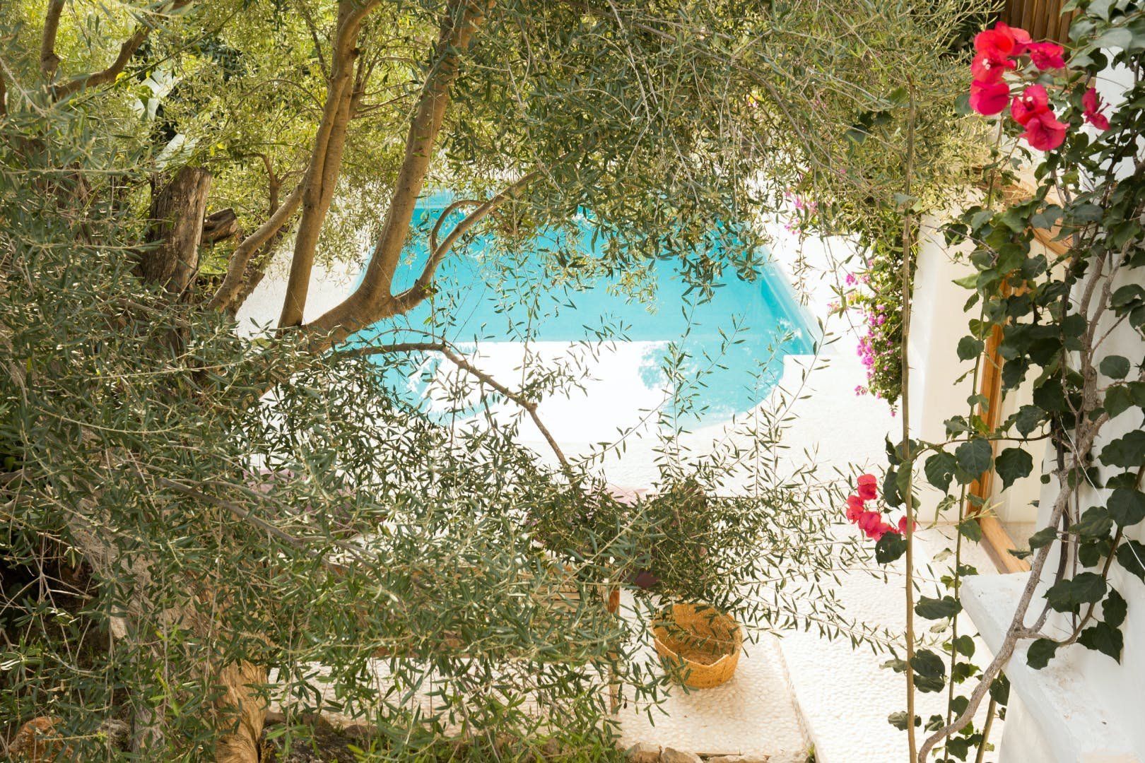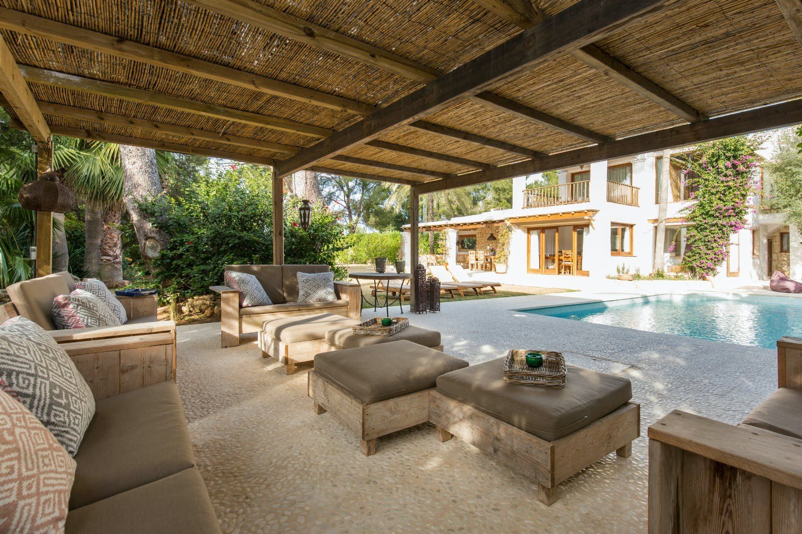 Peeking out from inside a hedged fence is this sunny and secluded villa in Ibiza’s exclusive Es Porroig neighbourhood. Open the gated doors and walk past the aquamarine pool, over the clean-cut lawn and onto the beautifully laid stone floor where a serene outdoor sanctuary awaits. Soft grey and wood furniture sit nicely shaded under a pergola roof against a stone wall backdrop. Up on the roof you’ll find a pristine white terrace with a built-in barbecue for sultry nights under the stars. Inside, the celebration of the natural world continues – soft earthy tones and raw textures such as wood, terracotta tile and stone are all mixed and matched throughout the space, and the horseshoe-shaped stone sofa in the living room wouldn’t look out of place in a Sultan’s boudoir. If you bag the master bedroom you’ll benefit from a private covered terrace with a couple of spa-like loungers for the ultimate bliss-out experience. This spacious and soothing enclave is functional too – find a large, well-equipped kitchen, a workout room and a games area. Its close proximity to Cala Jondal beach makes this an ideal getaway for family and friends.