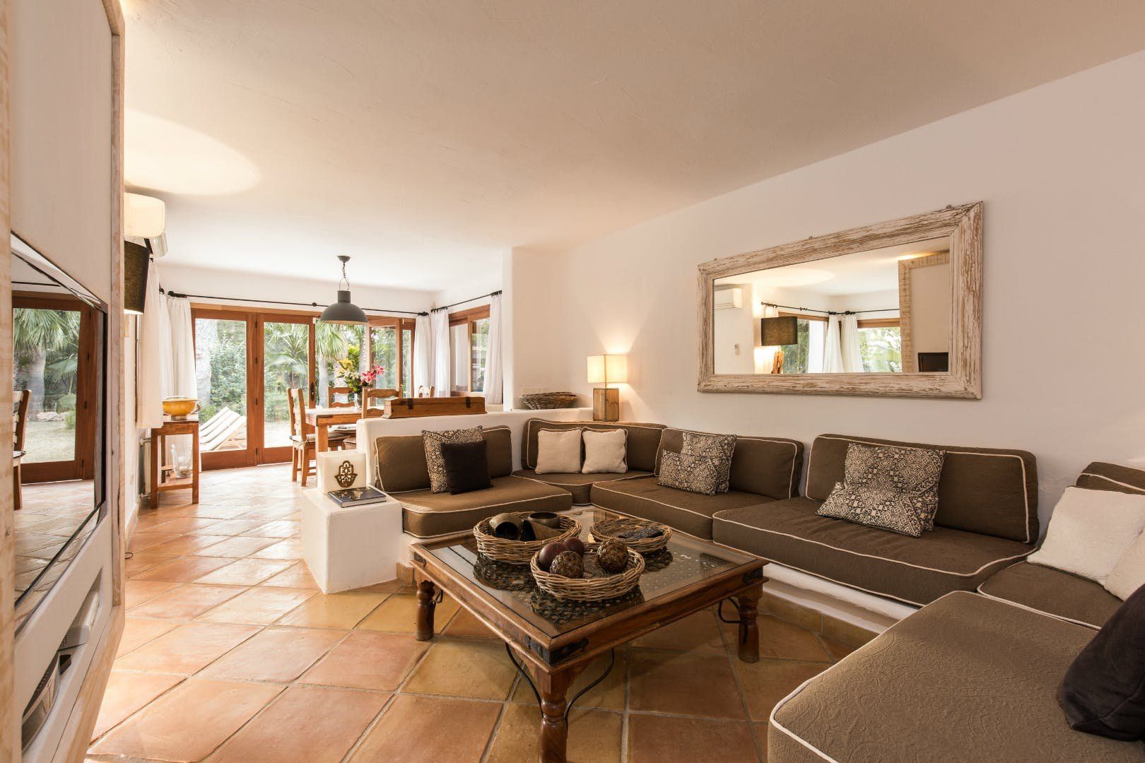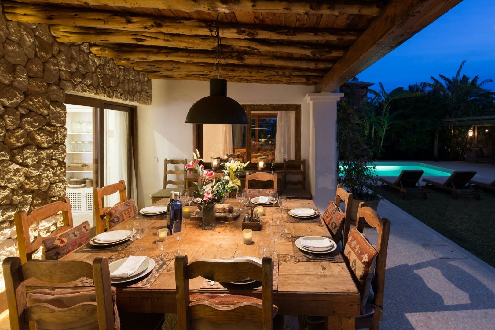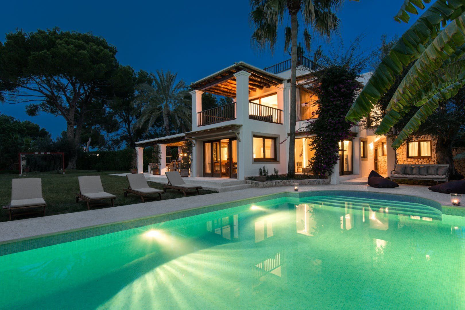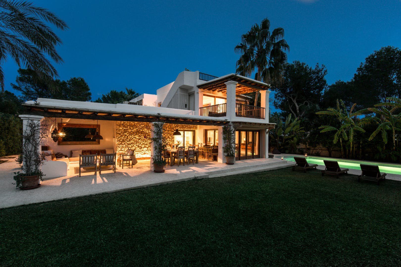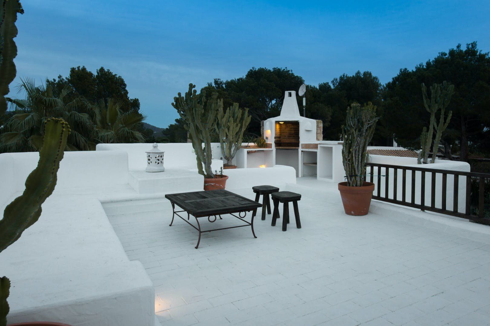 Peeking out from inside a hedged fence is this sunny and secluded villa in Ibiza’s exclusive Es Porroig neighbourhood. Open the gated doors and walk past the aquamarine pool, over the clean-cut lawn and onto the beautifully laid stone floor where a serene outdoor sanctuary awaits. Soft grey and wood furniture sit nicely shaded under a pergola roof against a stone wall backdrop. Up on the roof you’ll find a pristine white terrace with a built-in barbecue for sultry nights under the stars. Inside, the celebration of the natural world continues – soft earthy tones and raw textures such as wood, terracotta tile and stone are all mixed and matched throughout the space, and the horseshoe-shaped stone sofa in the living room wouldn’t look out of place in a Sultan’s boudoir. If you bag the master bedroom you’ll benefit from a private covered terrace with a couple of spa-like loungers for the ultimate bliss-out experience. This spacious and soothing enclave is functional too – find a large, well-equipped kitchen, a workout room and a games area. Its close proximity to Cala Jondal beach makes this an ideal getaway for family and friends.