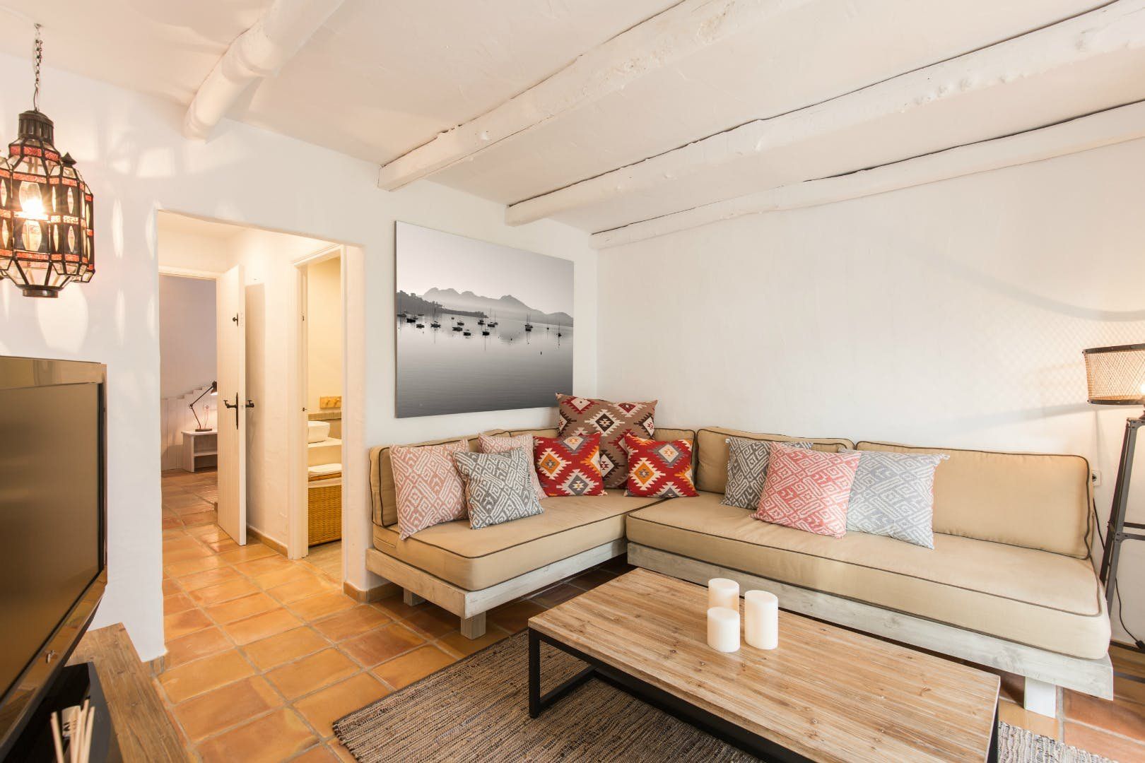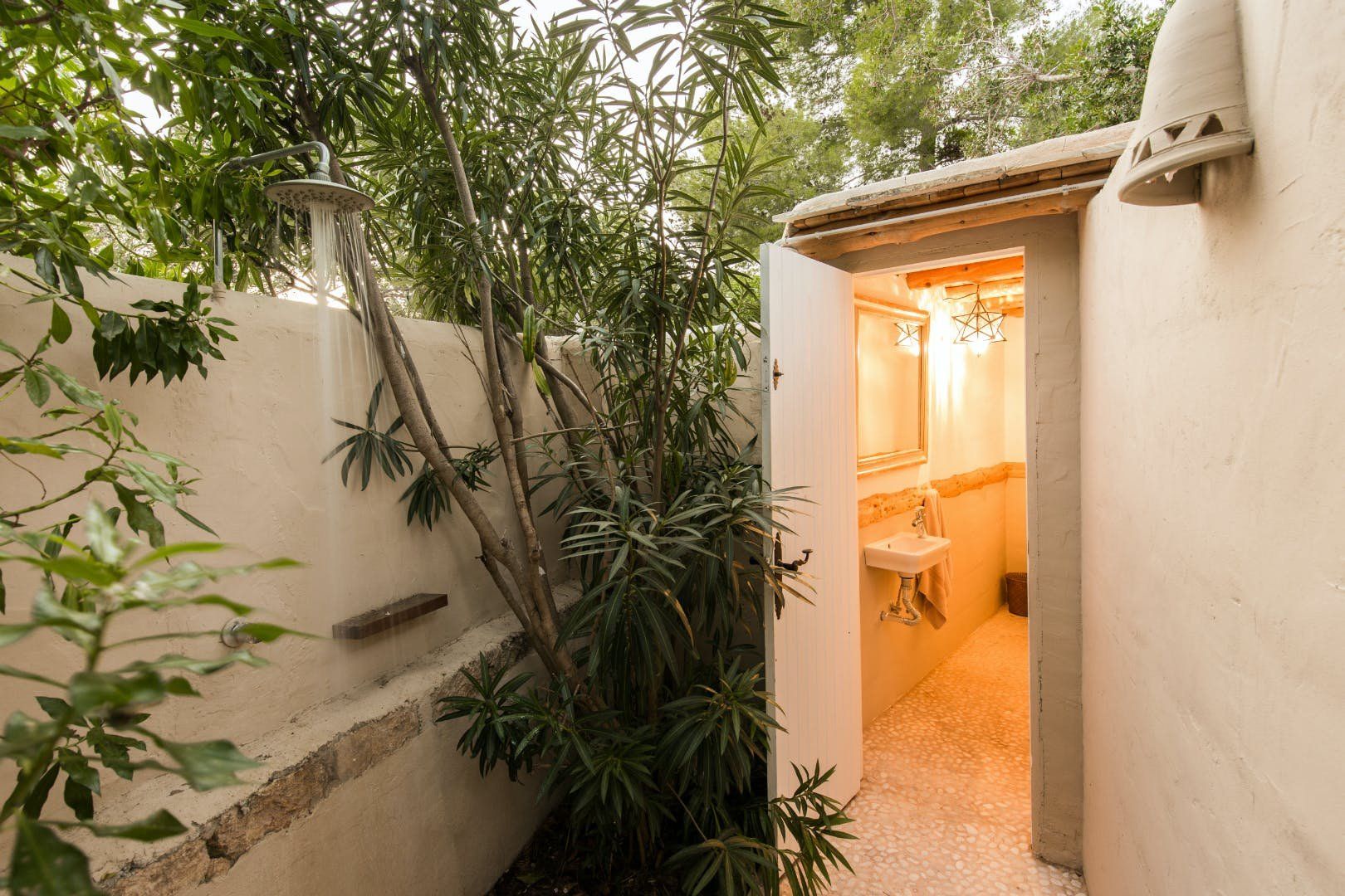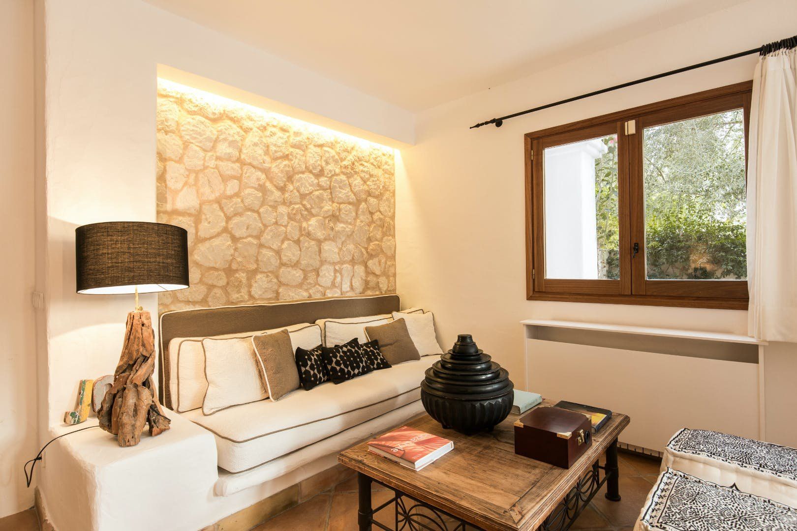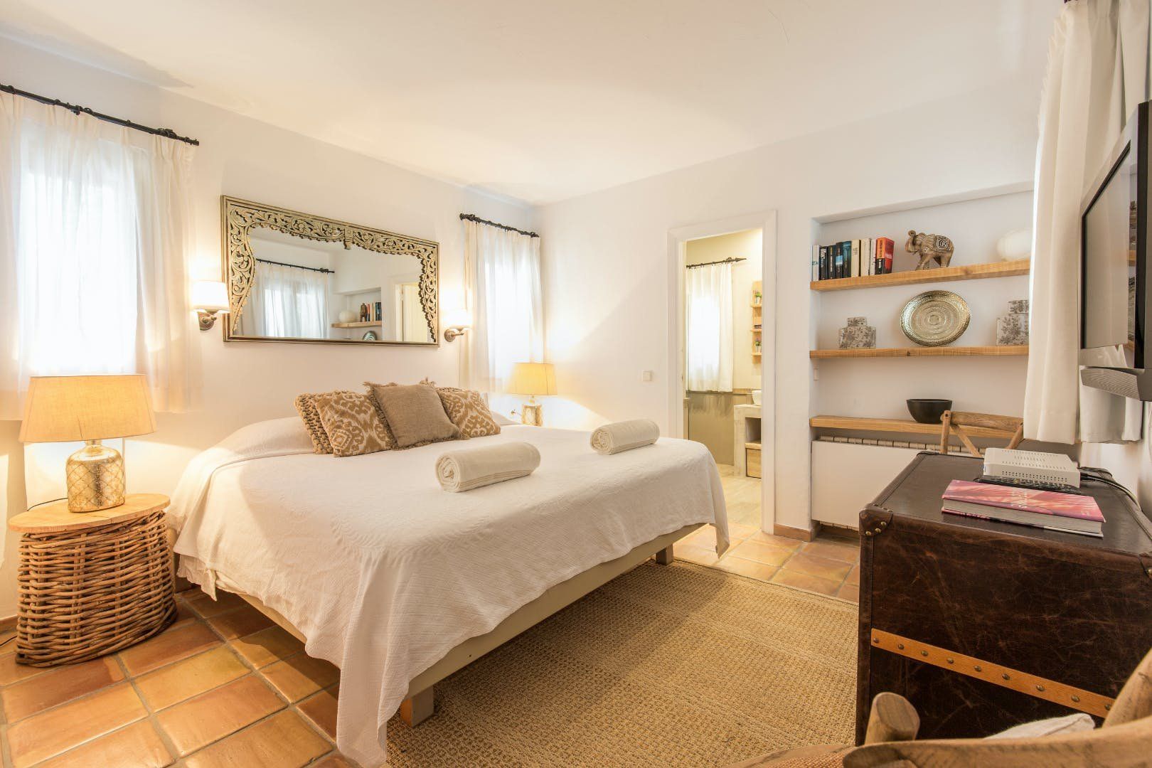 Peeking out from inside a hedged fence is this sunny and secluded villa in Ibiza’s exclusive Es Porroig neighbourhood. Open the gated doors and walk past the aquamarine pool, over the clean-cut lawn and onto the beautifully laid stone floor where a serene outdoor sanctuary awaits. Soft grey and wood furniture sit nicely shaded under a pergola roof against a stone wall backdrop. Up on the roof you’ll find a pristine white terrace with a built-in barbecue for sultry nights under the stars. Inside, the celebration of the natural world continues – soft earthy tones and raw textures such as wood, terracotta tile and stone are all mixed and matched throughout the space, and the horseshoe-shaped stone sofa in the living room wouldn’t look out of place in a Sultan’s boudoir. If you bag the master bedroom you’ll benefit from a private covered terrace with a couple of spa-like loungers for the ultimate bliss-out experience. This spacious and soothing enclave is functional too – find a large, well-equipped kitchen, a workout room and a games area. Its close proximity to Cala Jondal beach makes this an ideal getaway for family and friends.