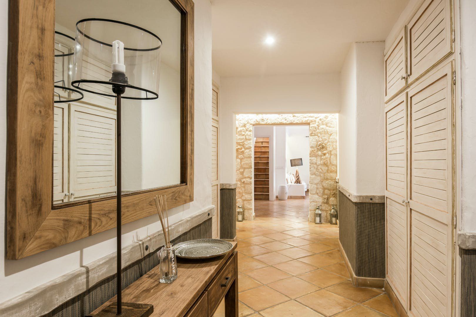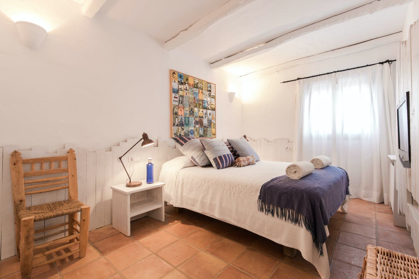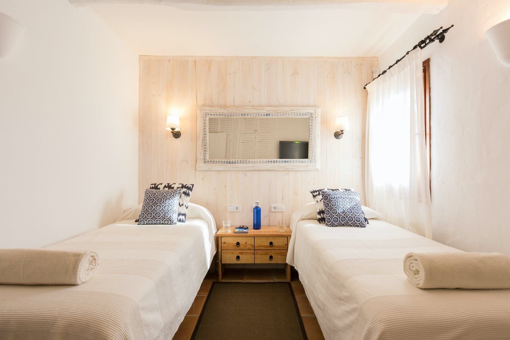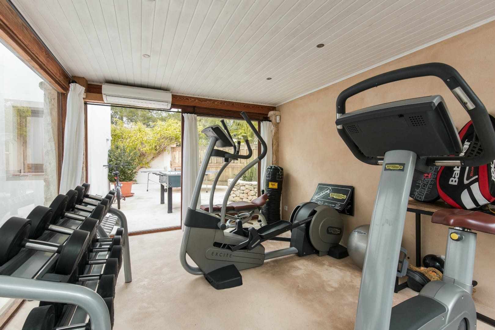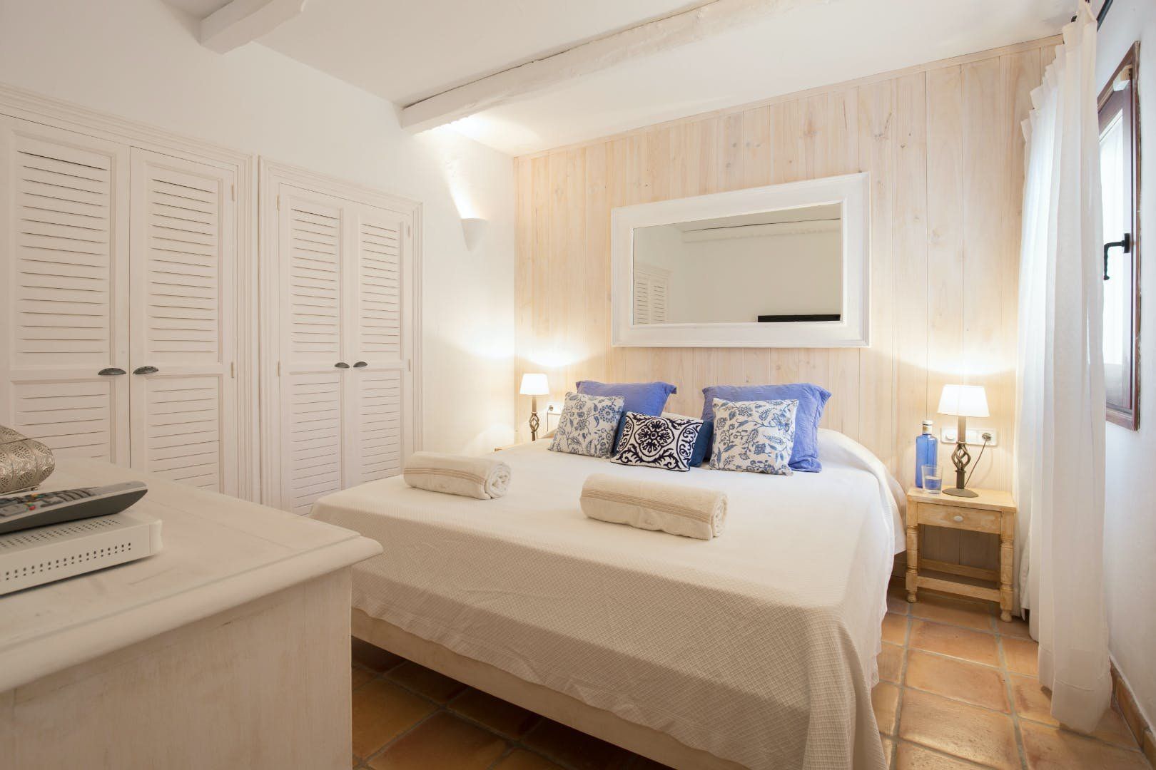 Peeking out from inside a hedged fence is this sunny and secluded villa in Ibiza’s exclusive Es Porroig neighbourhood. Open the gated doors and walk past the aquamarine pool, over the clean-cut lawn and onto the beautifully laid stone floor where a serene outdoor sanctuary awaits. Soft grey and wood furniture sit nicely shaded under a pergola roof against a stone wall backdrop. Up on the roof you’ll find a pristine white terrace with a built-in barbecue for sultry nights under the stars. Inside, the celebration of the natural world continues – soft earthy tones and raw textures such as wood, terracotta tile and stone are all mixed and matched throughout the space, and the horseshoe-shaped stone sofa in the living room wouldn’t look out of place in a Sultan’s boudoir. If you bag the master bedroom you’ll benefit from a private covered terrace with a couple of spa-like loungers for the ultimate bliss-out experience. This spacious and soothing enclave is functional too – find a large, well-equipped kitchen, a workout room and a games area. Its close proximity to Cala Jondal beach makes this an ideal getaway for family and friends.