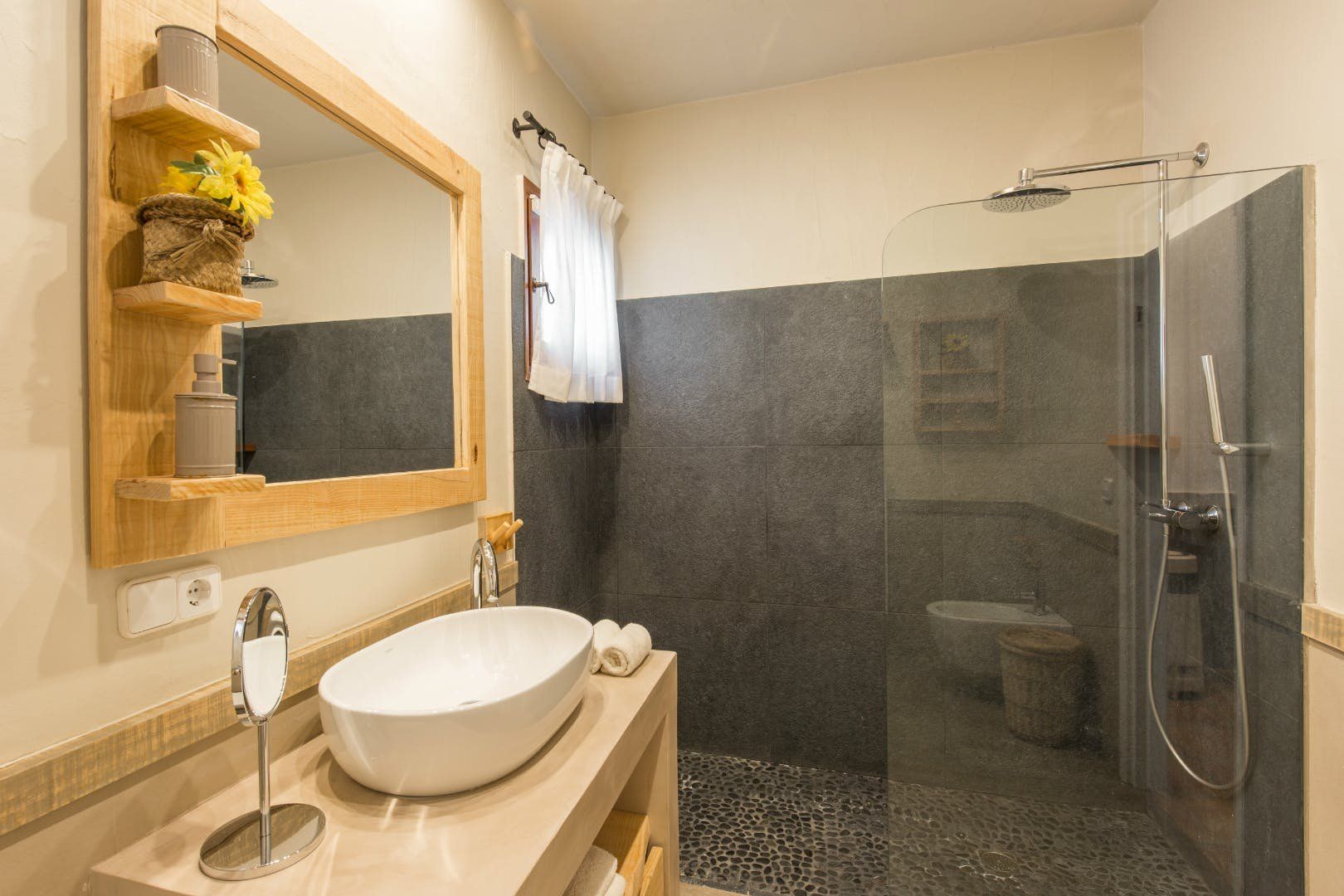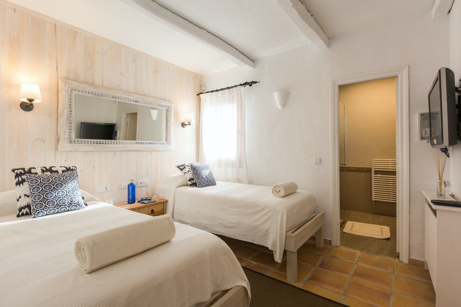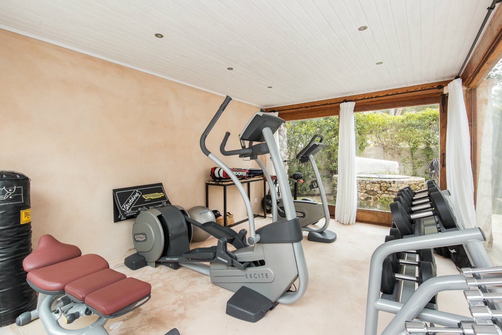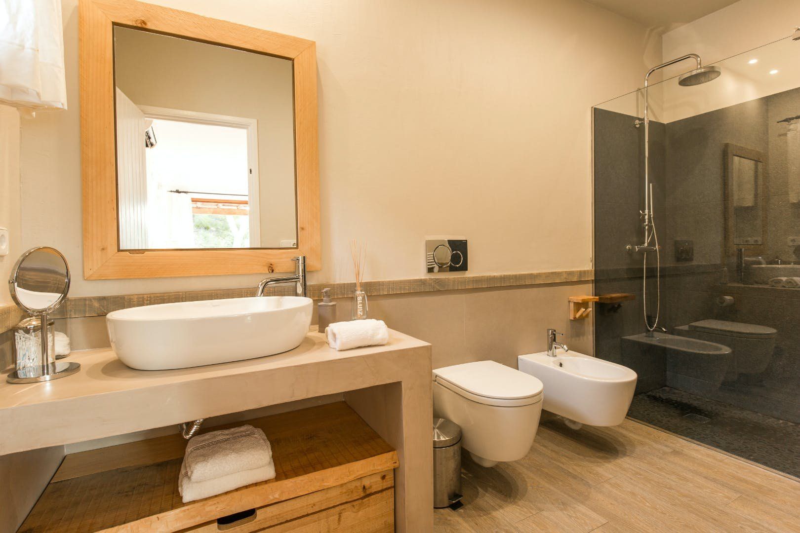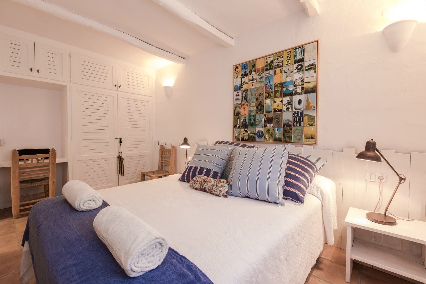 Peeking out from inside a hedged fence is this sunny and secluded villa in Ibiza’s exclusive Es Porroig neighbourhood. Open the gated doors and walk past the aquamarine pool, over the clean-cut lawn and onto the beautifully laid stone floor where a serene outdoor sanctuary awaits. Soft grey and wood furniture sit nicely shaded under a pergola roof against a stone wall backdrop. Up on the roof you’ll find a pristine white terrace with a built-in barbecue for sultry nights under the stars. Inside, the celebration of the natural world continues – soft earthy tones and raw textures such as wood, terracotta tile and stone are all mixed and matched throughout the space, and the horseshoe-shaped stone sofa in the living room wouldn’t look out of place in a Sultan’s boudoir. If you bag the master bedroom you’ll benefit from a private covered terrace with a couple of spa-like loungers for the ultimate bliss-out experience. This spacious and soothing enclave is functional too – find a large, well-equipped kitchen, a workout room and a games area. Its close proximity to Cala Jondal beach makes this an ideal getaway for family and friends.