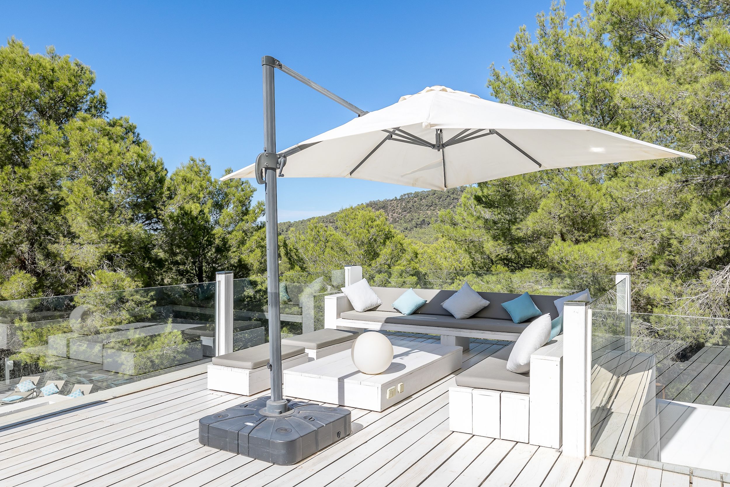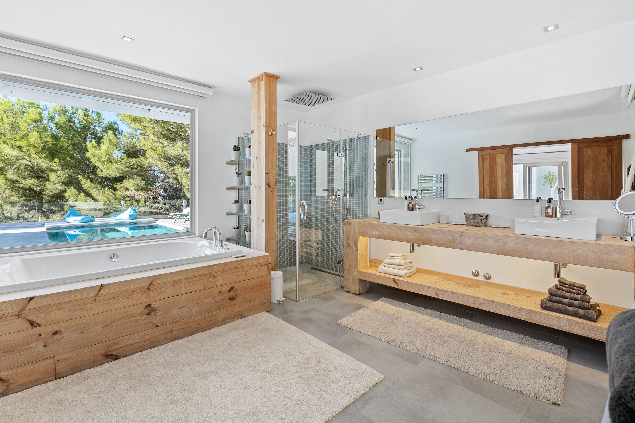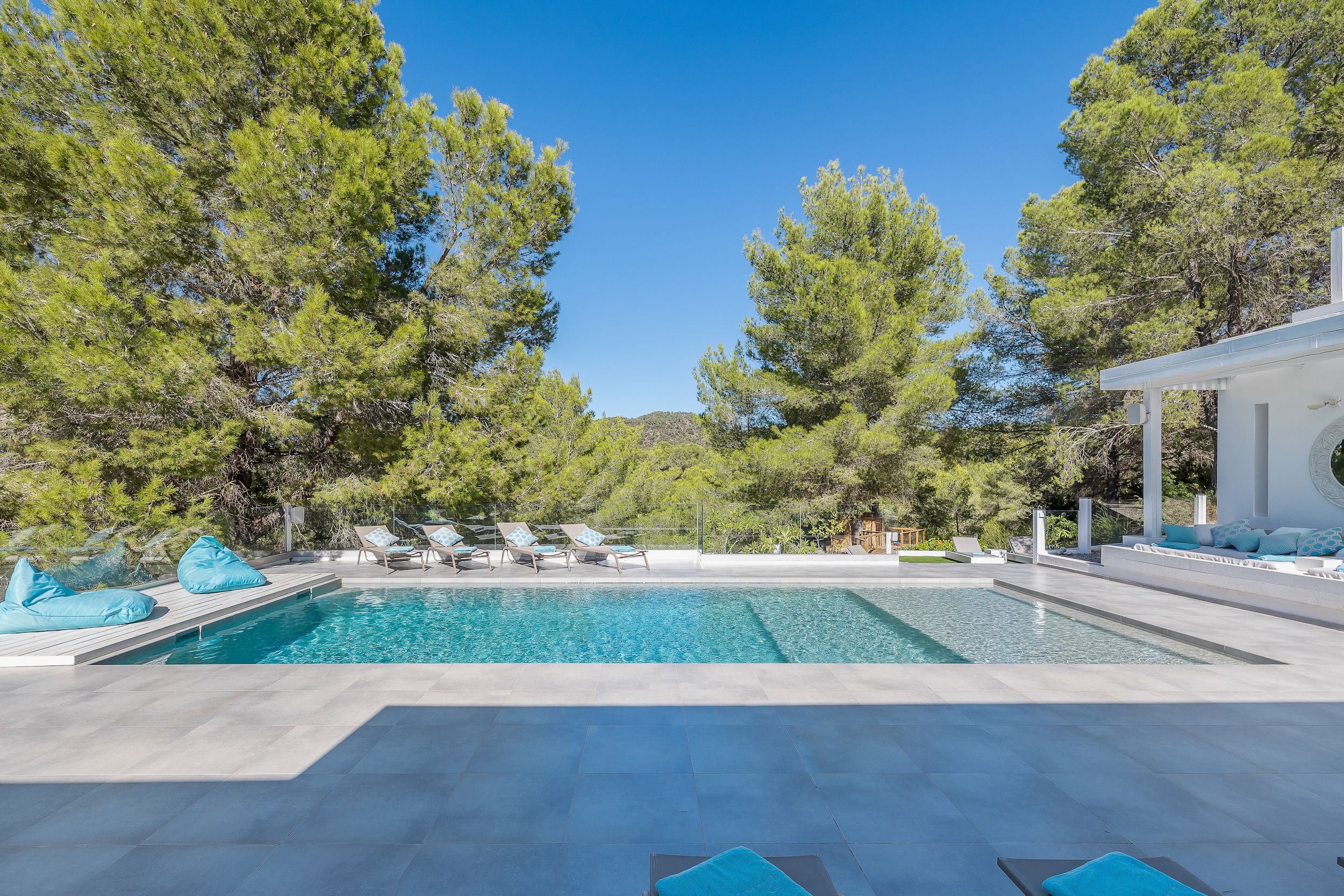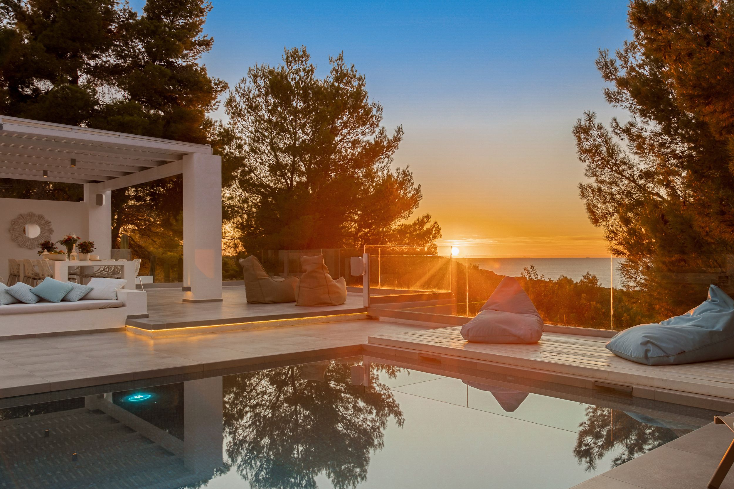 You can watch the sunset and take in the views of the bay to Conejera Island from this villa’s pool deck, and roof terrace. We love the poolside daybeds and the shaded four-poster under the trees. You’ll also find an outdoor fitness area and playground for the kids. There’s an indoor and outdoor Sonos sound system here so you can have your favourite Ibizan mix while you work out or relax too. There are more entertainment options inside with its table football and tennis. And there are also vistas to enjoy from the living room and the bedrooms (most have a private terrace). Location-wise, Cala Tarida and San Jose are just a short drive away.