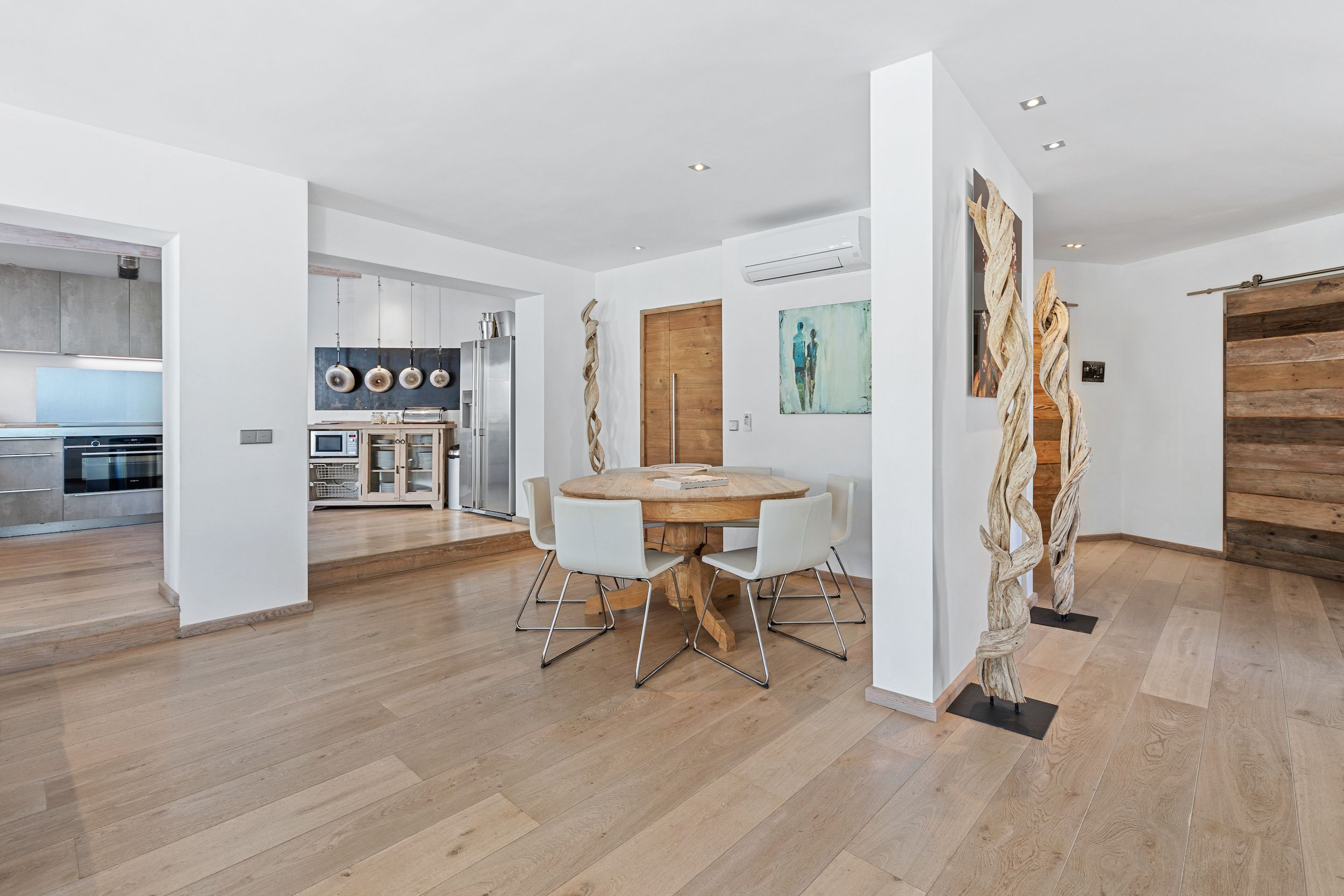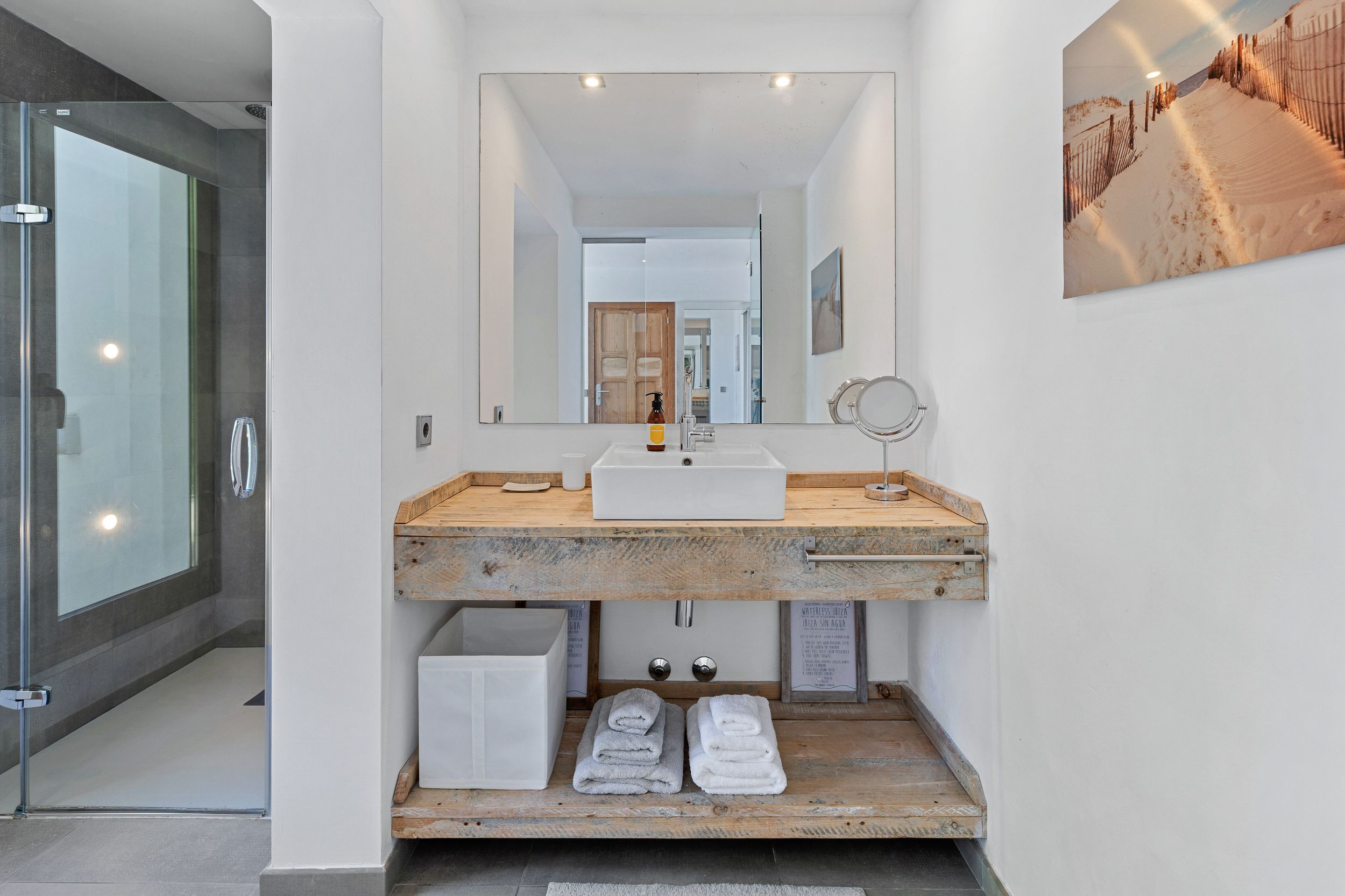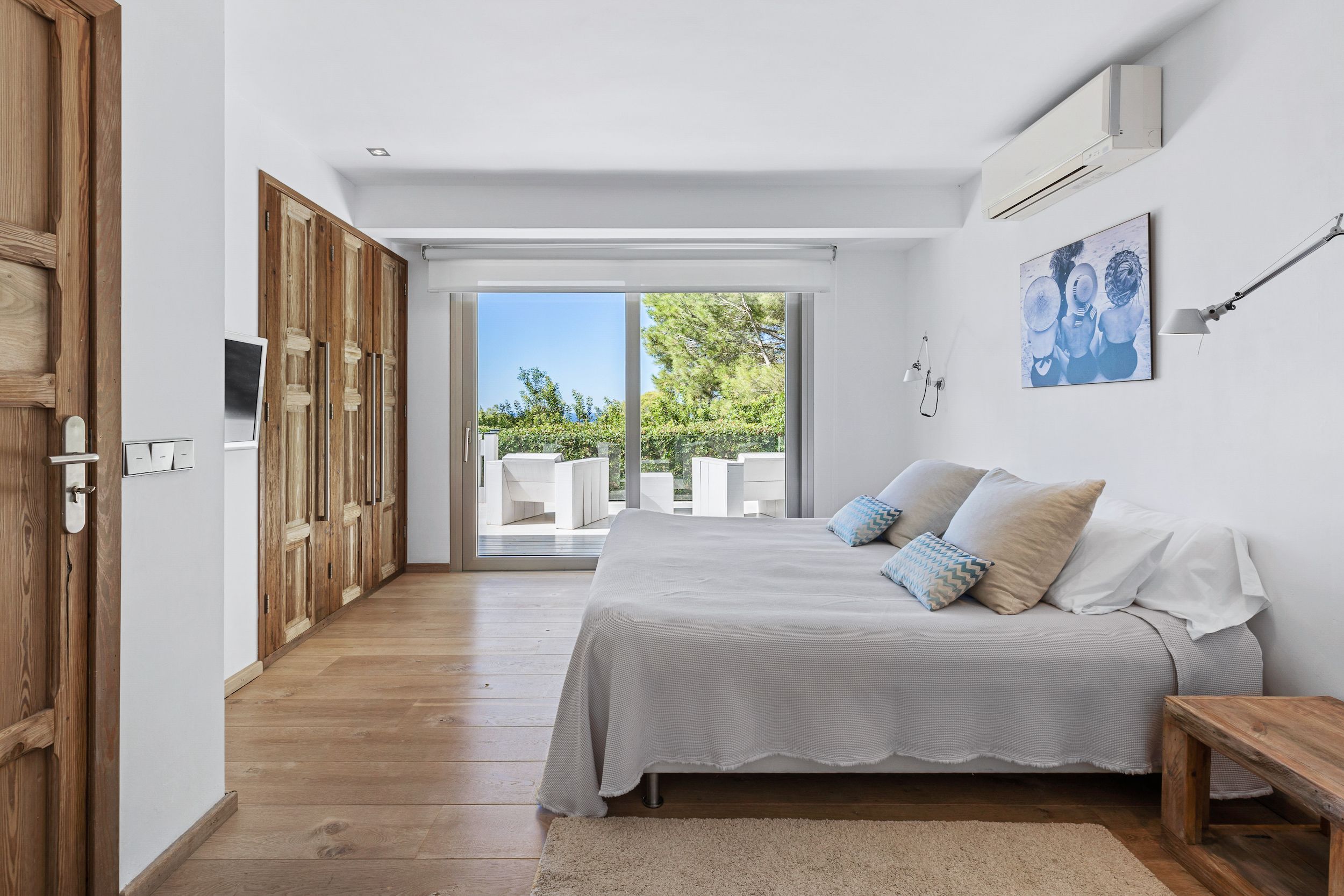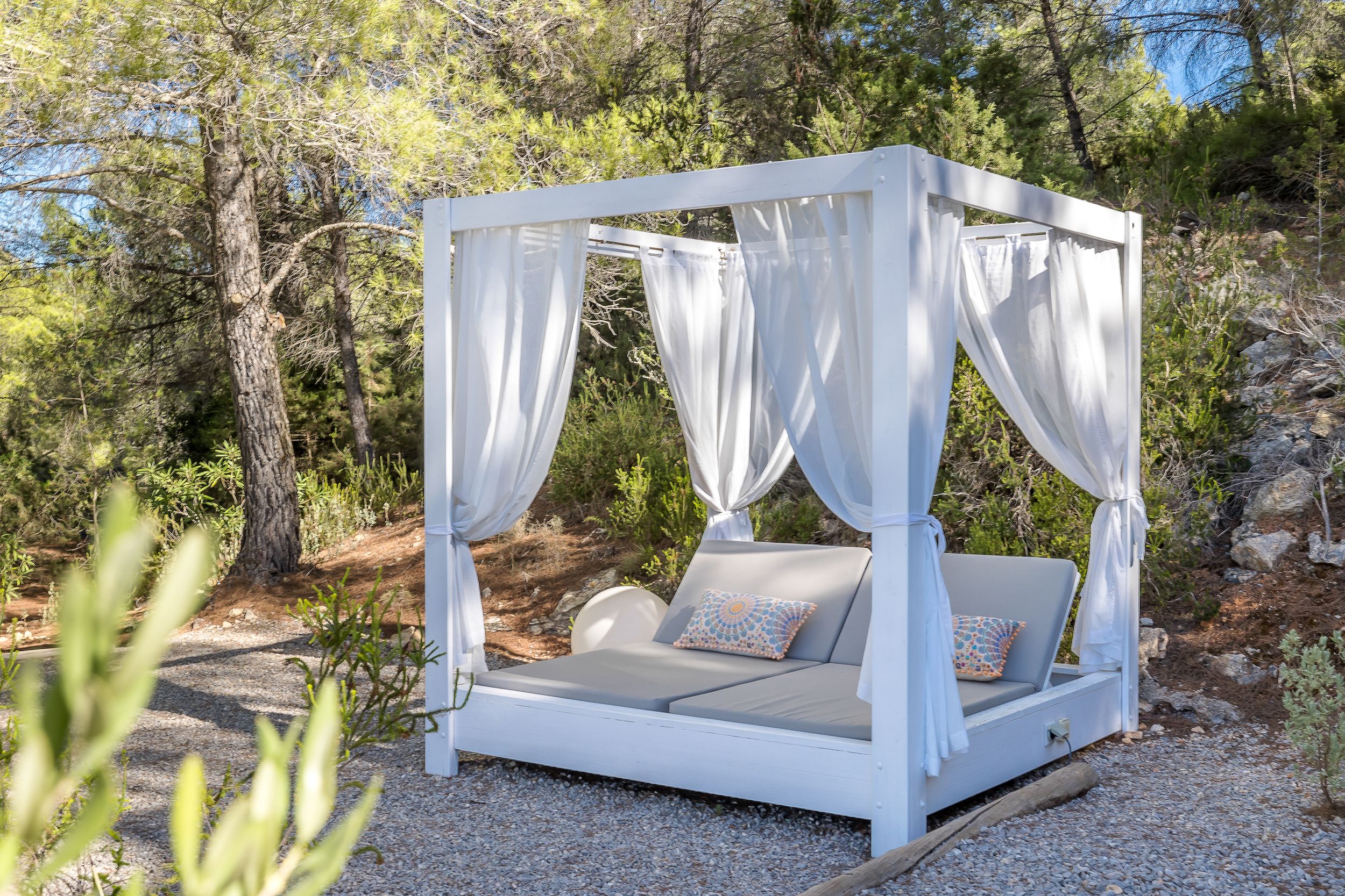 You can watch the sunset and take in the views of the bay to Conejera Island from this villa’s pool deck, and roof terrace. We love the poolside daybeds and the shaded four-poster under the trees. You’ll also find an outdoor fitness area and playground for the kids. There’s an indoor and outdoor Sonos sound system here so you can have your favourite Ibizan mix while you work out or relax too. There are more entertainment options inside with its table football and tennis. And there are also vistas to enjoy from the living room and the bedrooms (most have a private terrace). Location-wise, Cala Tarida and San Jose are just a short drive away.