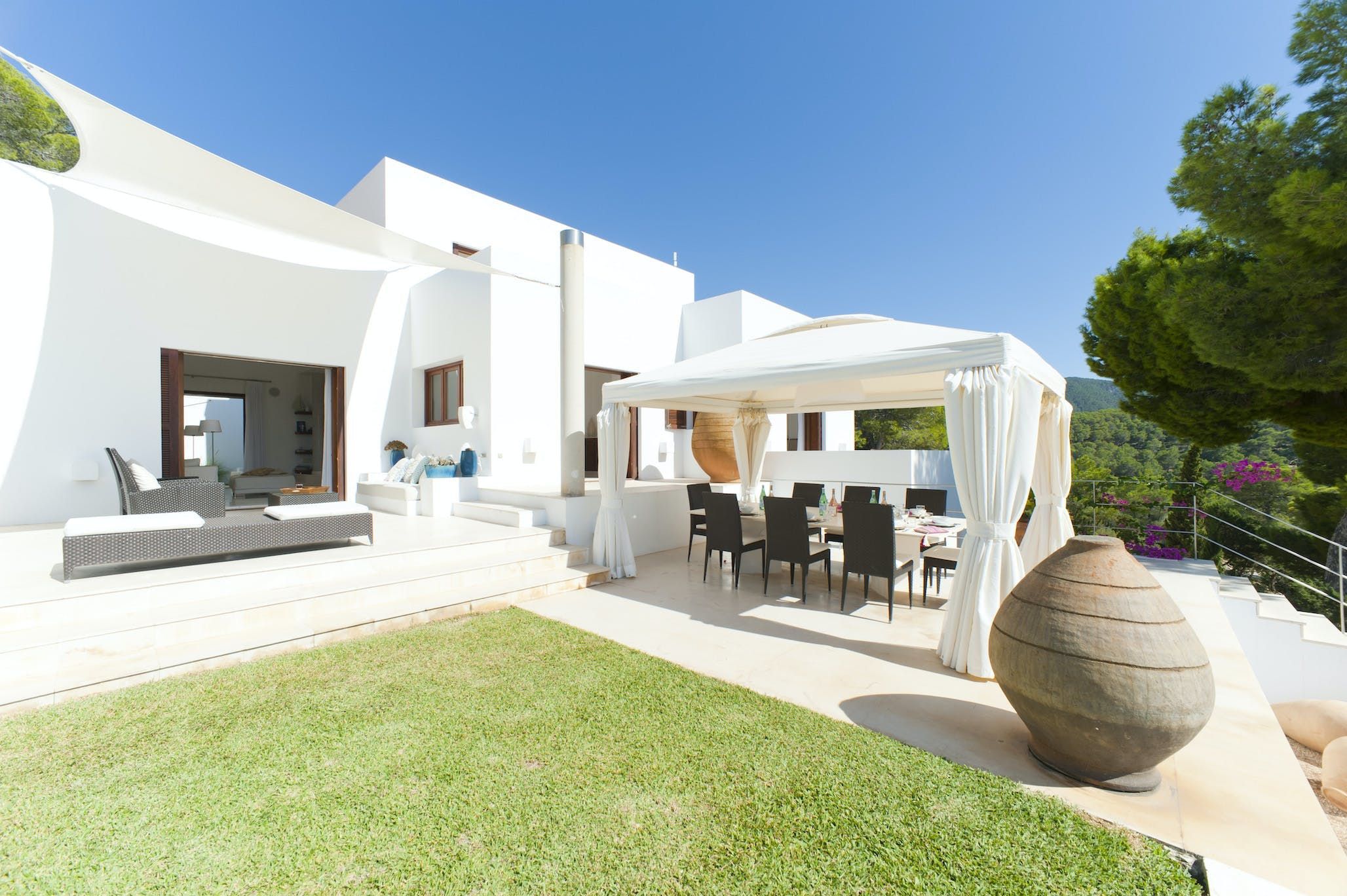 Surrounded by a luscious lawn and pine-covered hills, this white-washed home offers a peaceful retreat on the lively island of Ibiza. Wake up in one of the three buildings and look out at flourishing greenery and a hazy seascape – the perfect backdrop for all those hours you'll while away poolside.